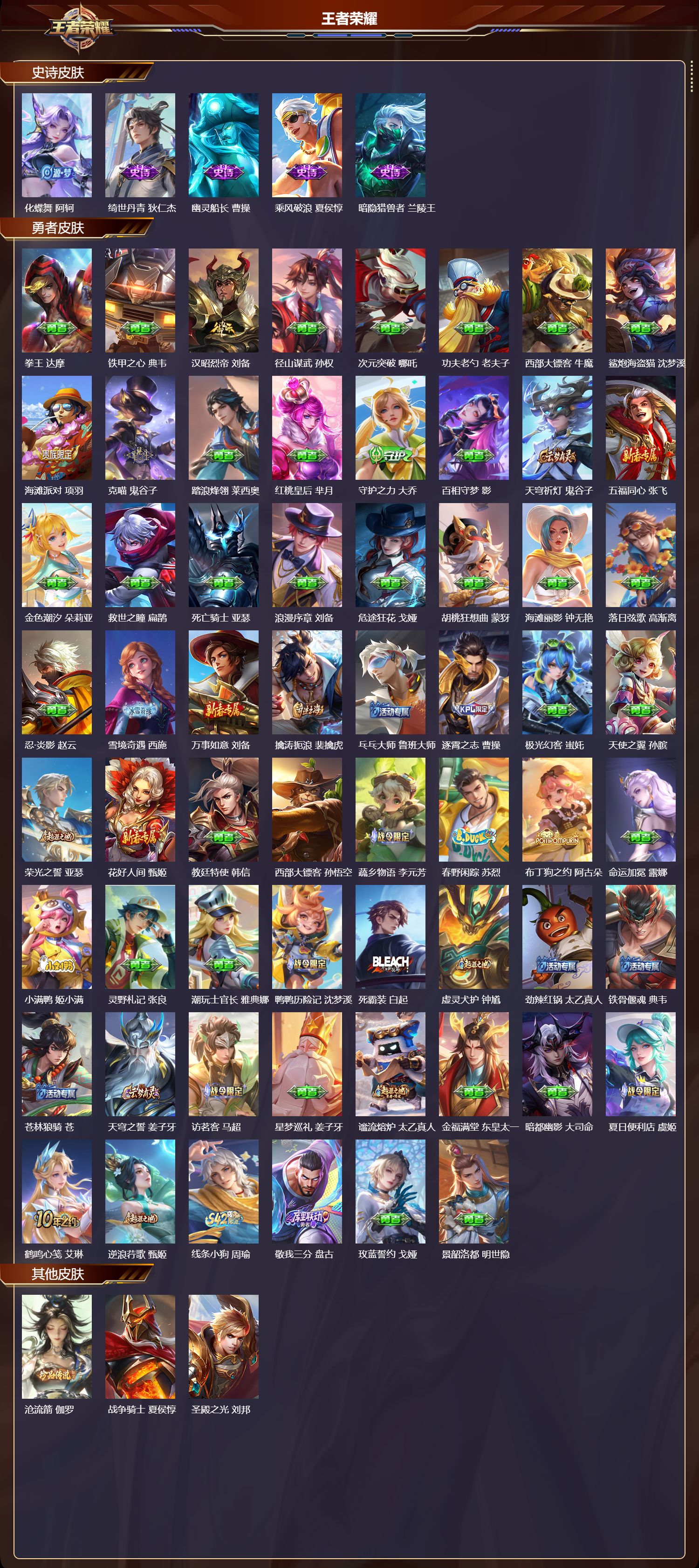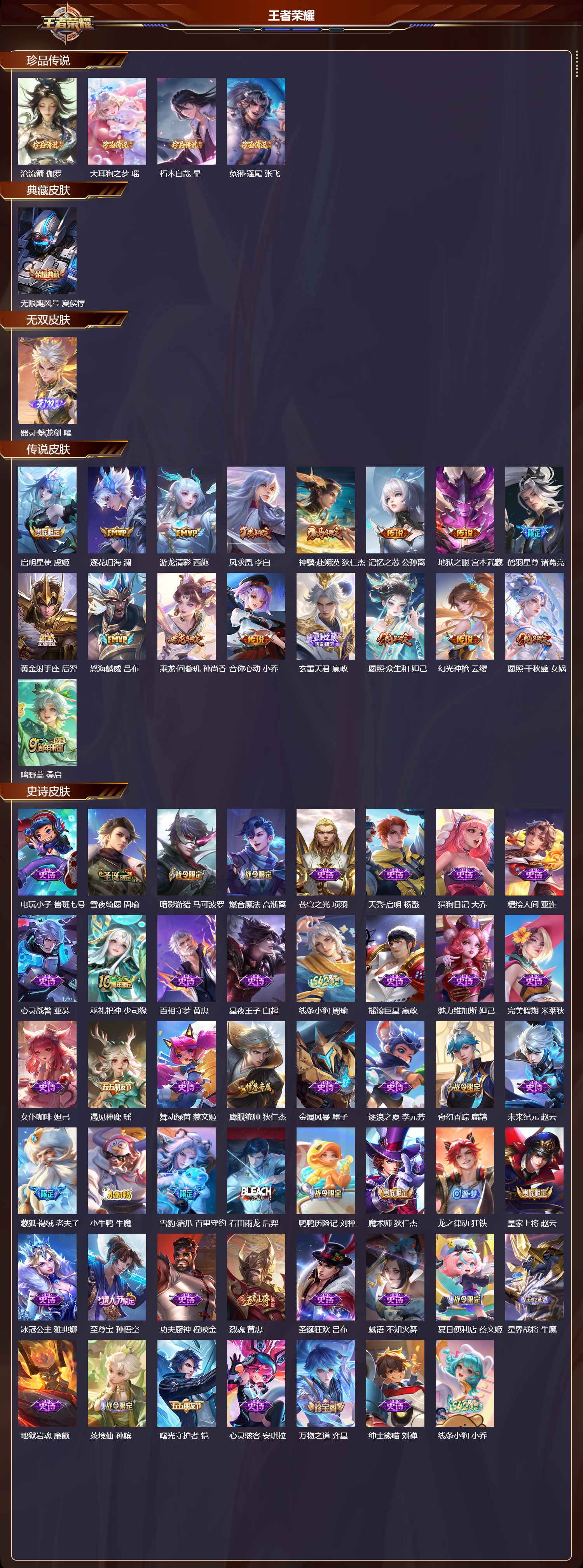 【52,史诗皮肤】电玩小子,鲁班七号,雪夜绮愿,周瑜,暗影游猎,马可波罗,燃音魔法,高渐离,苍穹之光,项羽,天秀·启明,杨戬,猫狗日记,大乔,糖绘人间,亚连,心灵战警,亚瑟,巫礼祀神,少司缘,百相守梦,黄忠,星夜王子,白起,线条小狗,周瑜,摇滚巨星,嬴政,魅力维加斯,妲己,完美假期,米莱狄,女仆咖啡,妲己,遇见神鹿,瑶,舞动绿茵,蔡文姬,鹰眼统帅,狄仁杰,金属风暴,墨子,逐浪之夏,李元芳,奇幻香踪,扁鹊,未来纪元,赵云,藏狐·褐绒,老夫子,小牛鸭,牛魔,雪豹·霜爪,百里守约,石田雨龙,后羿,鸭鸭历险记,刘禅,魔术师,狄仁杰,龙之律动,狂铁,皇家上将,赵云,冰冠公主,雅典娜,至尊宝,孙悟空,功夫厨神,程咬金,烈魂,黄忠,圣诞狂欢,吕布,魅语,不知火舞,夏日便利店,蔡文姬,星界战将,牛魔,地狱岩魂,廉颇,茶境仙,孙膑,曙光守护者,铠,心灵骇客,安琪拉,万物之道,弈星,绅士熊喵,刘禅,线条小狗,小乔,化蝶舞,阿轲,绮世丹青,狄仁杰,幽灵船长,曹操,乘风破浪,夏侯惇,暗隐猎兽者,兰陵王,