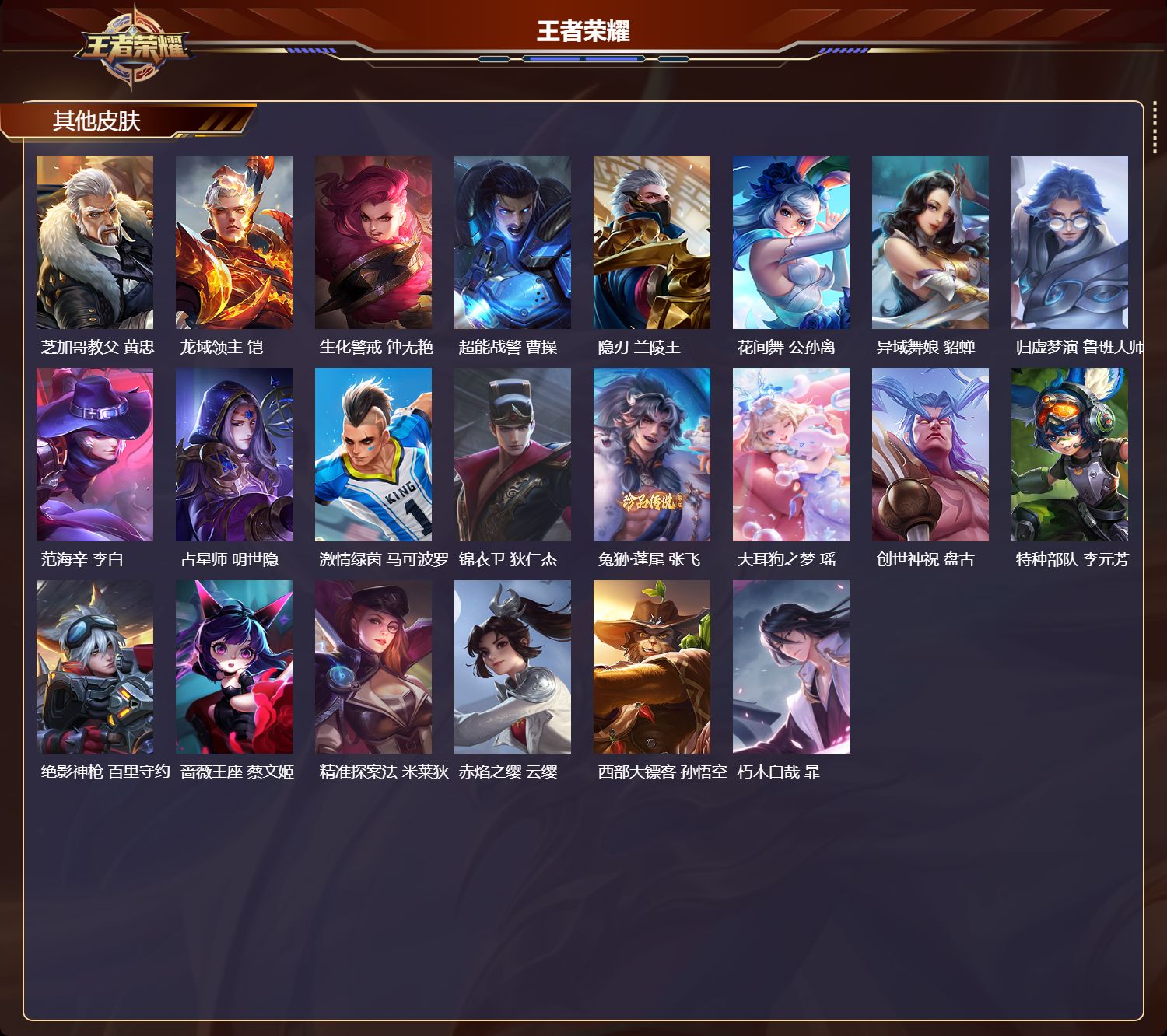 【25,其他皮肤】沧流箭,伽罗,战争骑士,夏侯惇,圣殿之光,刘邦,芝加哥教父,黄忠,龙域领主,铠,生化警戒,钟无艳,超能战警,曹操,隐刃,兰陵王,花间舞,公孙离,异域舞娘,貂蝉,归虚梦演,鲁班大师,范海辛,李白,占星师,明世隐,激情绿茵,马可波罗,锦衣卫,狄仁杰,兔狲·蓬尾,张飞,大耳狗之梦,瑶,创世神祝,盘古,特种部队,李元芳,绝影神枪,百里守约,蔷薇王座,蔡文姬,精准探案法,米莱狄,赤焰之缨,云缨,西部大镖客,孙悟空,朽木白哉,暃,