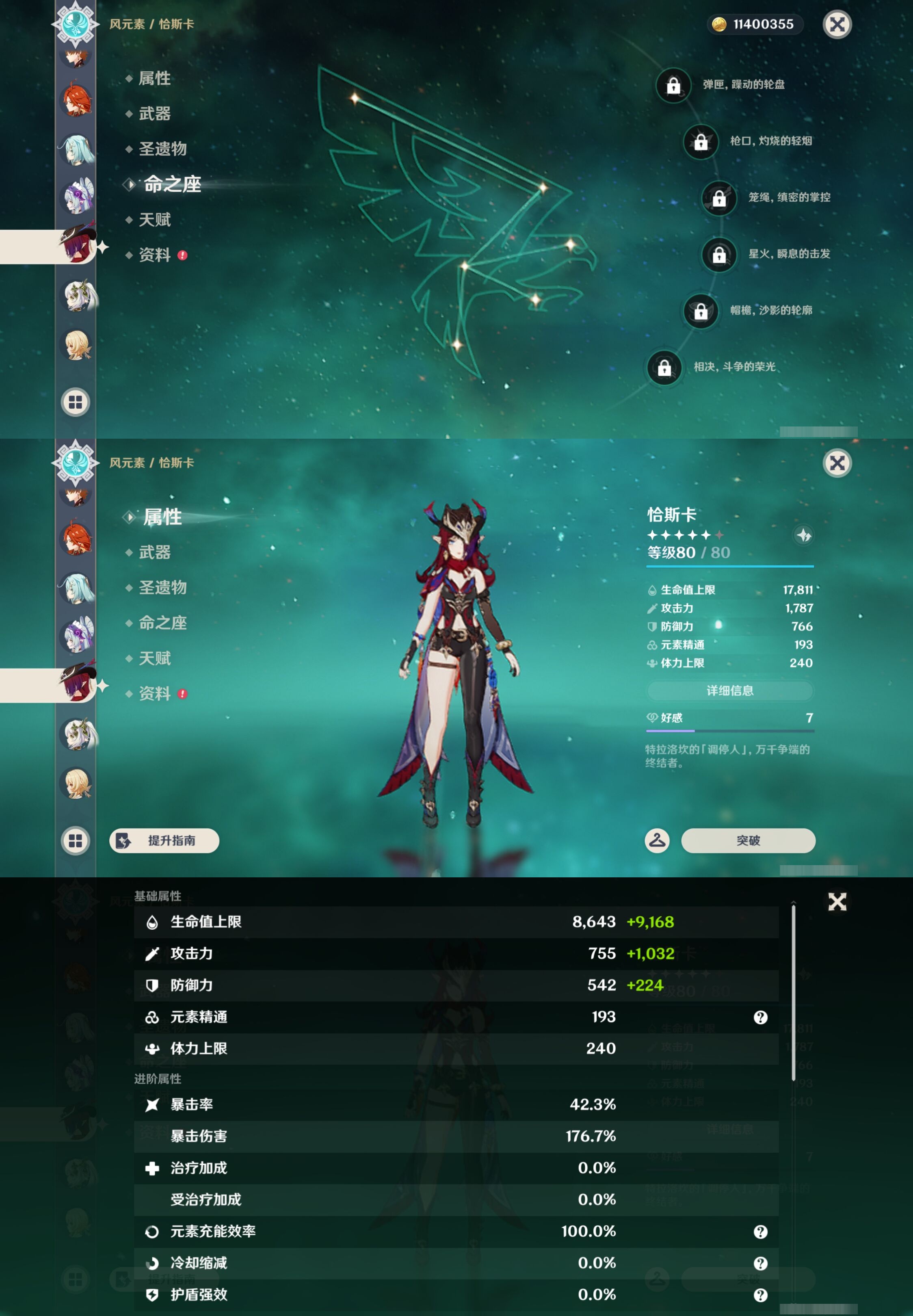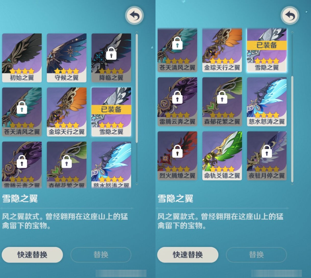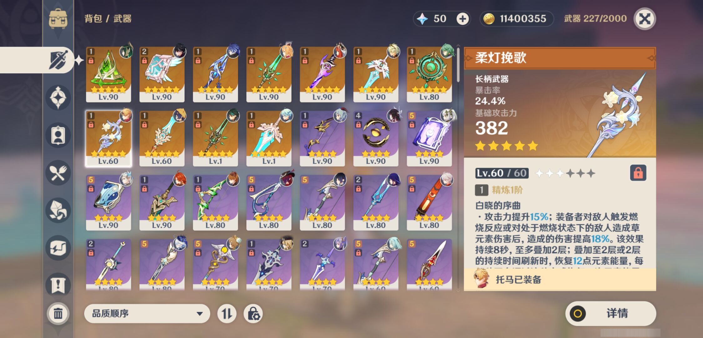 【11个五星武器】,精2天空之卷,精1柔灯挽歌,精1真语秘匣,精1天空之脊,精1血染荒城,精1和璞鸢,精1和璞鸢,精1天空之傲,精1雾切之回光,精1天空之刃,精1碧落之珑,5套,