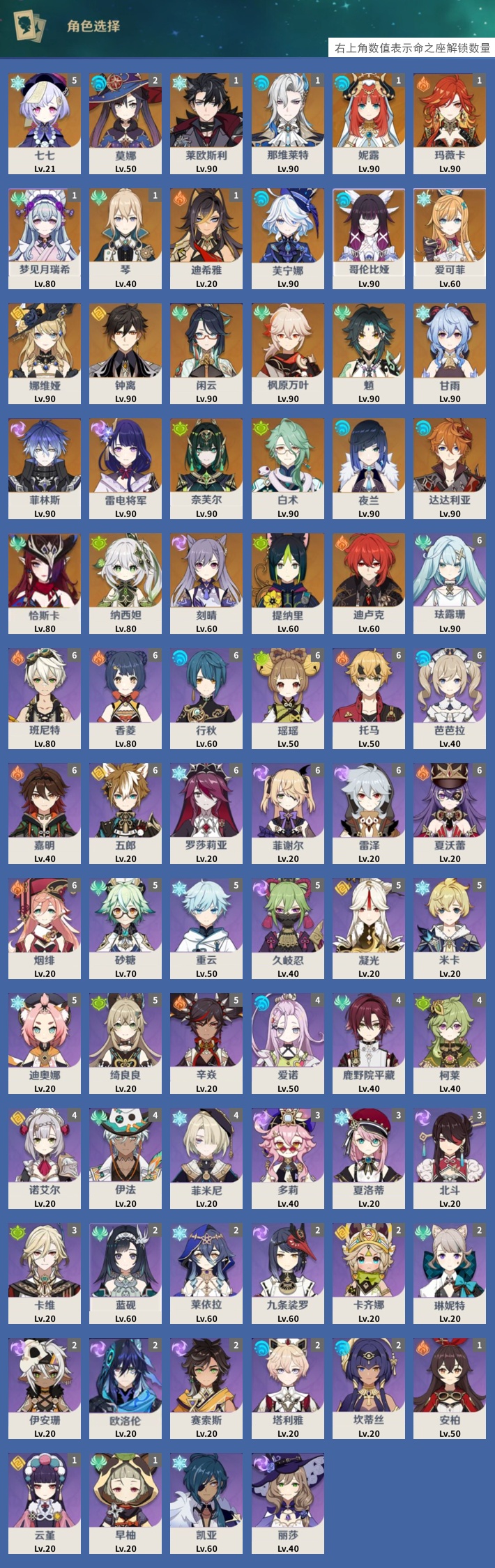 【29个五星角色】,5命七七,2命莫娜,1命莱欧斯利,1命那维莱特,1命妮露,1命玛薇卡,1命梦见月瑞希,1命琴,1命迪希雅,0命芙宁娜,0命哥伦比娅,0命爱可菲,0命娜维娅,0命钟离,0命闲云,0命枫原万叶,0命魈,0命甘雨,0命菲林斯,0命雷电将军,0命奈芙尔,0命白术,0命夜兰,0命达达利亚,0命恰斯卡,0命纳西妲,0命刻晴,0命提纳里,0命迪卢克,