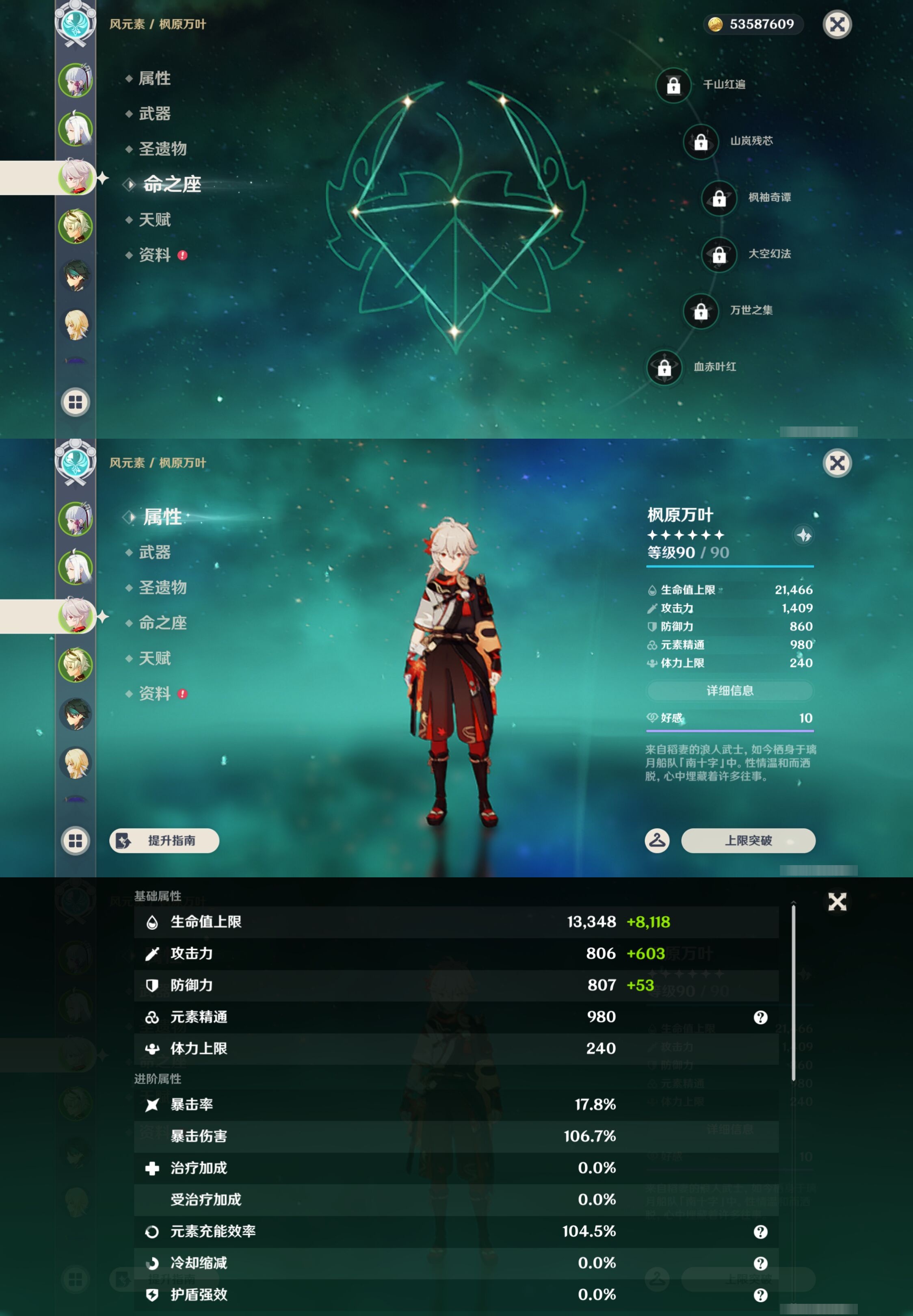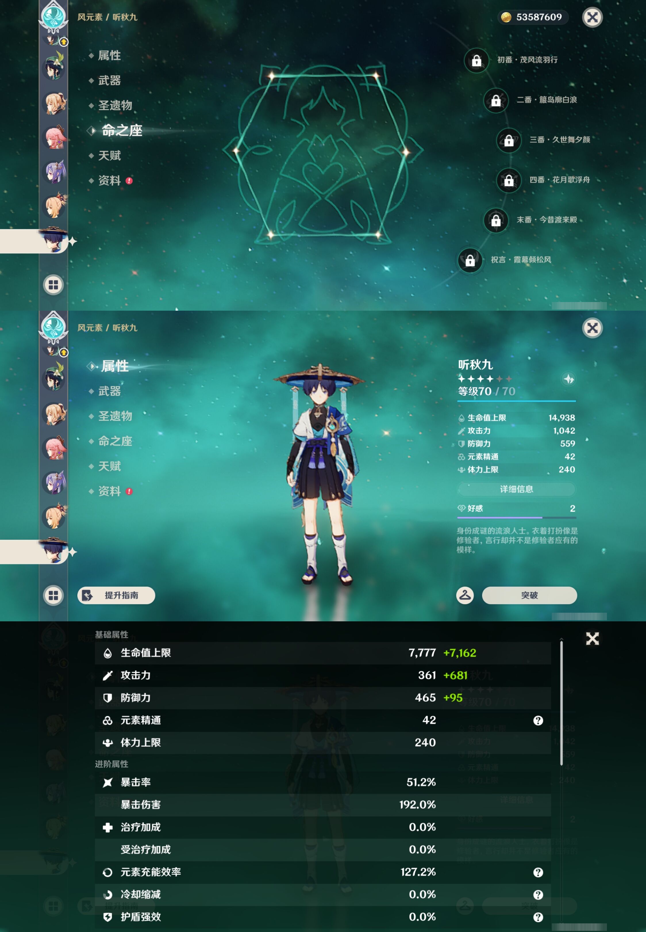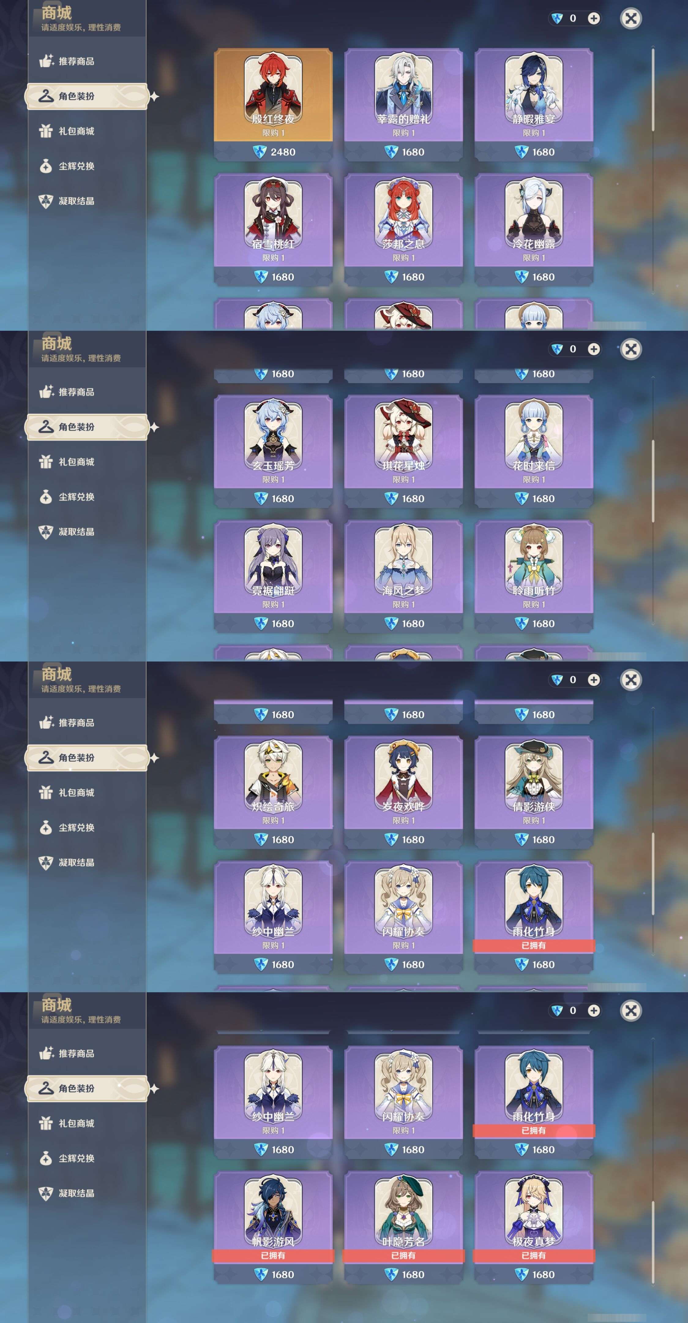 PX_2534772-,邮箱不出售,,冒险等级60级,女主,42黄,24个五星角色,9个五星武器,纠缠之源0--原石85--圣遗物1419--【时装】,帆影游风,雨化竹身,极夜真梦,叶隐芳名,