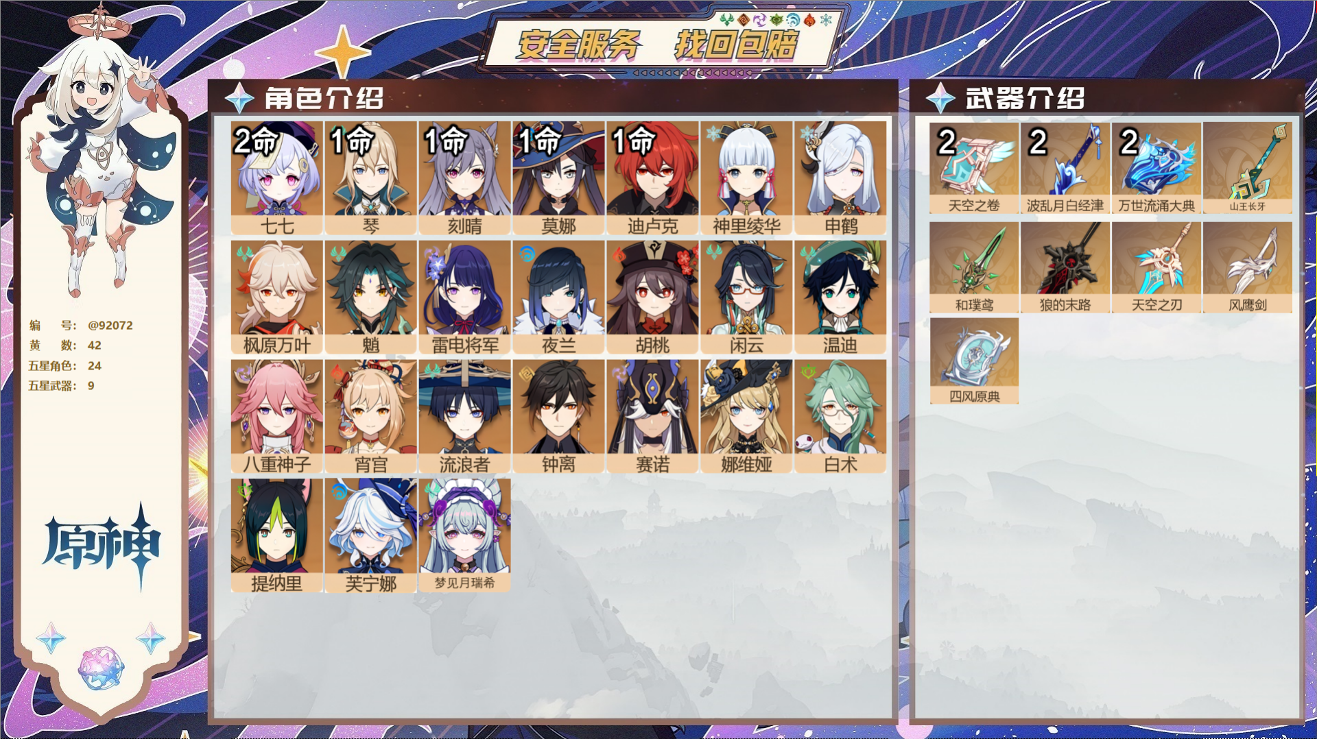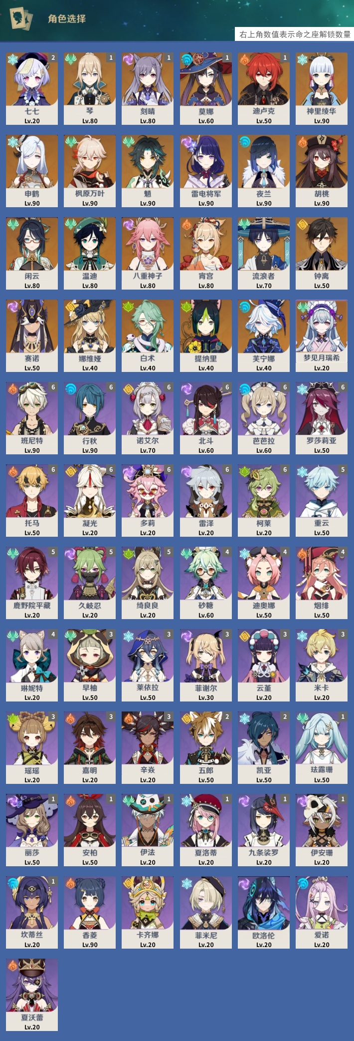 【24个五星角色】,2命七七,1命琴,1命刻晴,1命莫娜,1命迪卢克,0命神里绫华,0命申鹤,0命枫原万叶,0命魈,0命雷电将军,0命夜兰,0命胡桃,0命闲云,0命温迪,0命八重神子,0命宵宫,0命流浪者,0命钟离,0命赛诺,0命娜维娅,0命白术,0命提纳里,0命芙宁娜,0命梦见月瑞希,