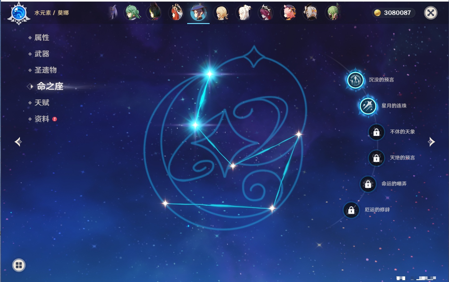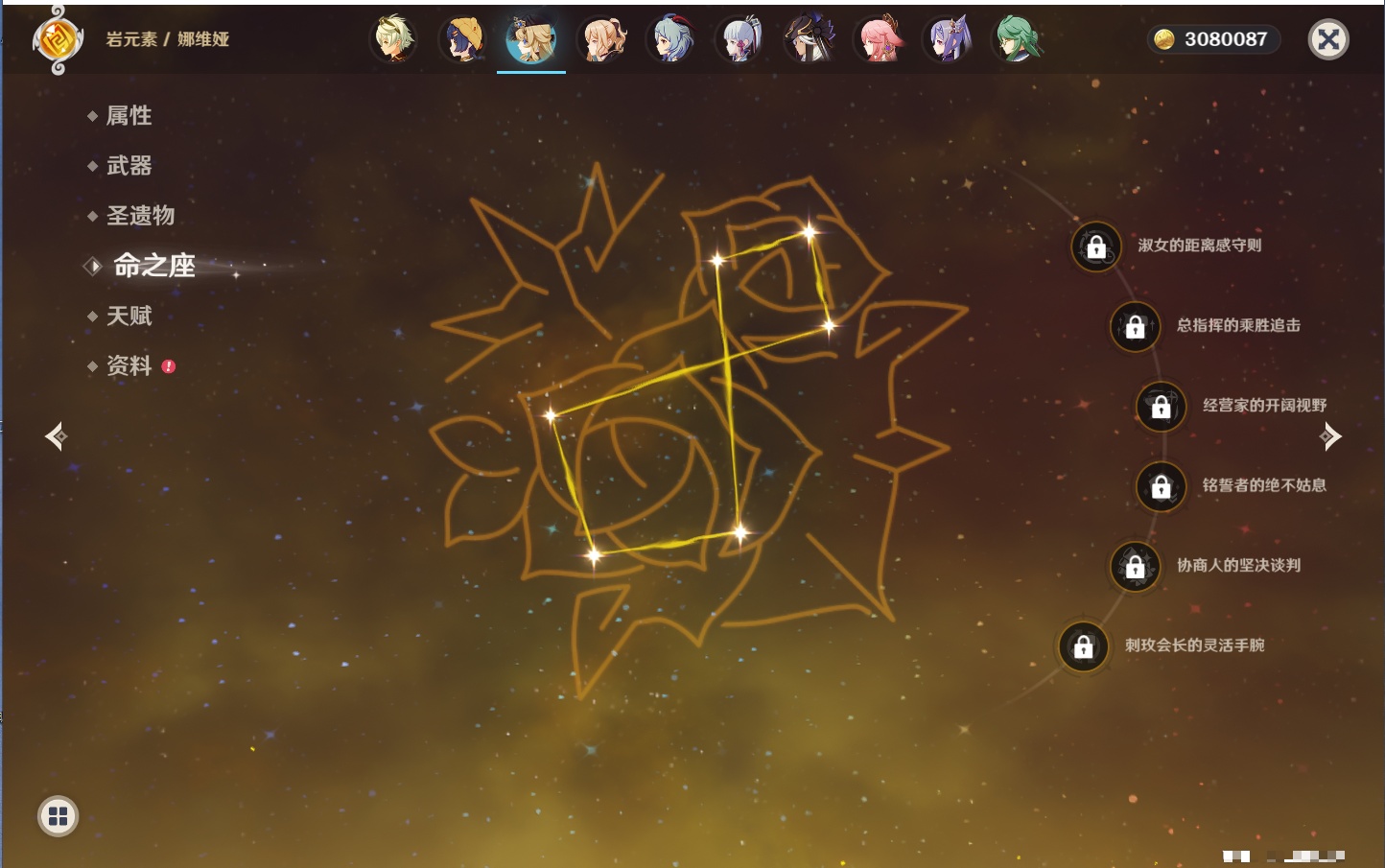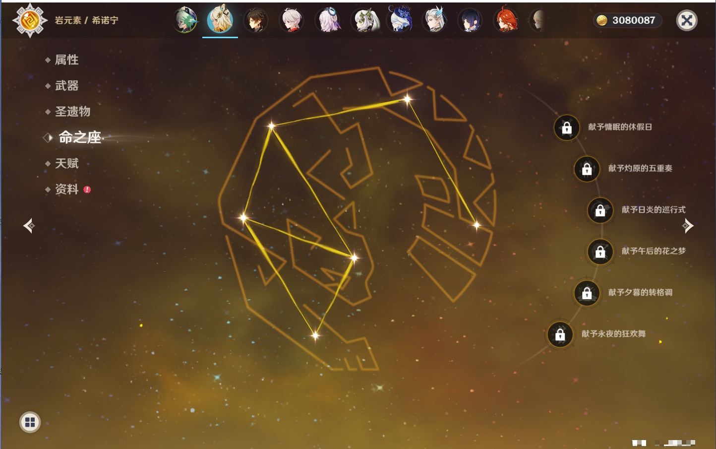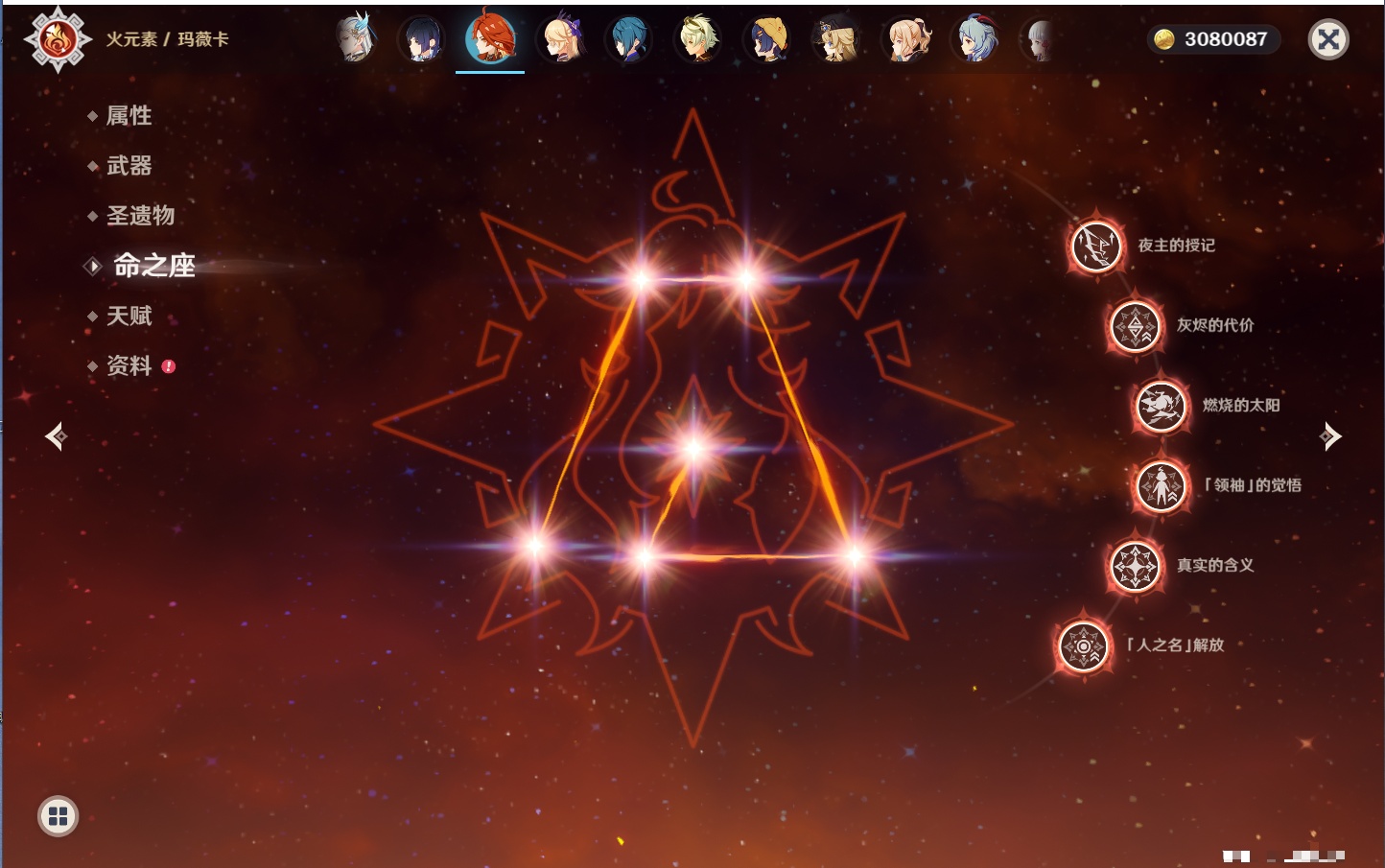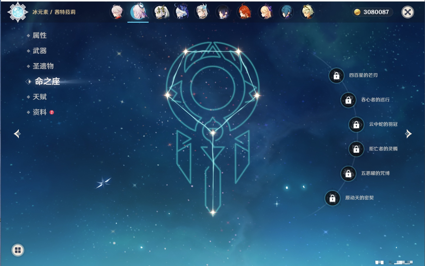 【26个五星角色】,满命玛薇卡,4命刻晴,3命琴,2命赛诺,2命神里绫华,2命七七,2命莫娜,2命迪卢克,2命哥伦比娅,1命那维莱特,1命提纳里,0命芙宁娜,0命白术,0命迪希雅,0命纳西妲,0命妮露,0命夜兰,0命八重神子,0命枫原万叶,0命钟离,0命甘雨,0命菲林斯,0命伊涅芙,0命希诺宁,0命茜特菈莉,0命娜维娅,