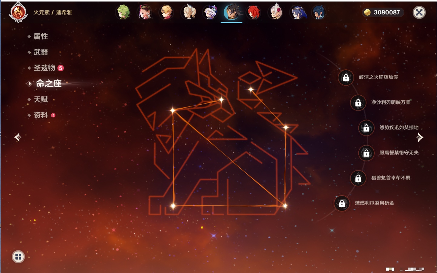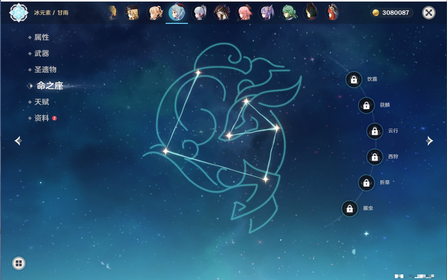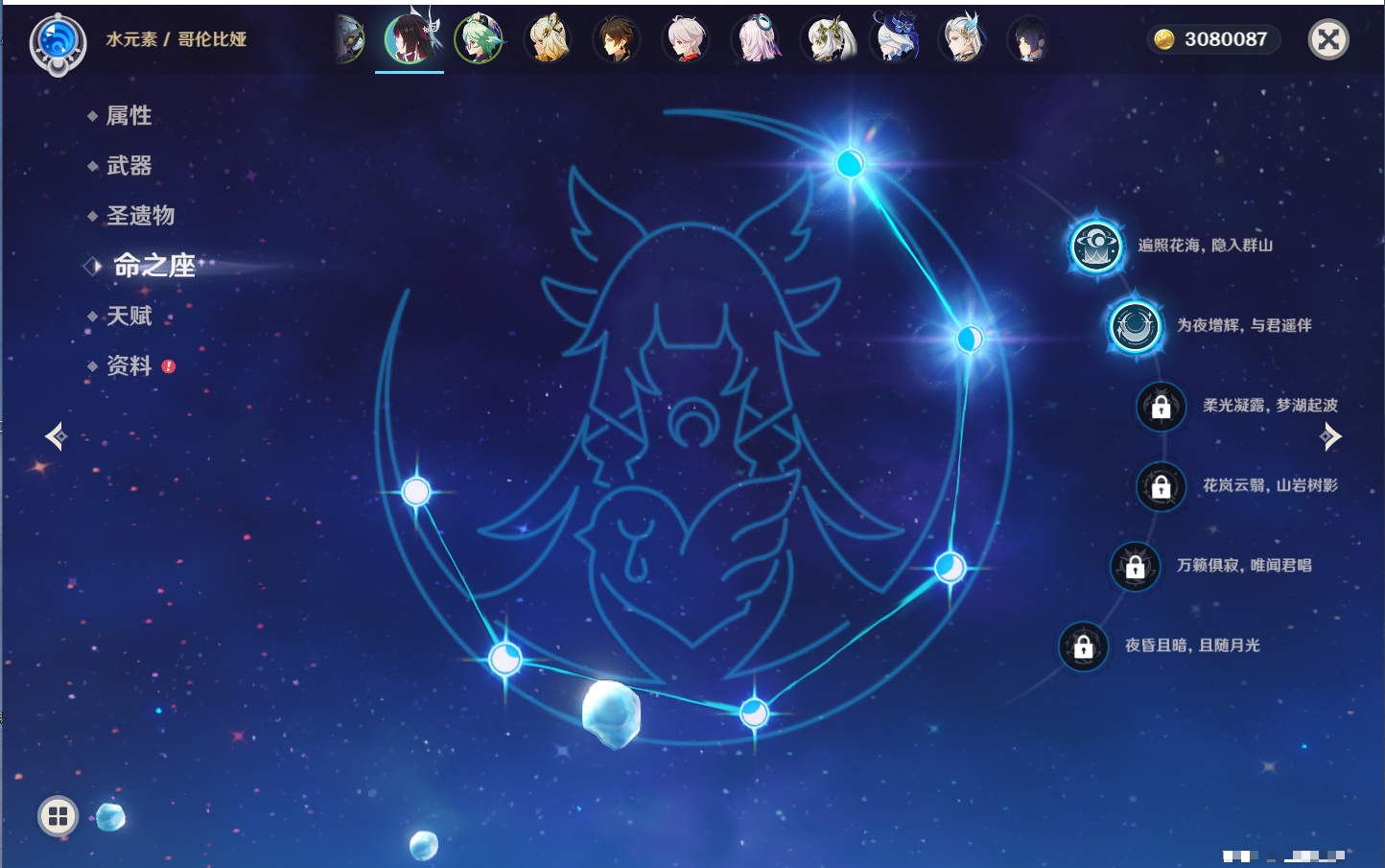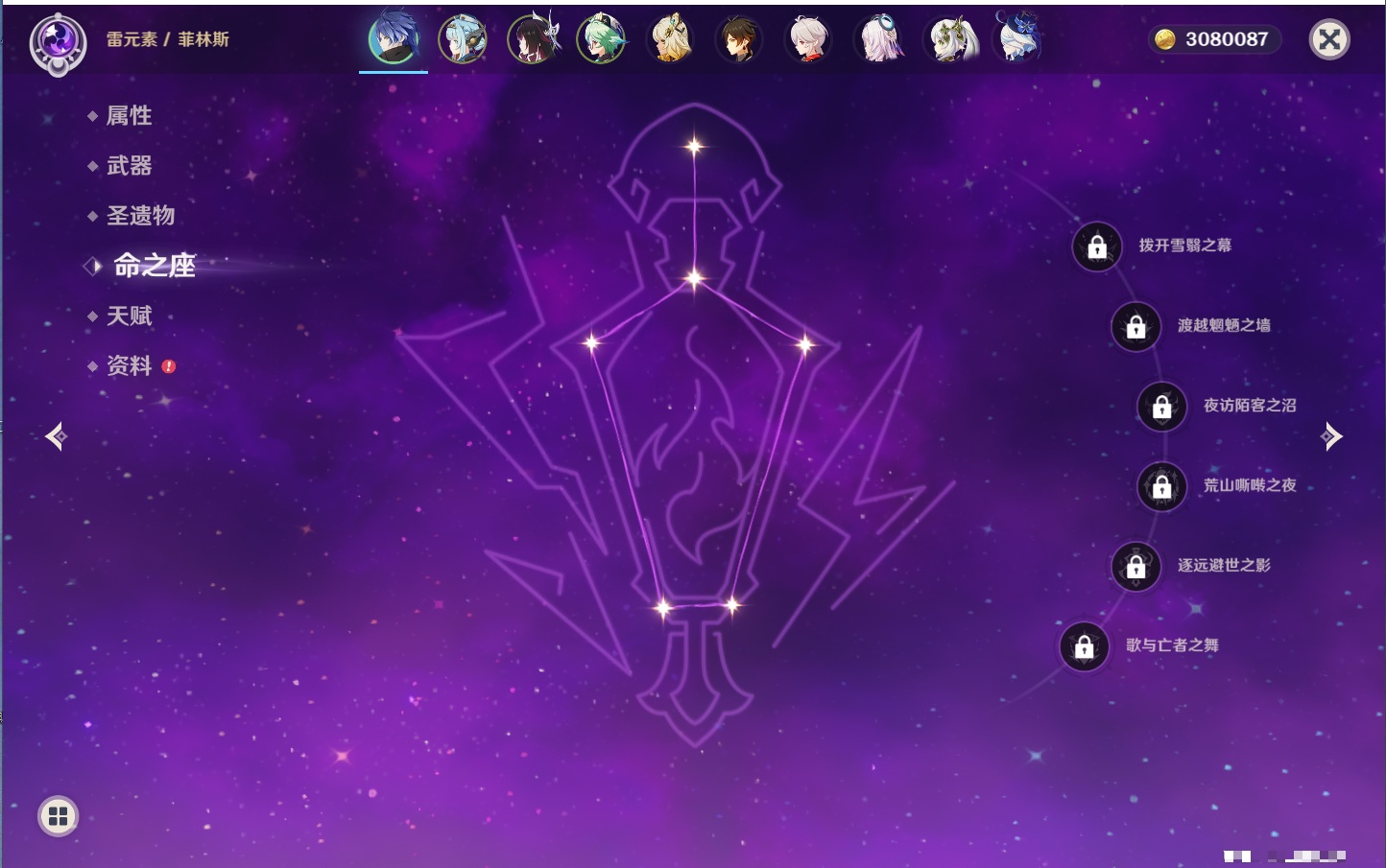 【26个五星角色】,满命玛薇卡,4命刻晴,3命琴,2命赛诺,2命神里绫华,2命七七,2命莫娜,2命迪卢克,2命哥伦比娅,1命那维莱特,1命提纳里,0命芙宁娜,0命白术,0命迪希雅,0命纳西妲,0命妮露,0命夜兰,0命八重神子,0命枫原万叶,0命钟离,0命甘雨,0命菲林斯,0命伊涅芙,0命希诺宁,0命茜特菈莉,0命娜维娅,