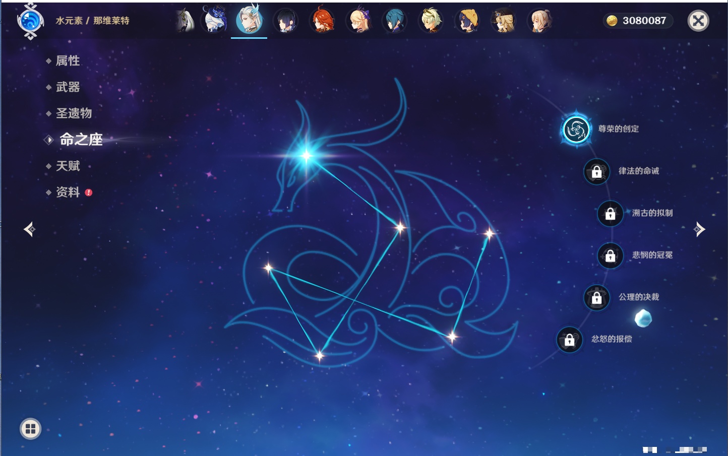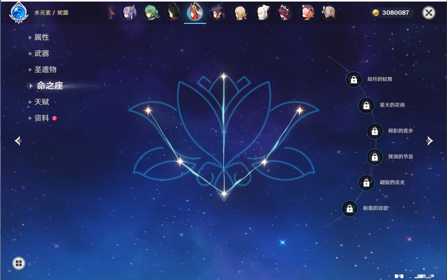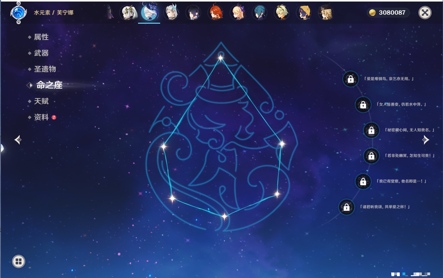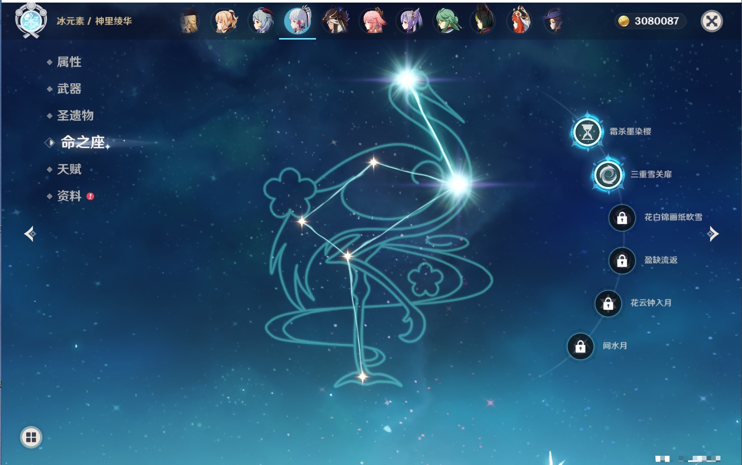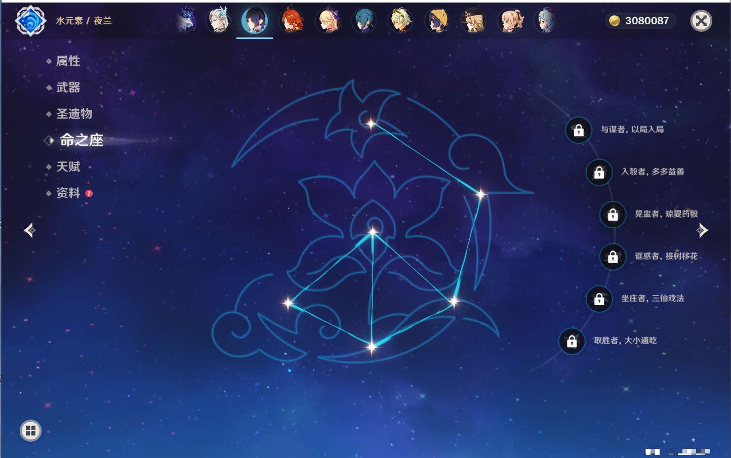 【26个五星角色】,满命玛薇卡,4命刻晴,3命琴,2命赛诺,2命神里绫华,2命七七,2命莫娜,2命迪卢克,2命哥伦比娅,1命那维莱特,1命提纳里,0命芙宁娜,0命白术,0命迪希雅,0命纳西妲,0命妮露,0命夜兰,0命八重神子,0命枫原万叶,0命钟离,0命甘雨,0命菲林斯,0命伊涅芙,0命希诺宁,0命茜特菈莉,0命娜维娅,