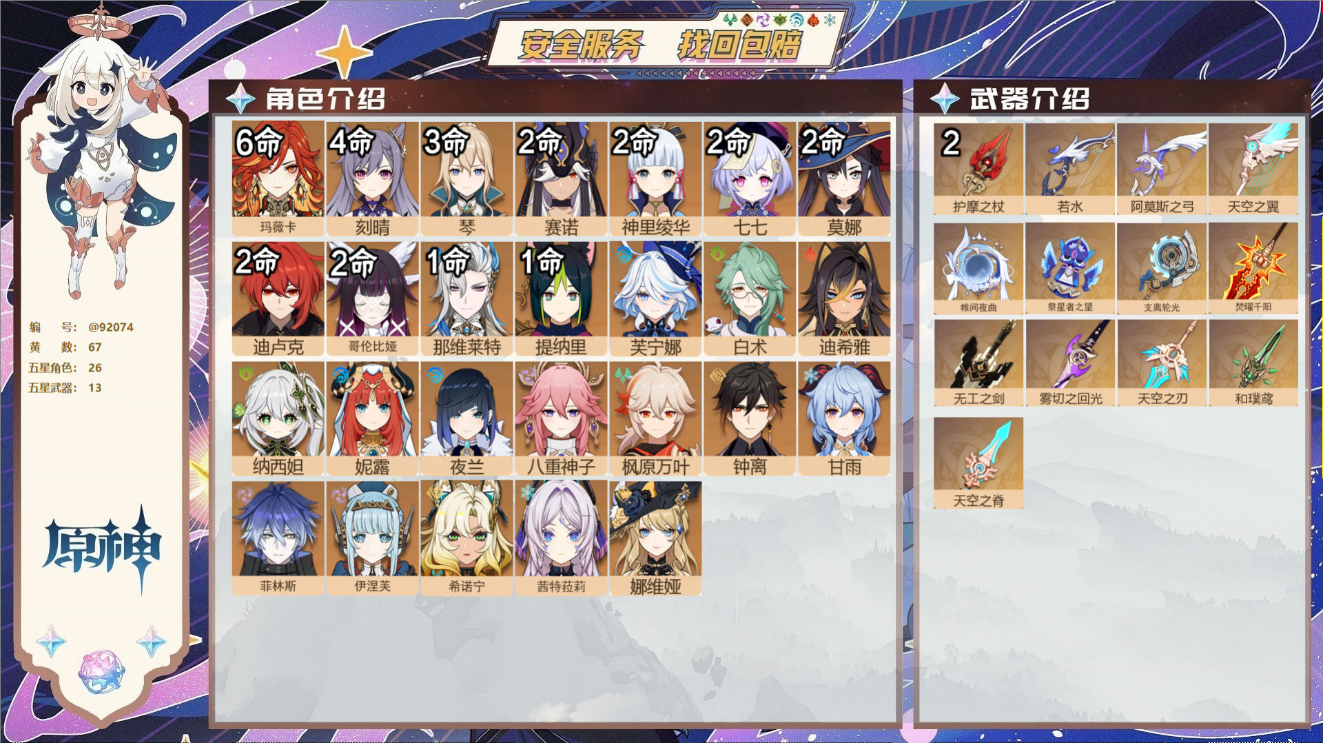 PX_2534860-,送未实名邮箱,,冒险等级60级,女主,67黄,26个五星角色,13个五星武器,纠缠之源--原石1399--圣遗物516--【时装】,聆雨听竹,岁夜欢哗,倩影游侠,雨化竹身,帆影游风,叶隐芳名,