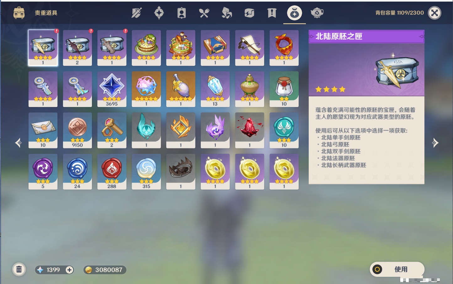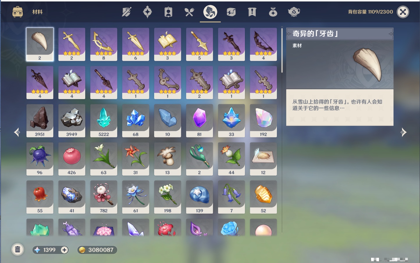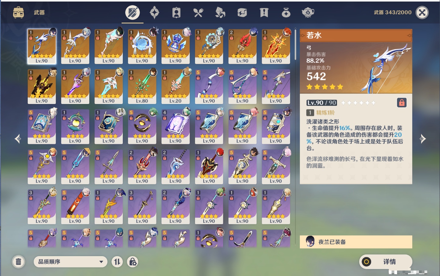 【13个五星武器】,精2护摩之杖,精1若水,精1阿莫斯之弓,精1天空之翼,精1帷间夜曲,精1祭星者之望,精1支离轮光,精1焚曜千阳,精1无工之剑,精1雾切之回光,精1天空之刃,精1和璞鸢,精1天空之脊,