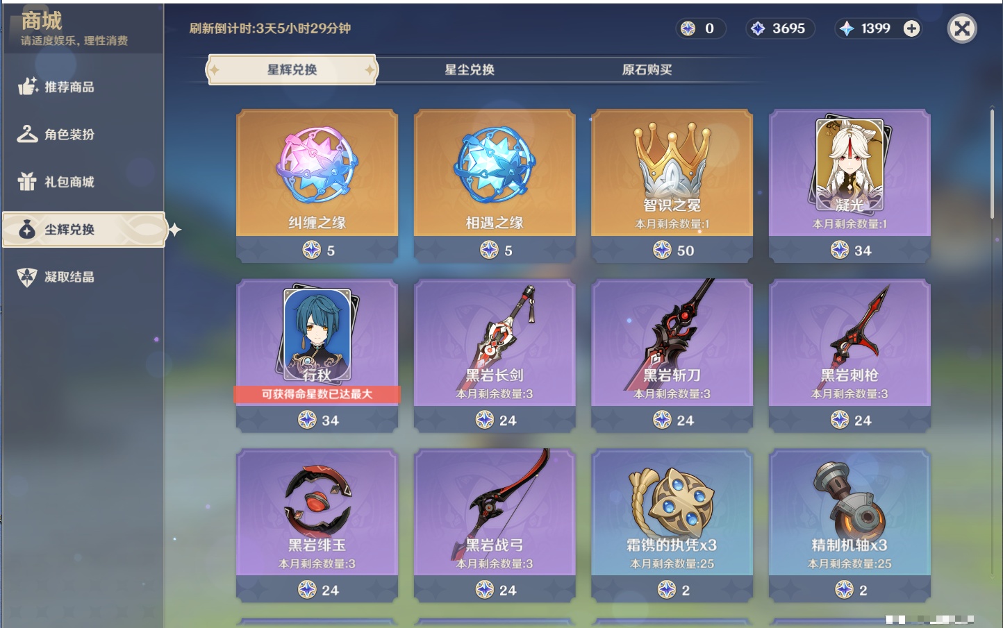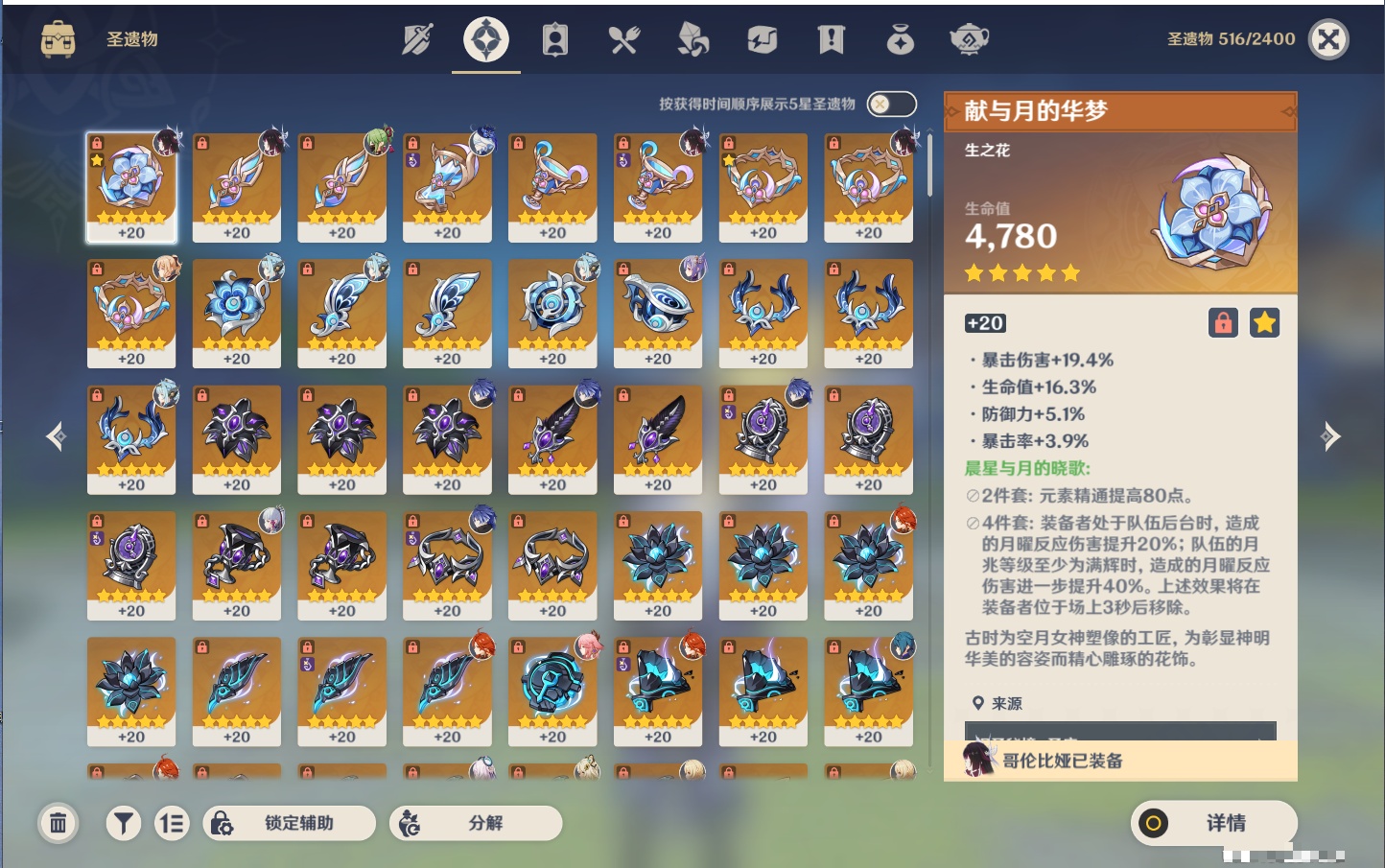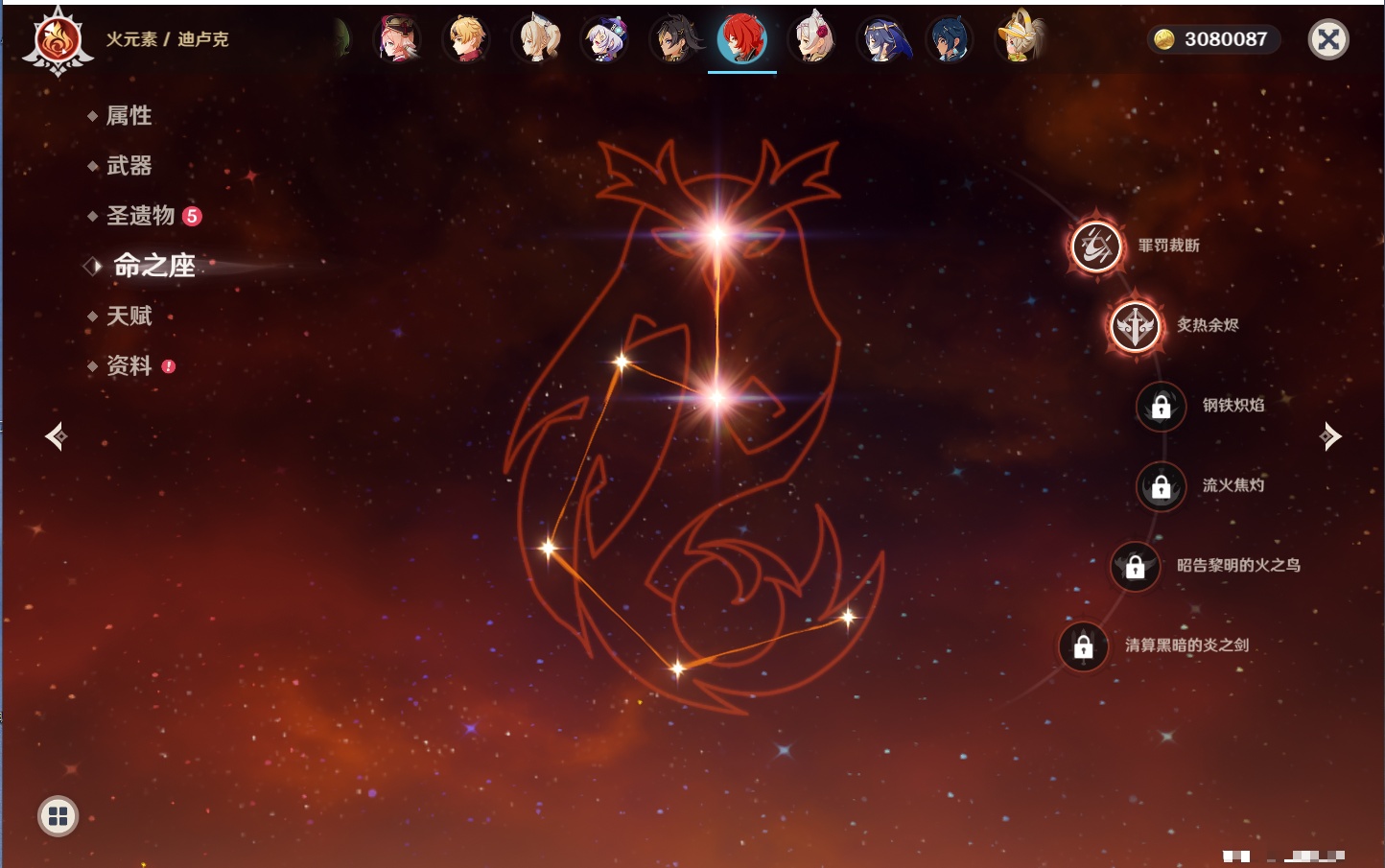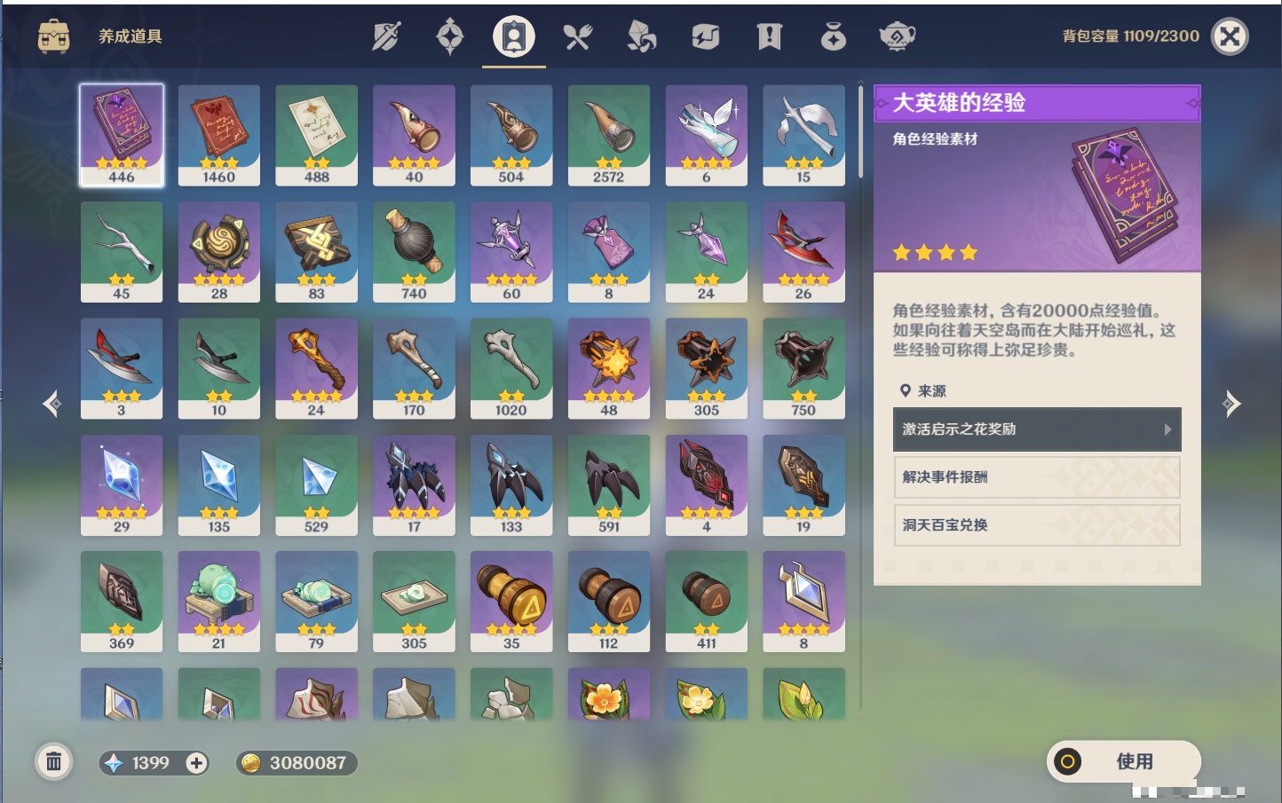 【13个五星武器】,精2护摩之杖,精1若水,精1阿莫斯之弓,精1天空之翼,精1帷间夜曲,精1祭星者之望,精1支离轮光,精1焚曜千阳,精1无工之剑,精1雾切之回光,精1天空之刃,精1和璞鸢,精1天空之脊,