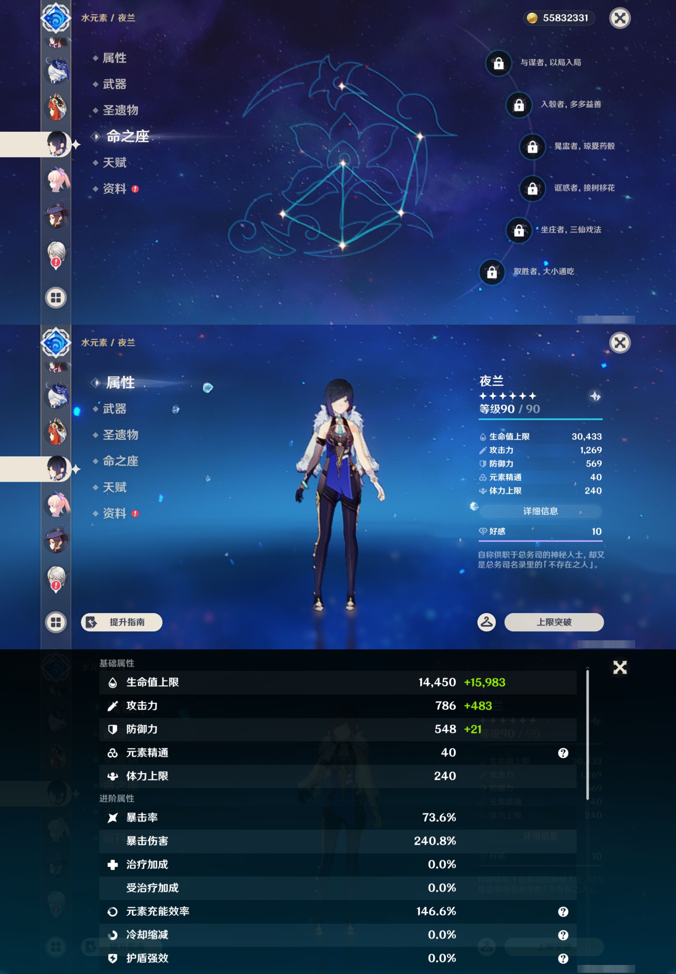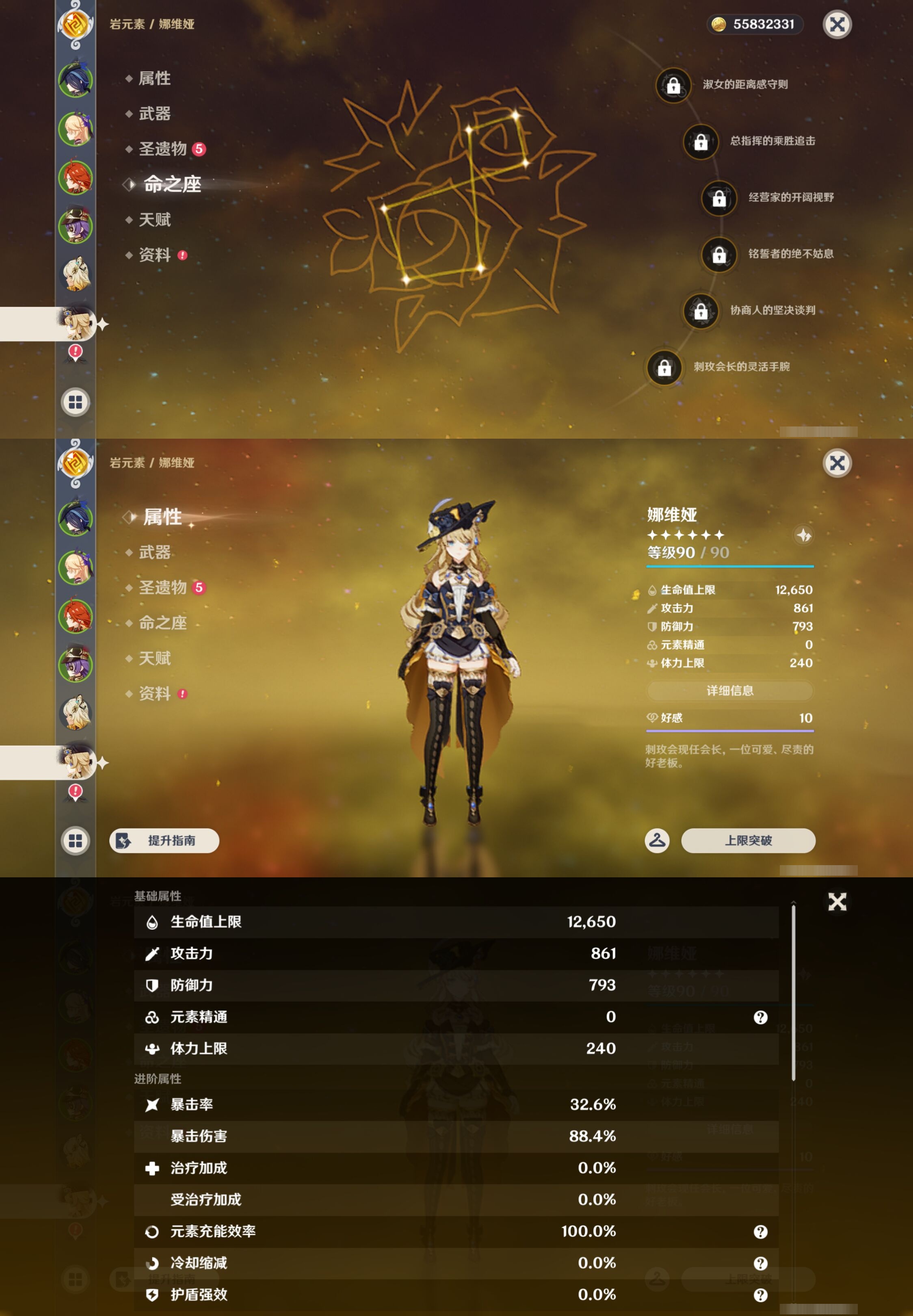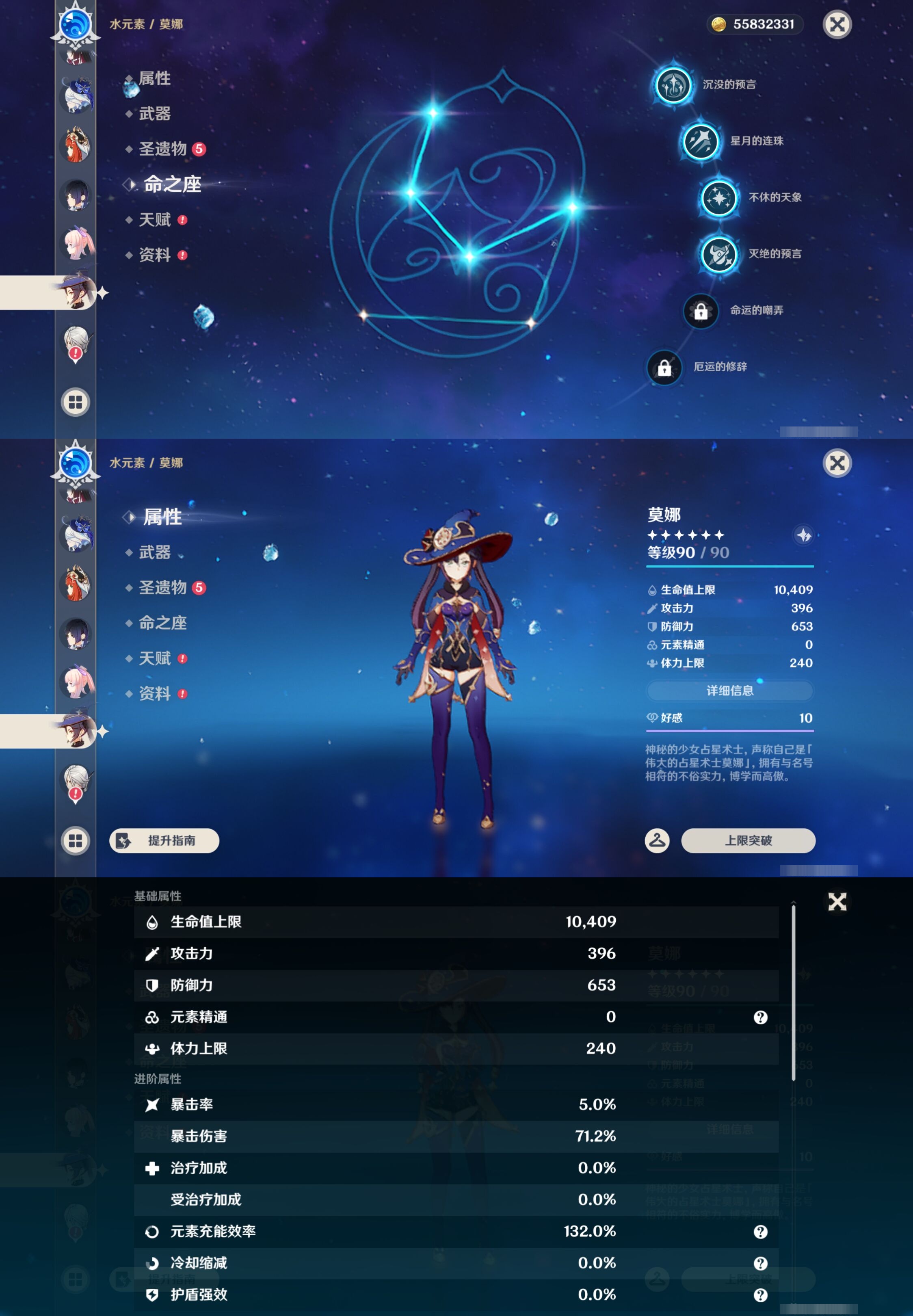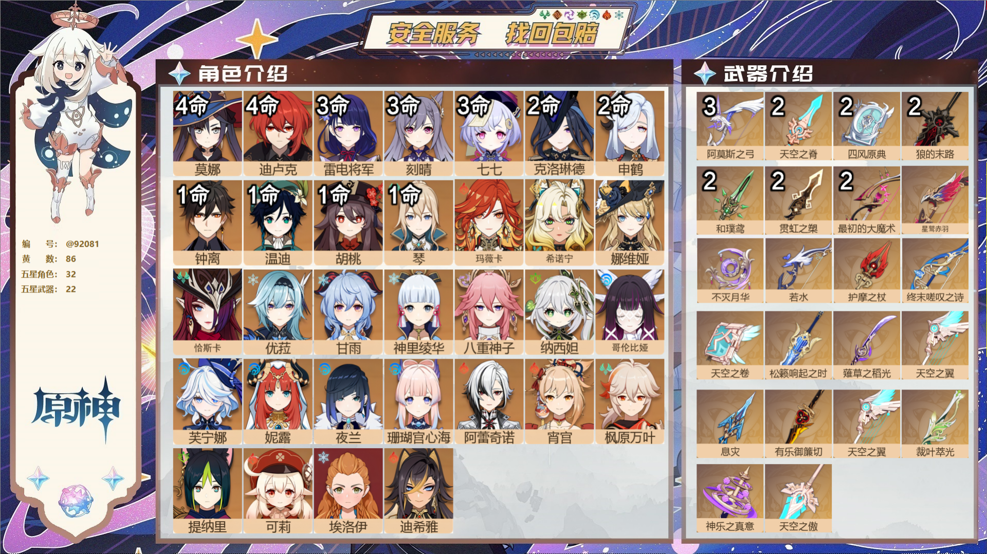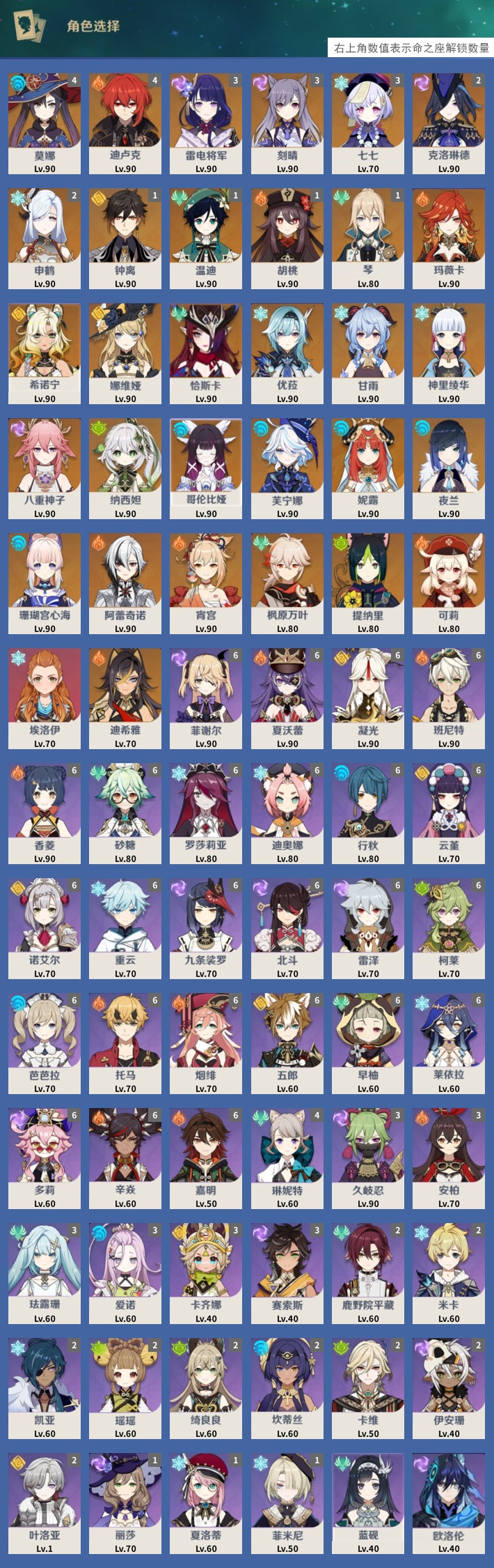 【32个五星角色】,4命莫娜,4命迪卢克,3命雷电将军,3命刻晴,3命七七,2命克洛琳德,2命申鹤,1命钟离,1命温迪,1命胡桃,1命琴,0命玛薇卡,0命希诺宁,0命娜维娅,0命恰斯卡,0命优菈,0命甘雨,0命神里绫华,0命八重神子,0命纳西妲,0命哥伦比娅,0命芙宁娜,0命妮露,0命夜兰,0命珊瑚宫心海,0命阿蕾奇诺,0命宵宫,0命枫原万叶,0命提纳里,0命可莉,0命埃洛伊,0命迪希雅,