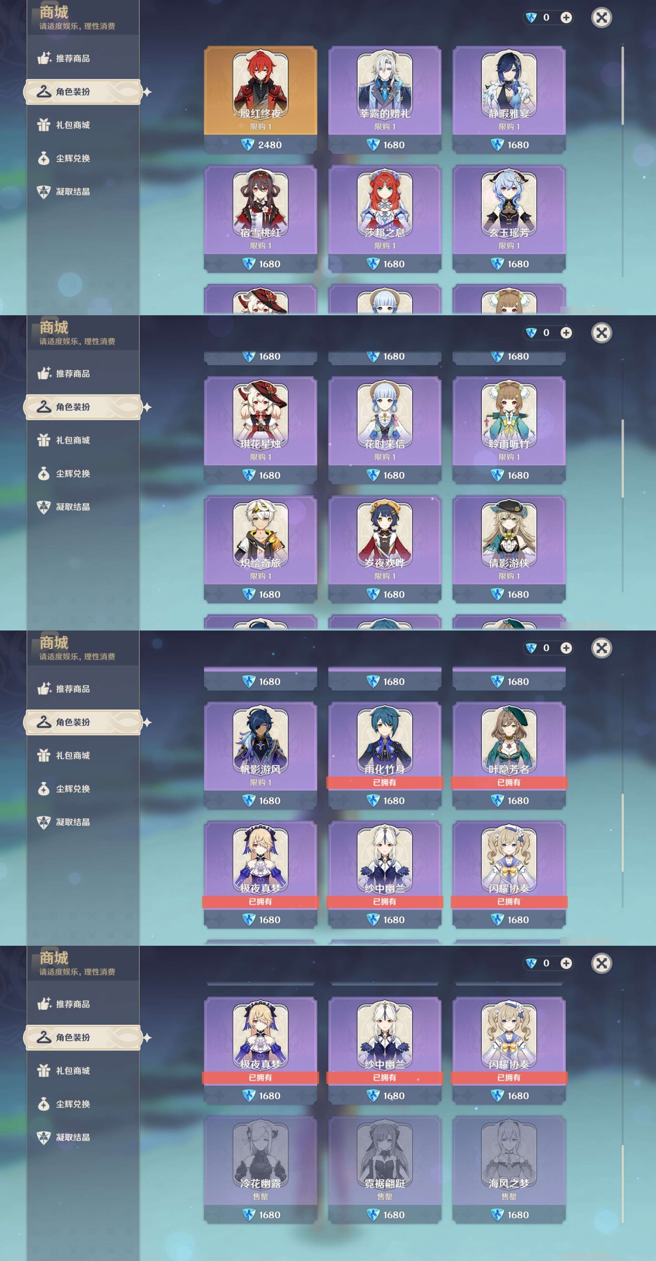 【时装】,海风之梦,闪耀协奏,冷花幽露,极夜真梦,霓裾翩跹,雨化竹身,叶隐芳名,纱中幽兰,