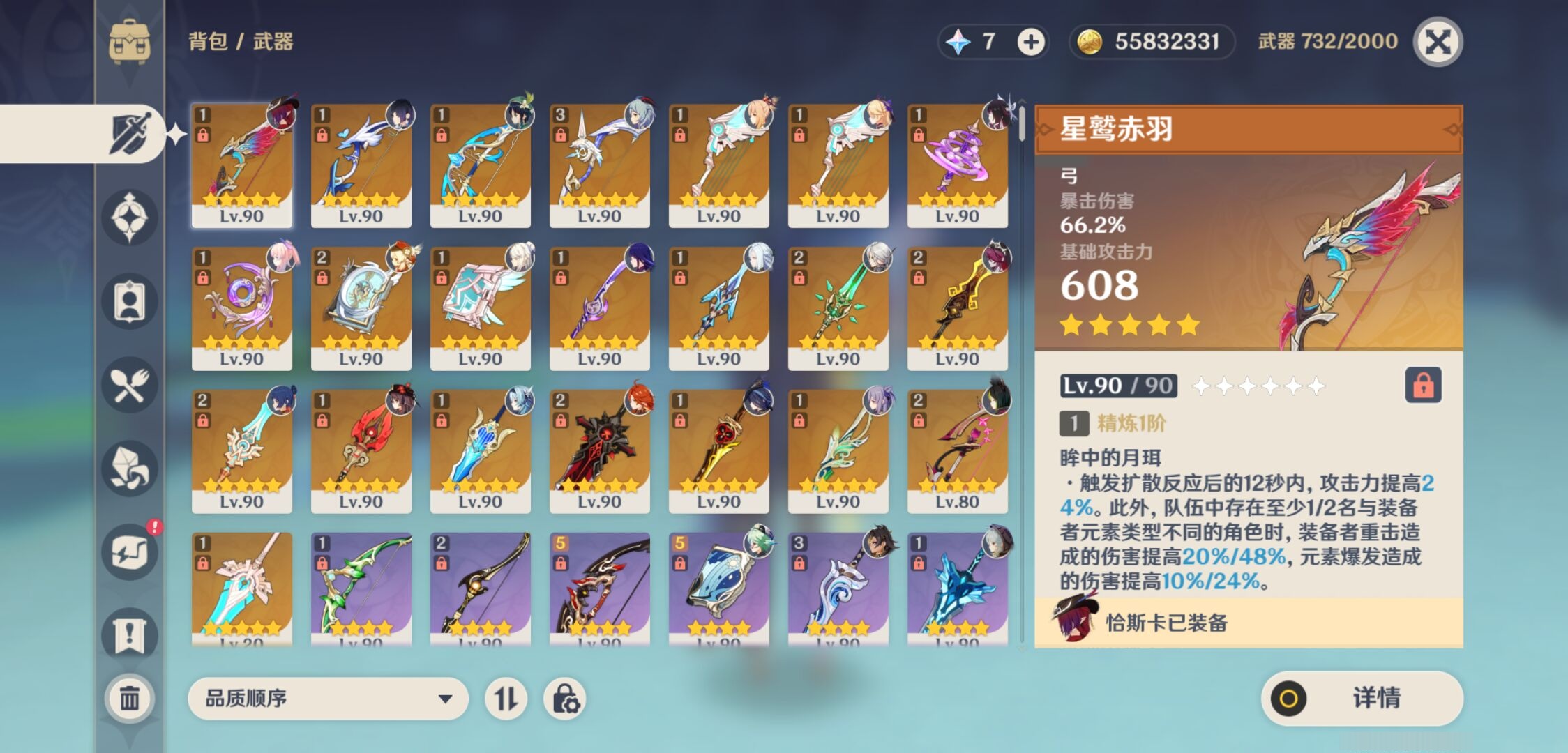 【22个五星武器】,精3阿莫斯之弓,精2天空之脊,精2四风原典,精2狼的末路,精2和璞鸢,精2贯虹之槊,精2最初的大魔术,精1星鹫赤羽,精1不灭月华,精1若水,精1护摩之杖,精1终末嗟叹之诗,精1天空之卷,精1松籁响起之时,精1薙草之稻光,精1天空之翼,精1息灾,精1有乐御簾切,精1天空之翼,精1裁叶萃光,精1神乐之真意,精1天空之傲,8套,