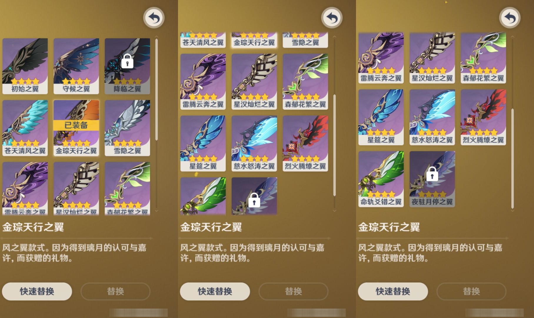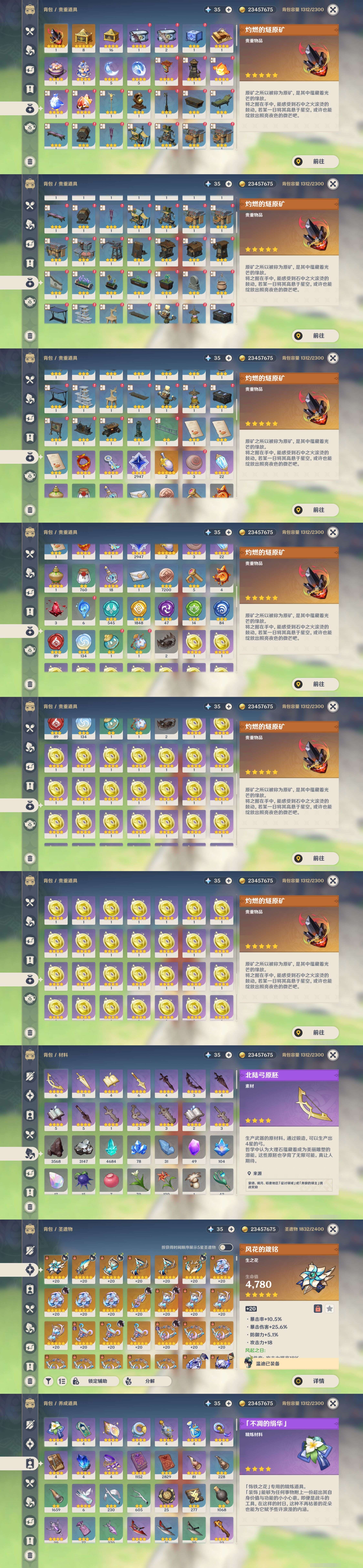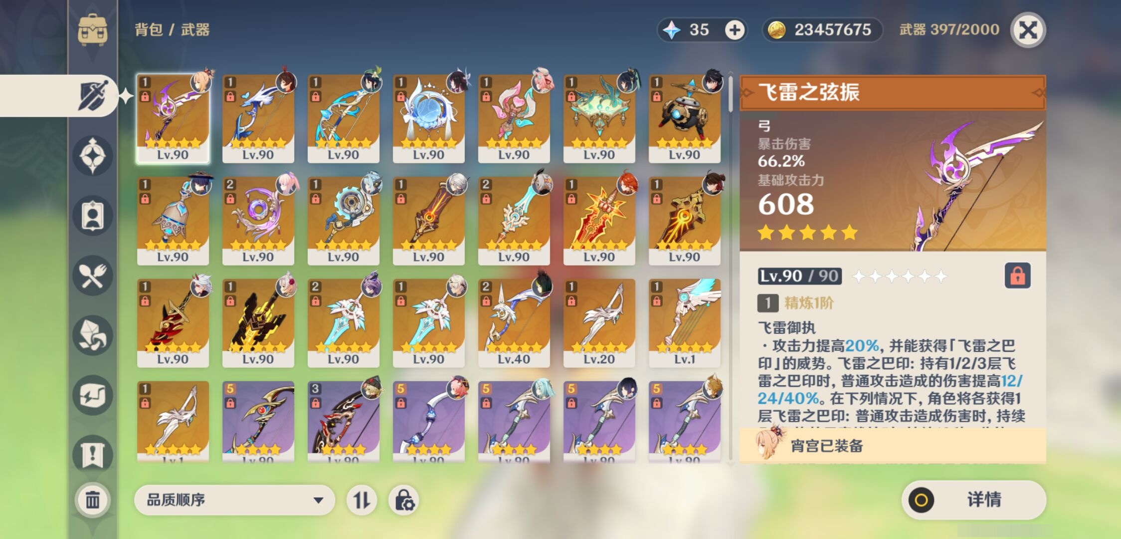 【22个五星武器】,精2不灭月华,精2天空之刃,精2阿莫斯之弓,精2天空之脊,精1飞雷之弦振,精1图莱杜拉的回忆,精1赤角石溃杵,精1若水,精1无工之剑,精1终末嗟叹之诗,精1支离轮光,精1帷间夜曲,精1赤沙之杖,精1天空之刃,精1溢彩心念,精1鹤鸣余音,精1焚曜千阳,精1风鹰剑,精1金流监督,精1苇海信标,精1天空之翼,精1风鹰剑,9套,