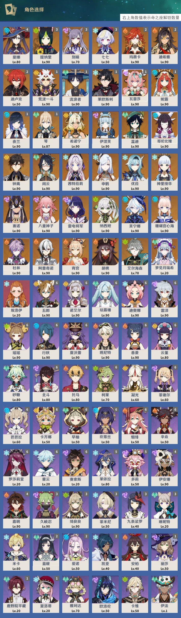 【37个五星角色】,4命莫娜,3命提纳里,3命刻晴,3命七七,2命玛薇卡,2命迪希雅,2命迪卢克,1命荒泷一斗,1命流浪者,1命莱欧斯利,1命瓦雷莎,1命妮露,1命夜兰,1命琴,0命希诺宁,0命伊涅芙,0命温迪,0命哥伦比娅,0命钟离,0命闲云,0命茜特菈莉,0命申鹤,0命优菈,0命神里绫华,0命赛诺,0命八重神子,0命雷电将军,0命纳西妲,0命芙宁娜,0命珊瑚宫心海,0命杜林,0命阿蕾奇诺,0命宵宫,0命胡桃,0命艾尔海森,0命梦见月瑞希,0命埃洛伊,