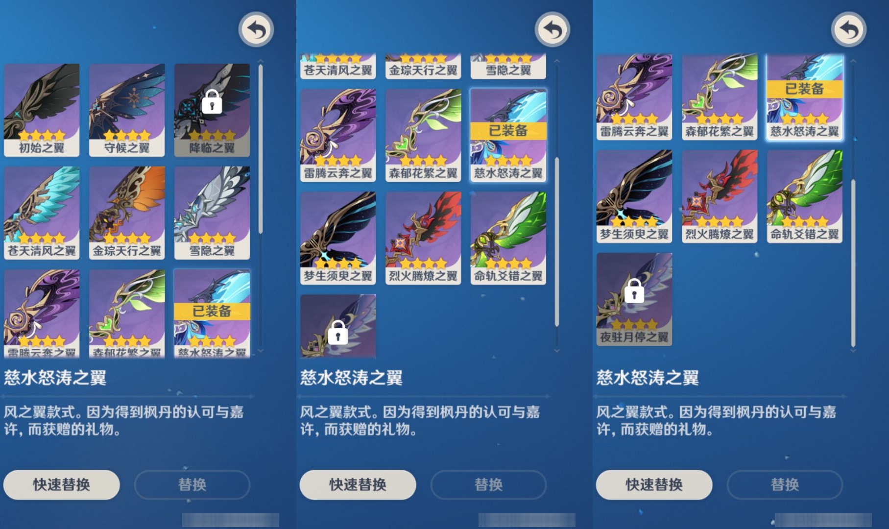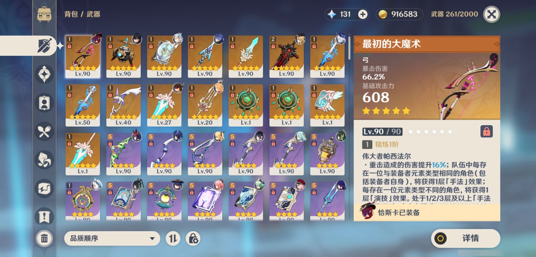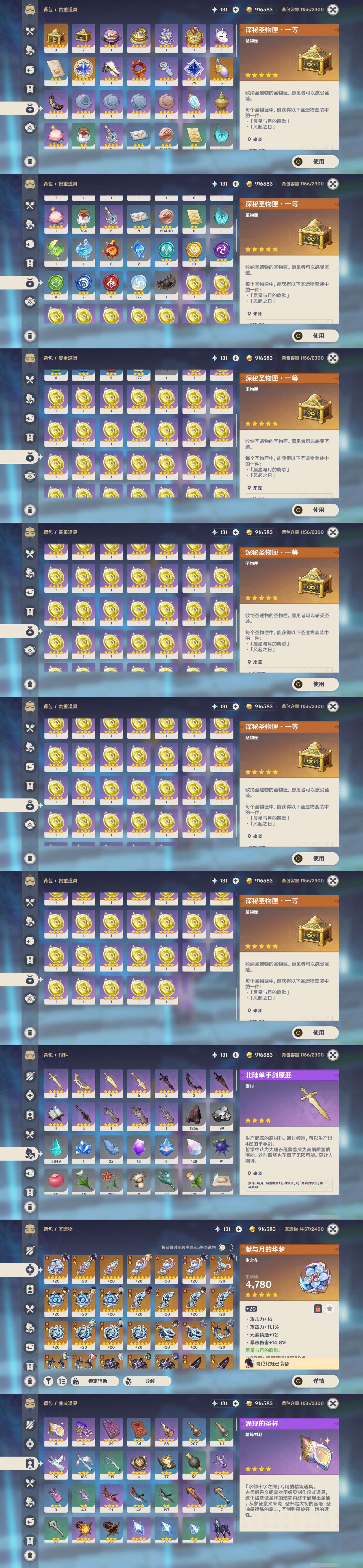 【15个五星武器】,精2狼的末路,精1最初的大魔术,精1静水流涌之辉,精1天空之傲,精1阿莫斯之弓,精1金流监督,精1四风原典,精1天空之傲,精1息灾,精1香韵奏者,精1天空之脊,精1碧落之珑,精1碧落之珑,精1静水流涌之辉,精1天空之卷,7套,