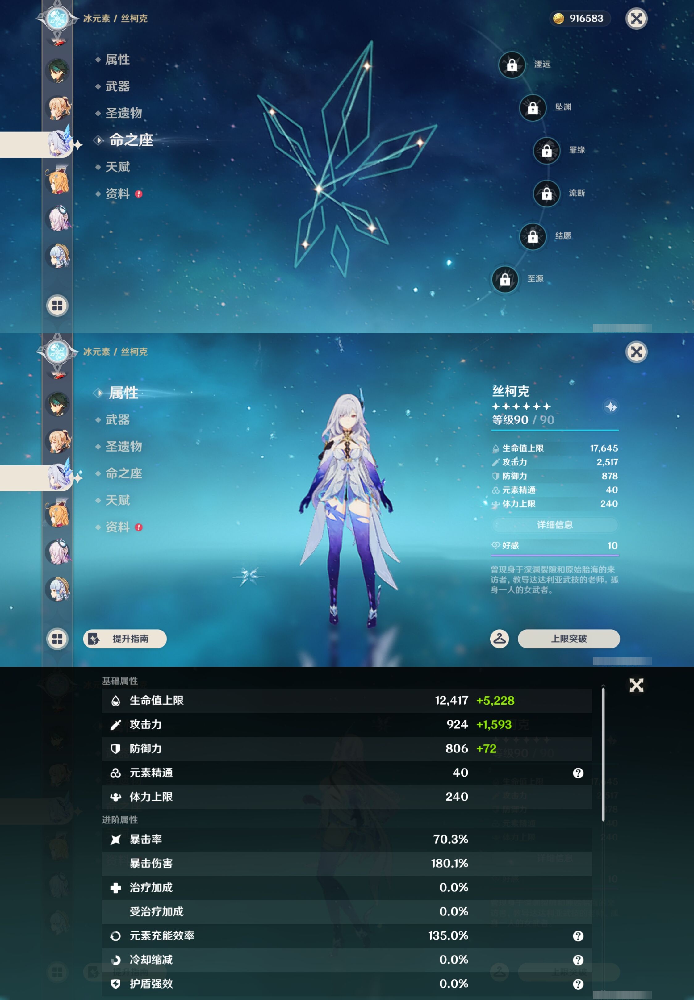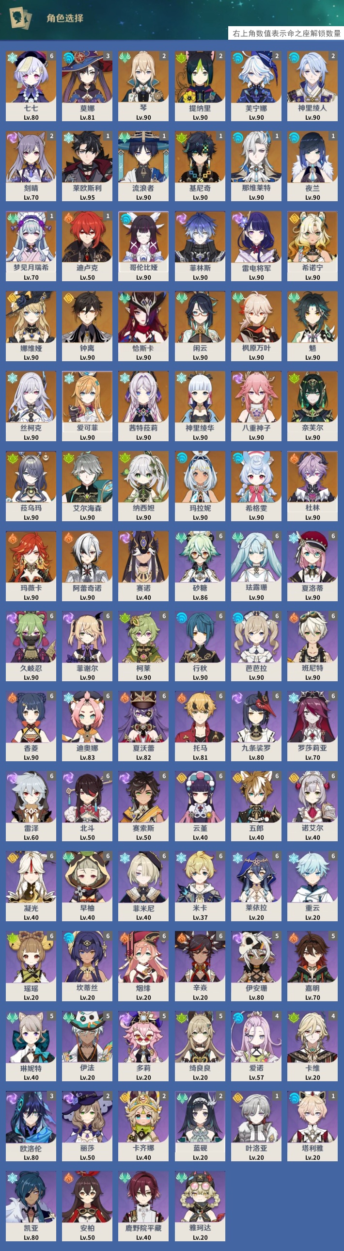 【39个五星角色】,满命七七,3命莫娜,2命琴,2命提纳里,2命芙宁娜,2命神里绫人,2命刻晴,1命莱欧斯利,1命流浪者,1命基尼奇,1命那维莱特,1命夜兰,1命梦见月瑞希,1命迪卢克,0命哥伦比娅,0命菲林斯,0命雷电将军,0命希诺宁,0命娜维娅,0命钟离,0命恰斯卡,0命闲云,0命枫原万叶,0命魈,0命丝柯克,0命爱可菲,0命茜特菈莉,0命神里绫华,0命八重神子,0命奈芙尔,0命菈乌玛,0命艾尔海森,0命纳西妲,0命玛拉妮,0命希格雯,0命杜林,0命玛薇卡,0命阿蕾奇诺,0命赛诺,