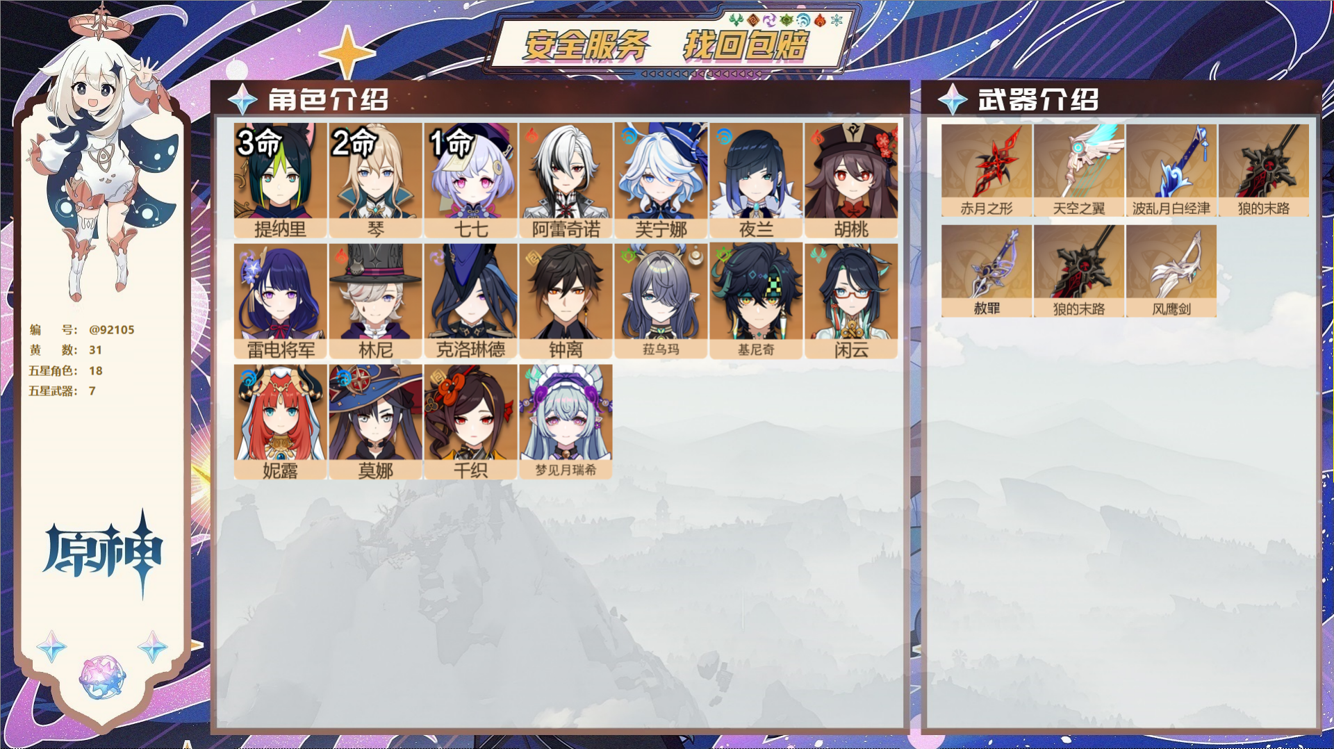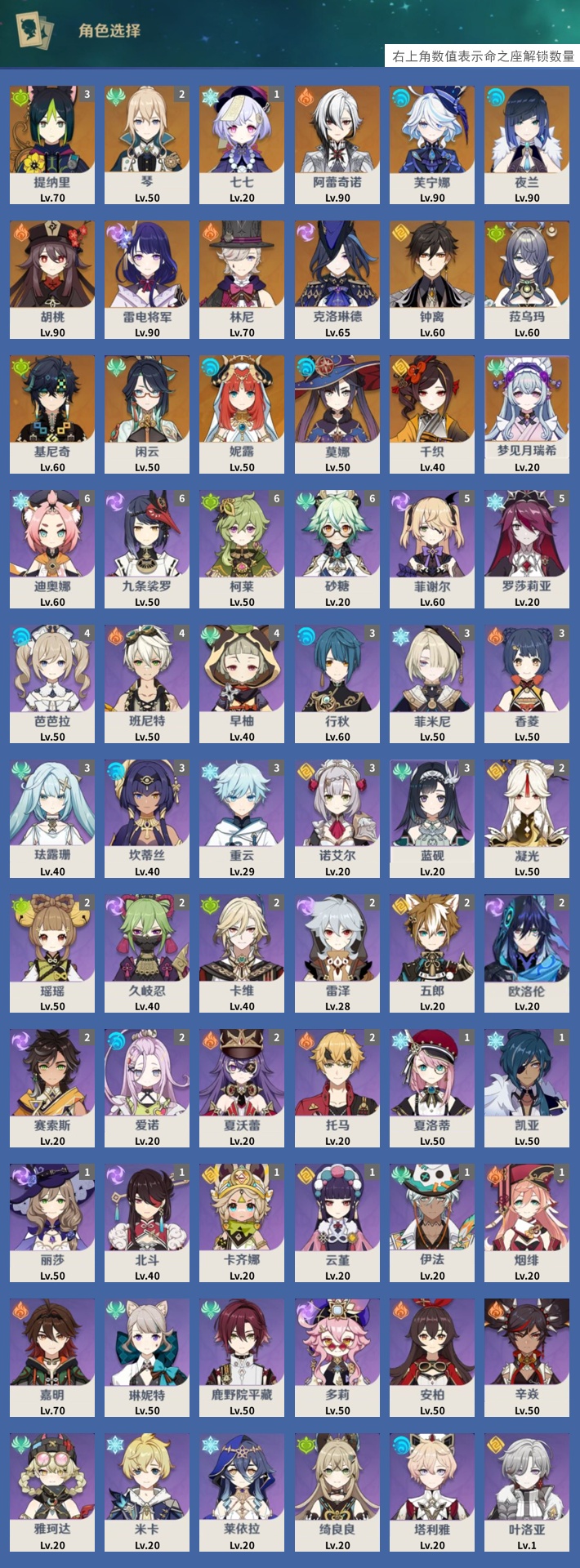 【18个五星角色】,3命提纳里,2命琴,1命七七,0命阿蕾奇诺,0命芙宁娜,0命夜兰,0命胡桃,0命雷电将军,0命林尼,0命克洛琳德,0命钟离,0命菈乌玛,0命基尼奇,0命闲云,0命妮露,0命莫娜,0命千织,0命梦见月瑞希,