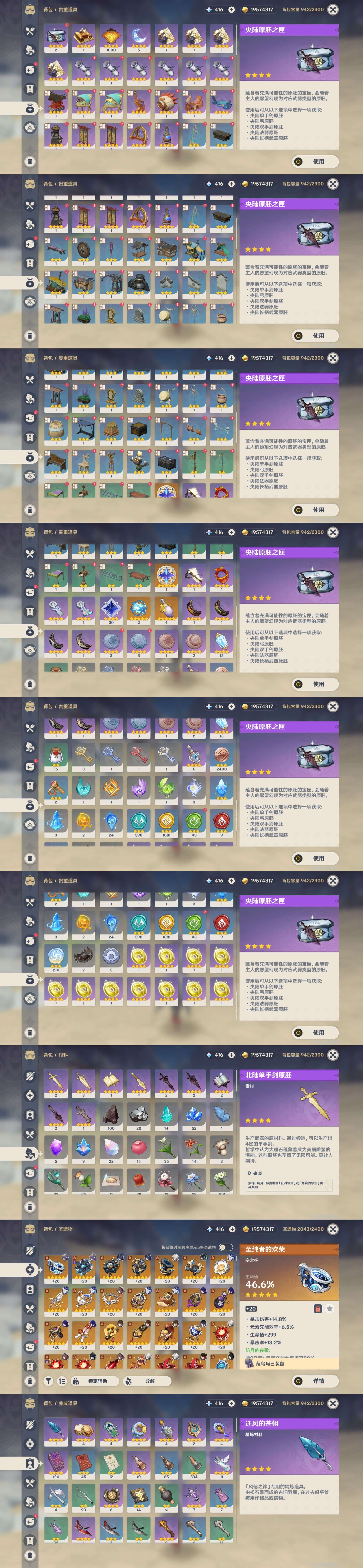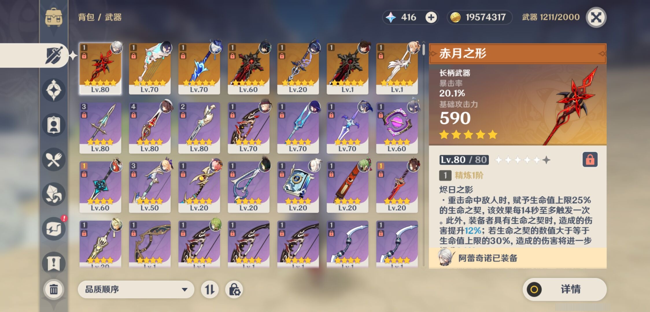 【7个五星武器】,精1赤月之形,精1天空之翼,精1波乱月白经津,精1狼的末路,精1赦罪,精1狼的末路,精1风鹰剑,4套,