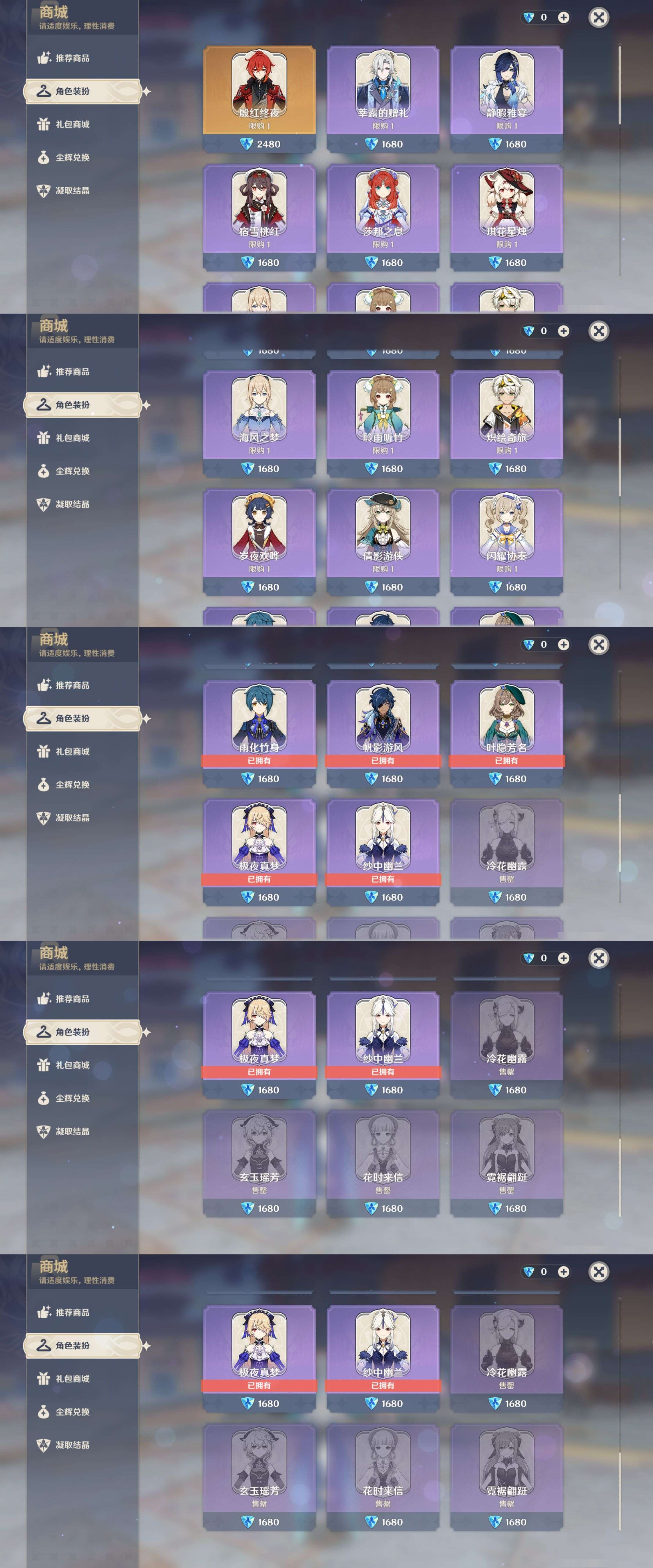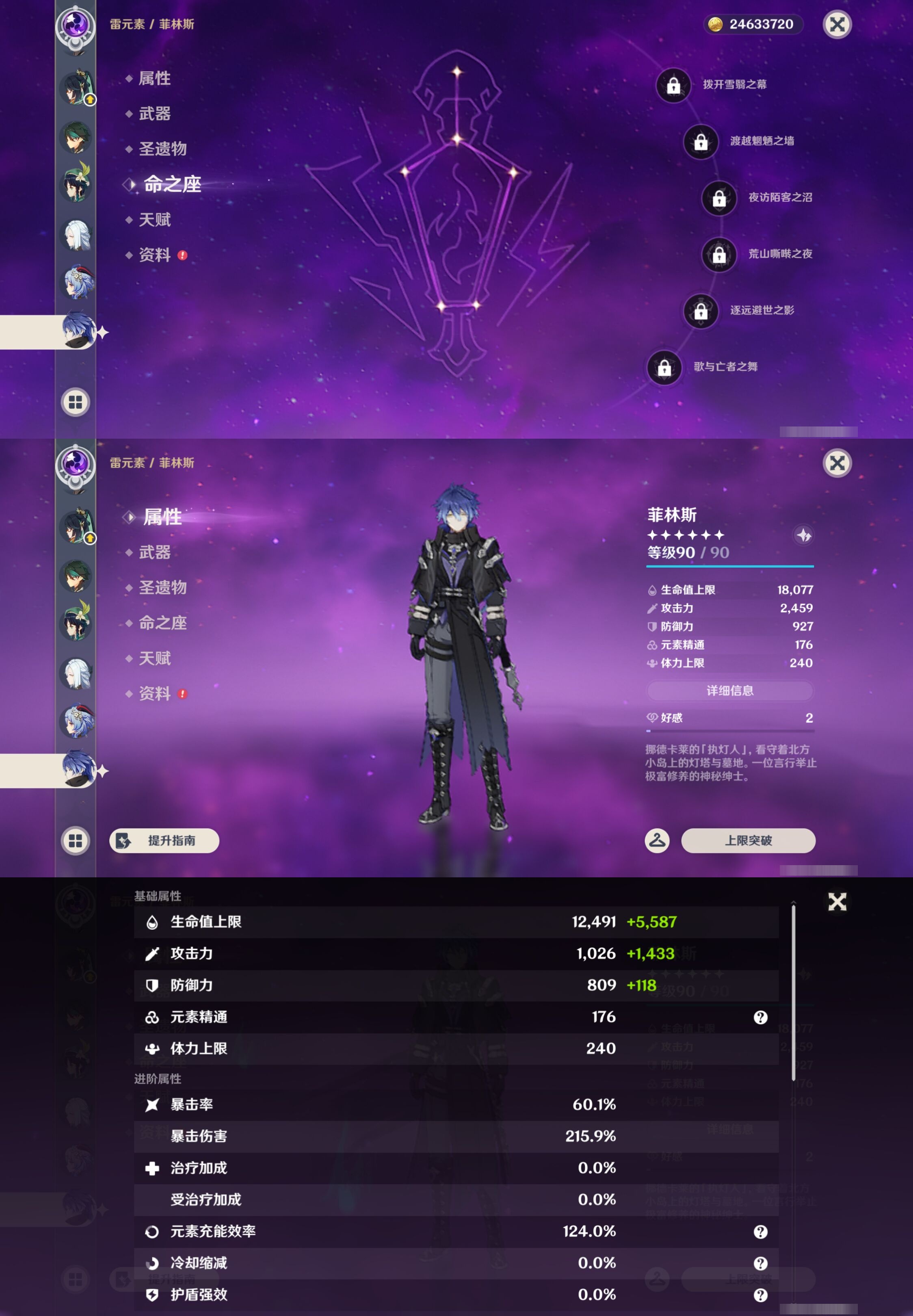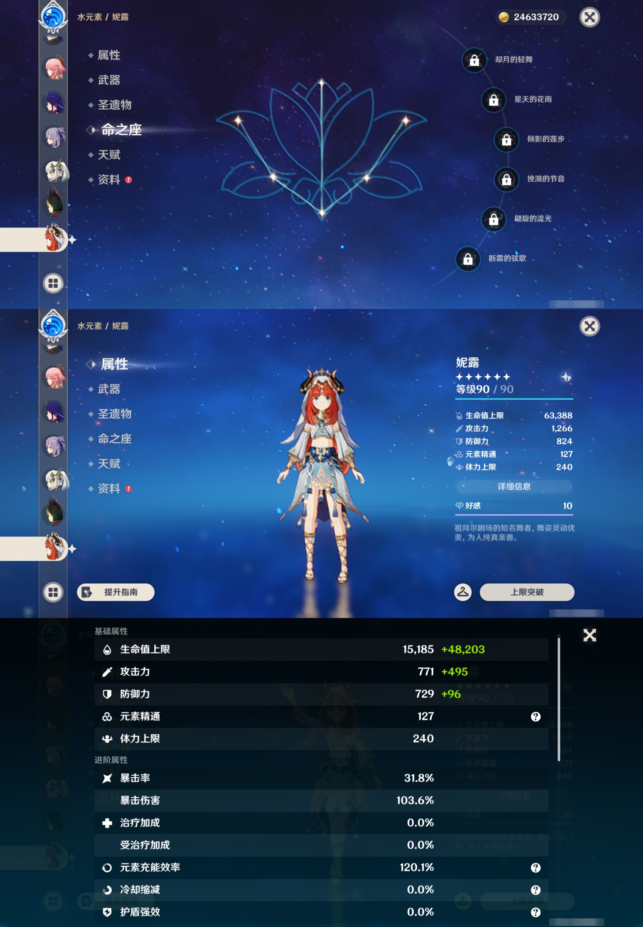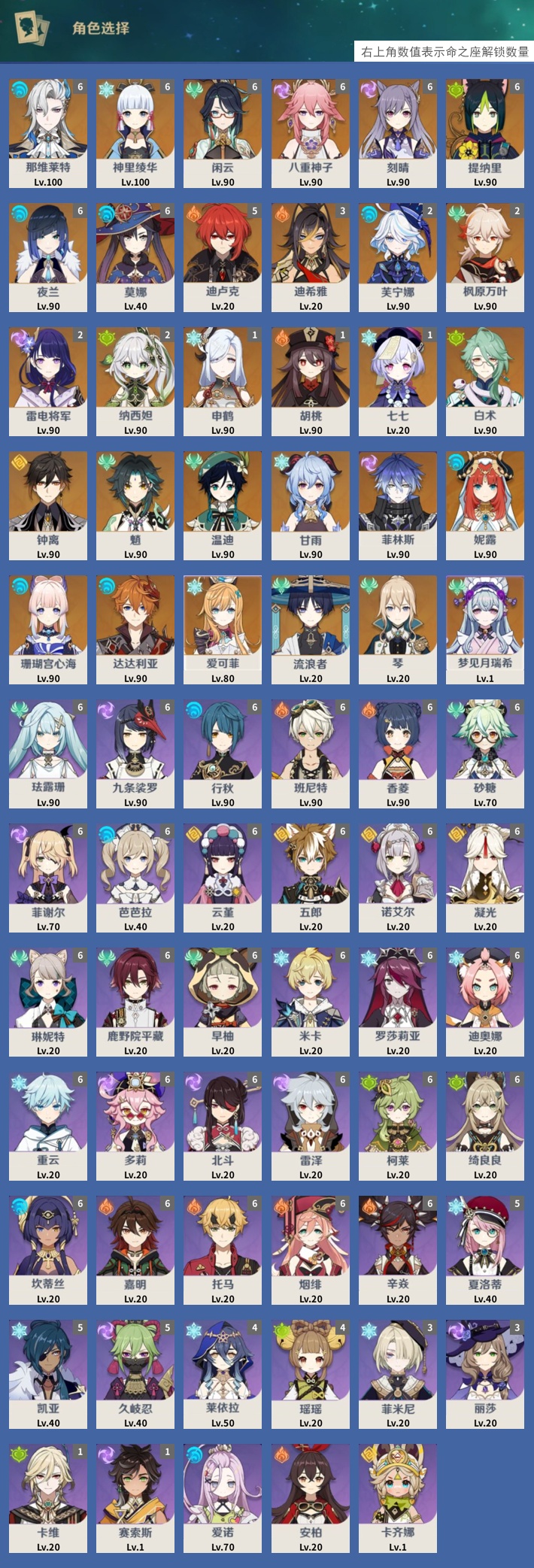 【30个五星角色】,满命那维莱特,满命神里绫华,满命闲云,满命八重神子,满命刻晴,满命提纳里,满命夜兰,满命莫娜,5命迪卢克,3命迪希雅,2命芙宁娜,2命枫原万叶,2命雷电将军,2命纳西妲,1命申鹤,1命胡桃,1命七七,0命白术,0命钟离,0命魈,0命温迪,0命甘雨,0命菲林斯,0命妮露,0命珊瑚宫心海,0命达达利亚,0命爱可菲,0命流浪者,0命琴,0命梦见月瑞希,