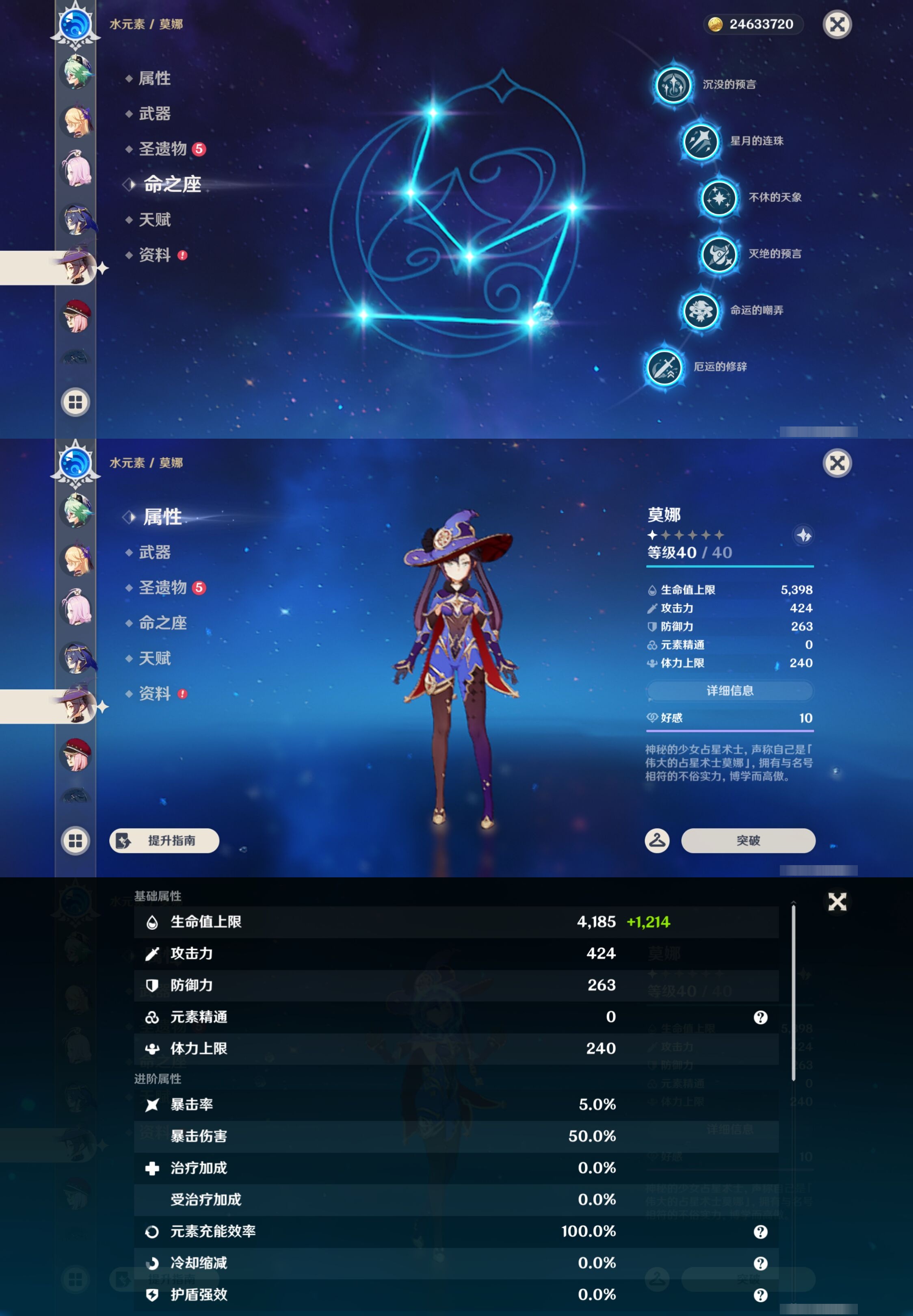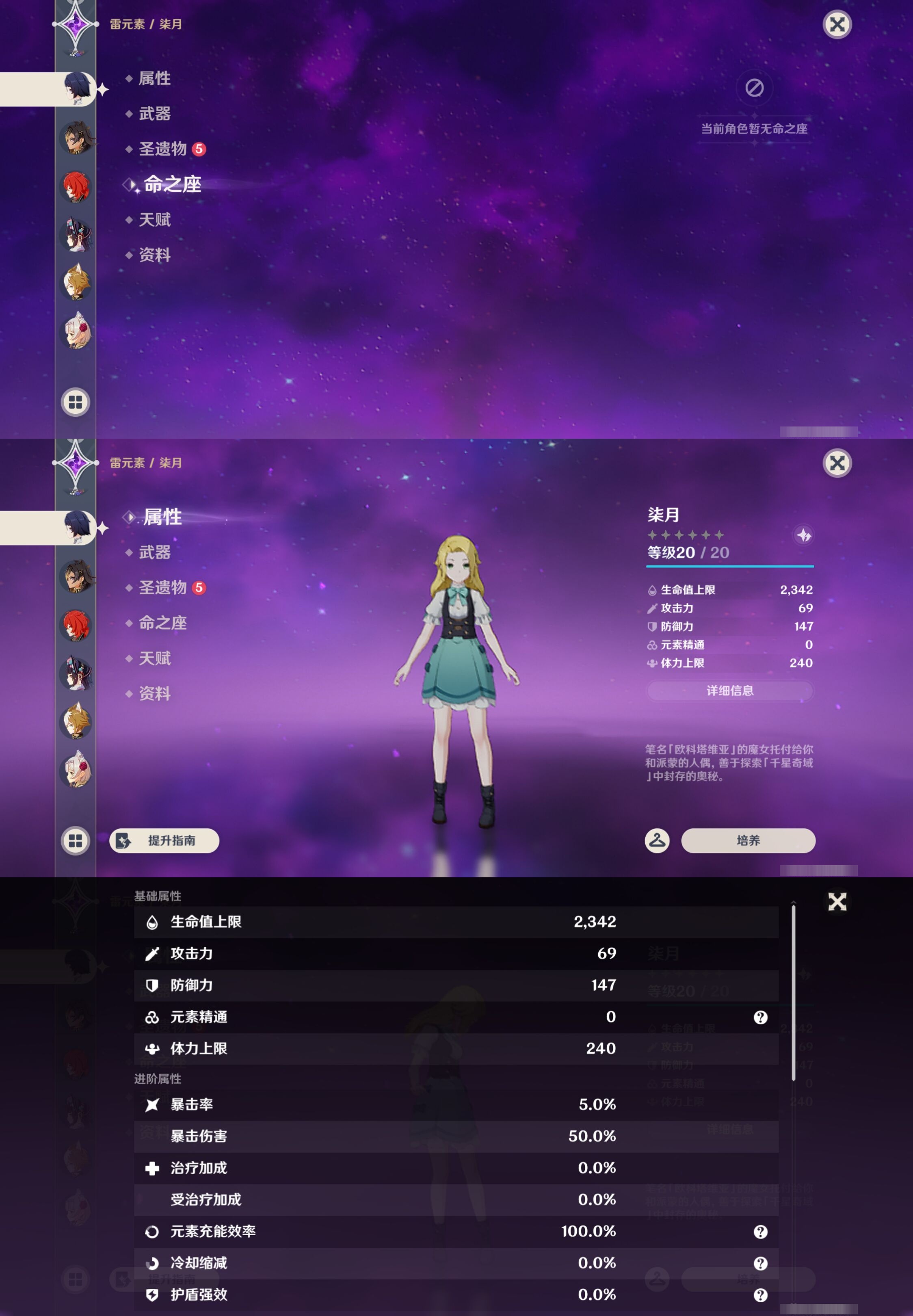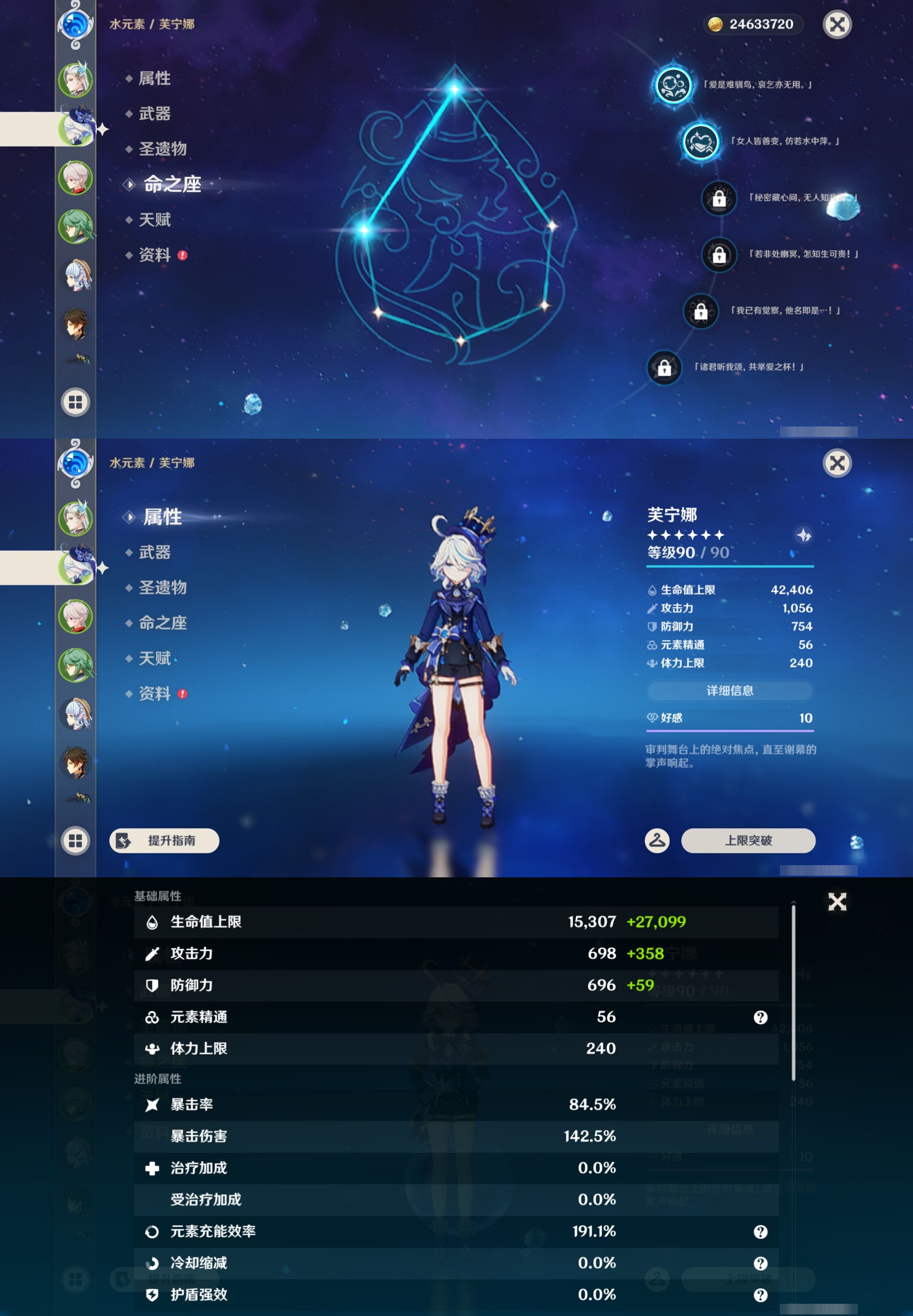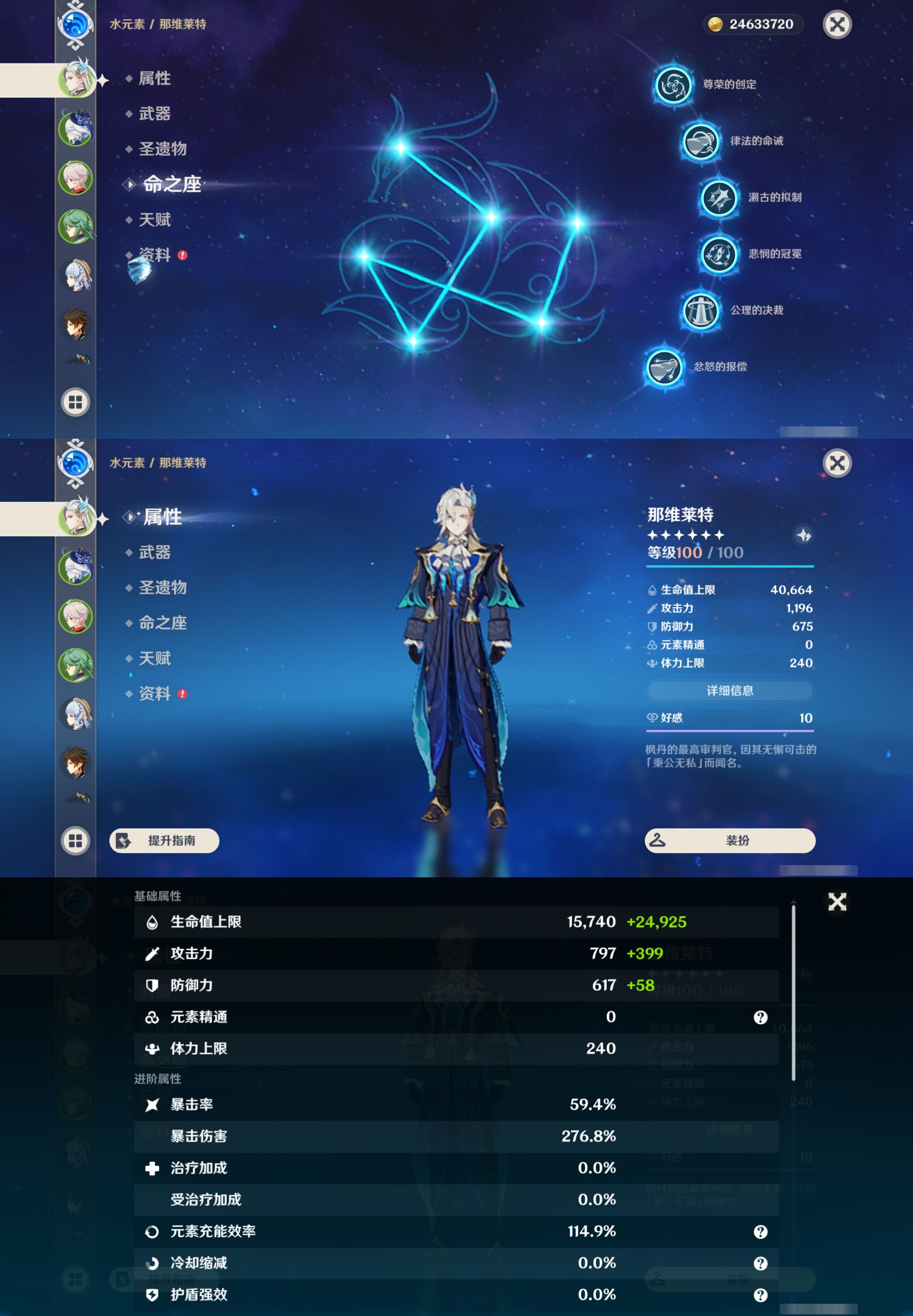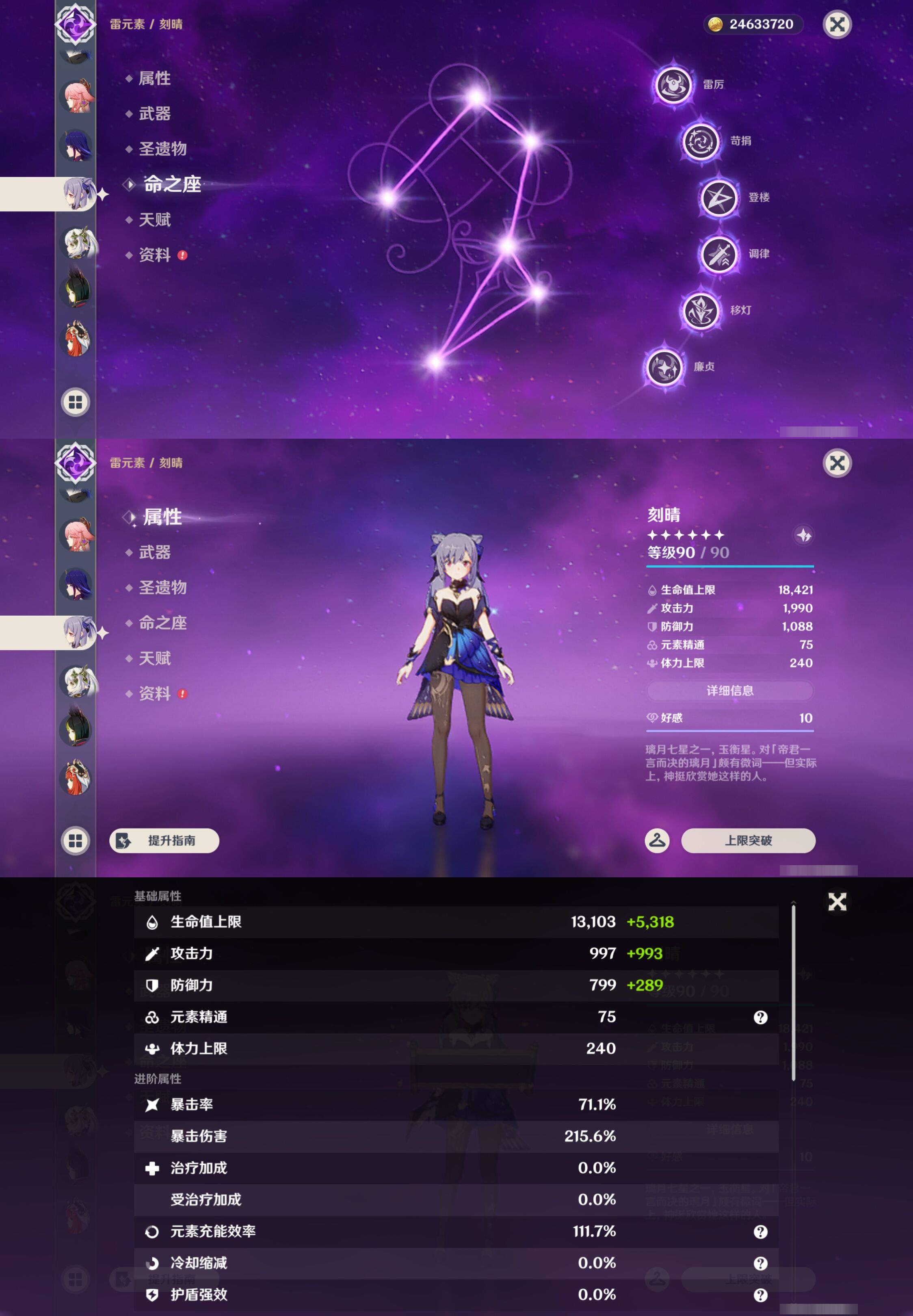 【30个五星角色】,满命那维莱特,满命神里绫华,满命闲云,满命八重神子,满命刻晴,满命提纳里,满命夜兰,满命莫娜,5命迪卢克,3命迪希雅,2命芙宁娜,2命枫原万叶,2命雷电将军,2命纳西妲,1命申鹤,1命胡桃,1命七七,0命白术,0命钟离,0命魈,0命温迪,0命甘雨,0命菲林斯,0命妮露,0命珊瑚宫心海,0命达达利亚,0命爱可菲,0命流浪者,0命琴,0命梦见月瑞希,