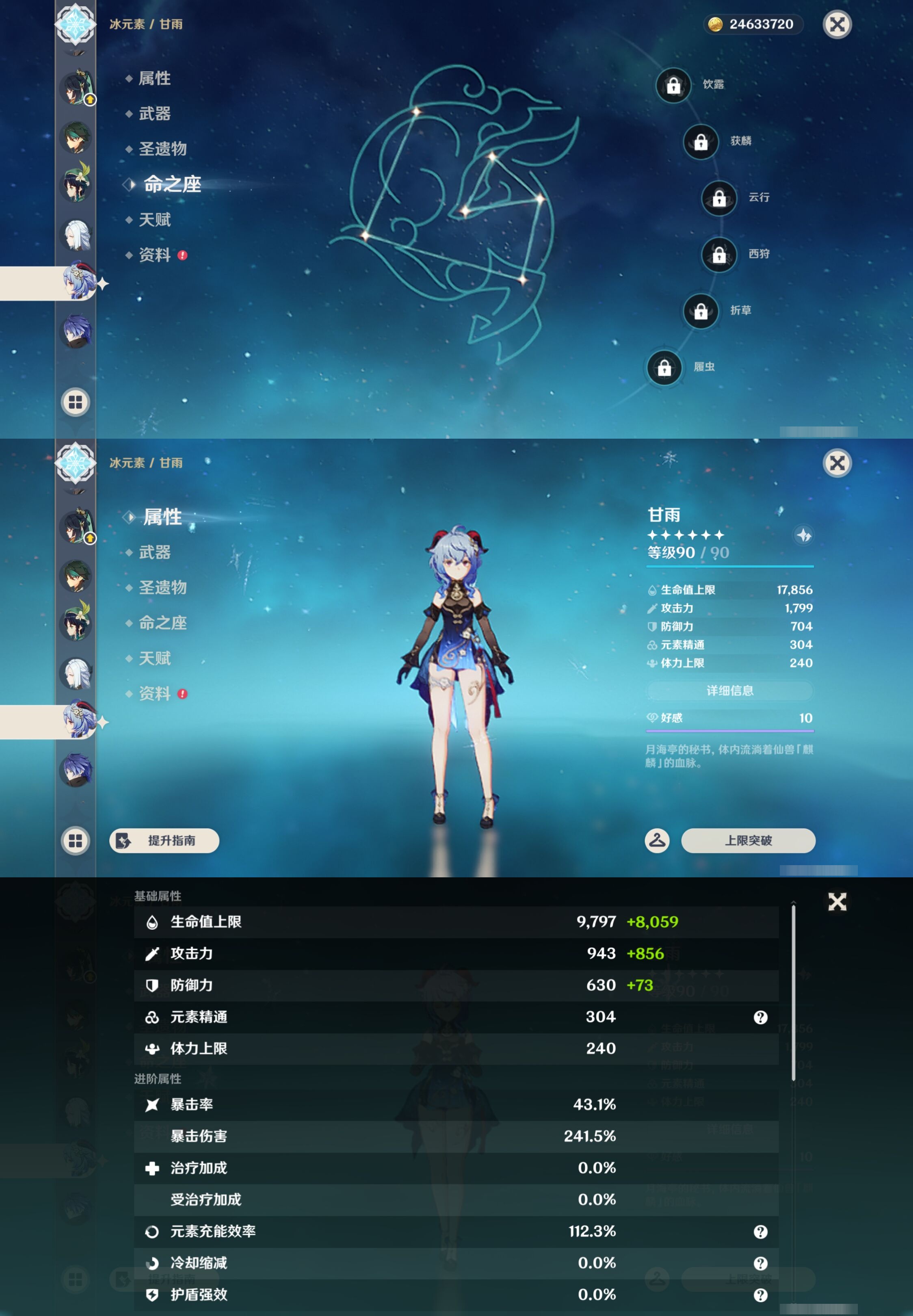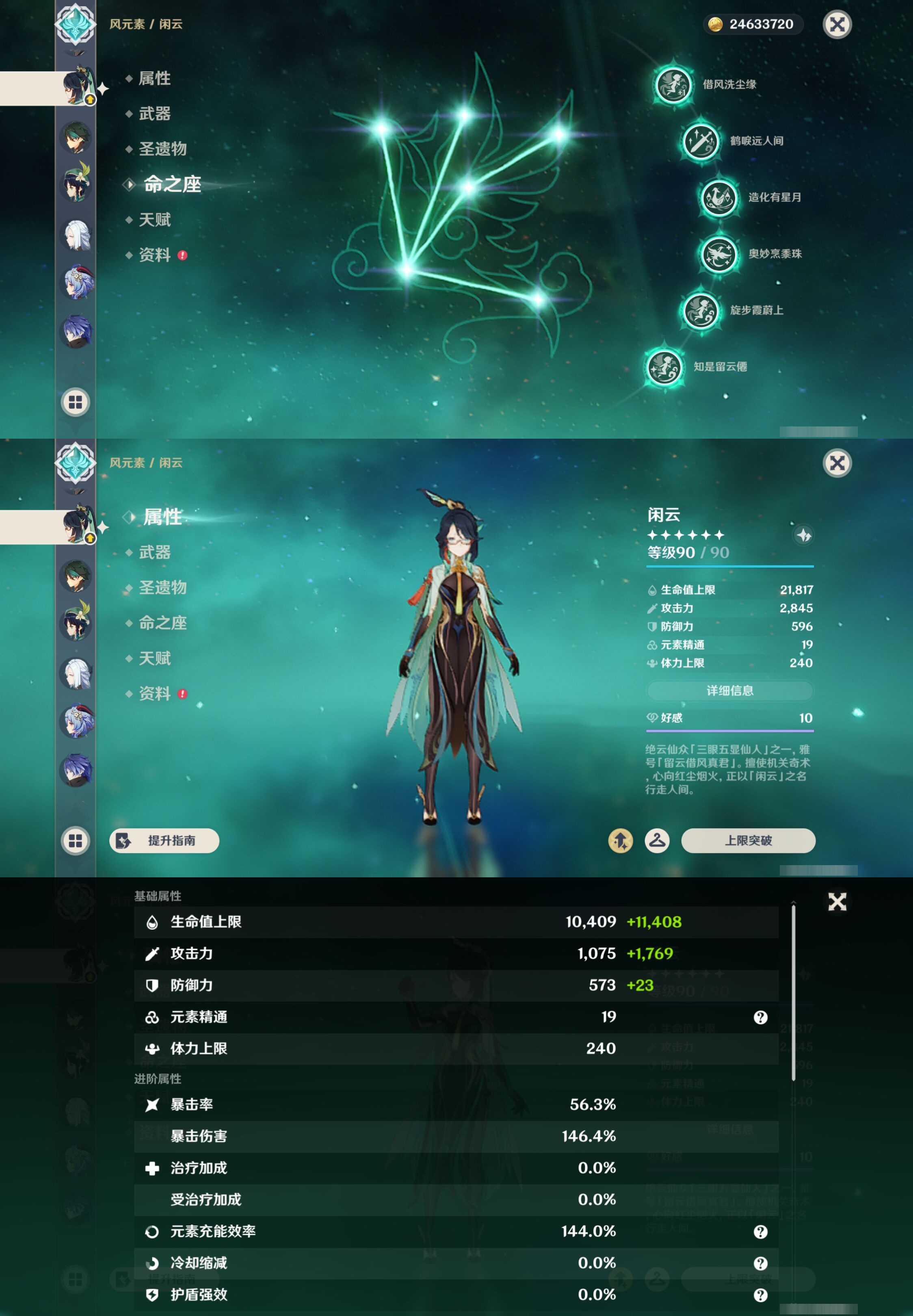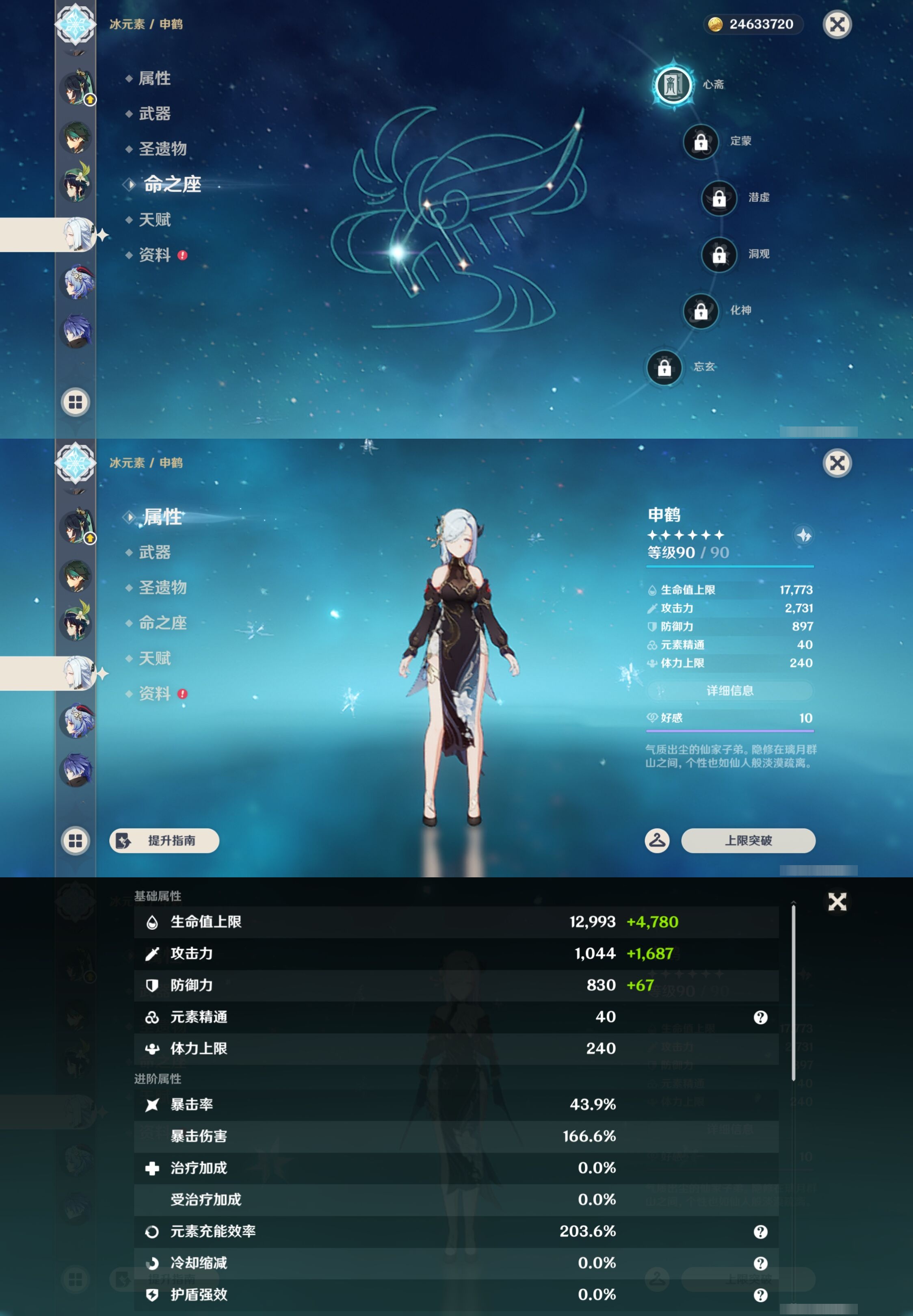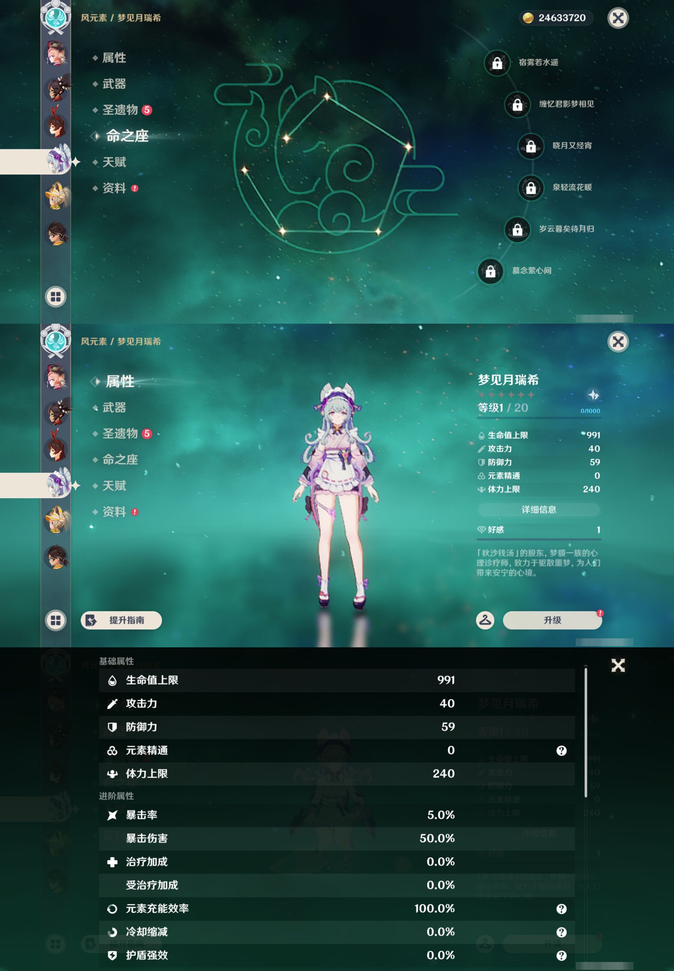 【30个五星角色】,满命那维莱特,满命神里绫华,满命闲云,满命八重神子,满命刻晴,满命提纳里,满命夜兰,满命莫娜,5命迪卢克,3命迪希雅,2命芙宁娜,2命枫原万叶,2命雷电将军,2命纳西妲,1命申鹤,1命胡桃,1命七七,0命白术,0命钟离,0命魈,0命温迪,0命甘雨,0命菲林斯,0命妮露,0命珊瑚宫心海,0命达达利亚,0命爱可菲,0命流浪者,0命琴,0命梦见月瑞希,