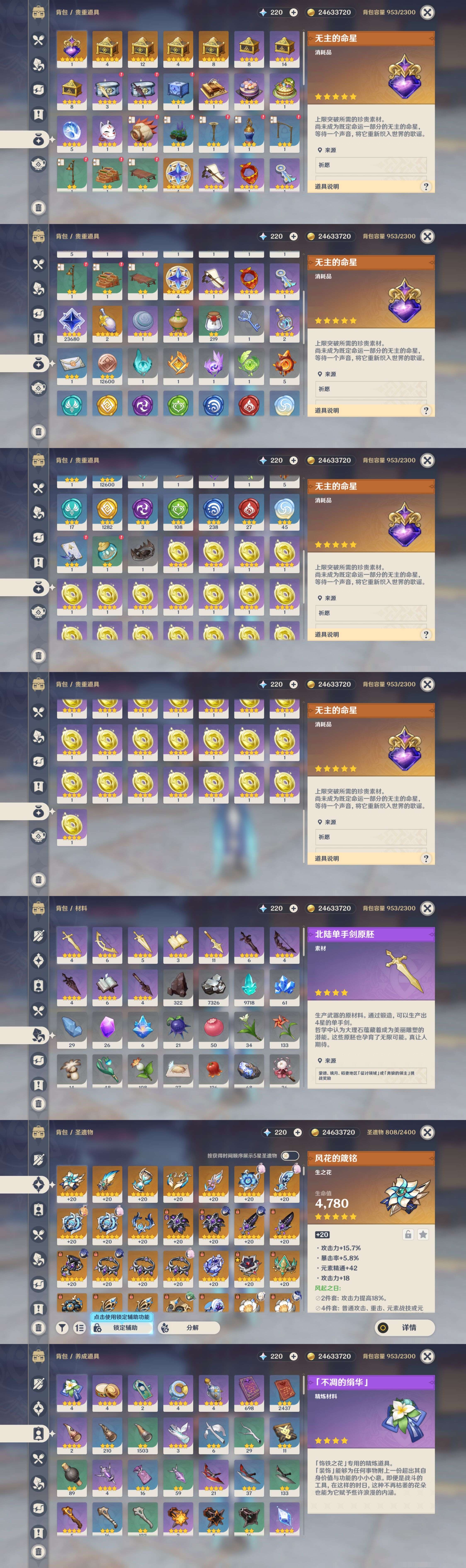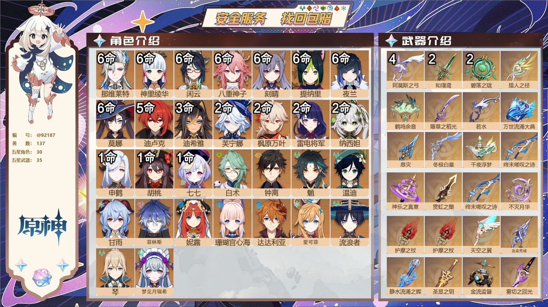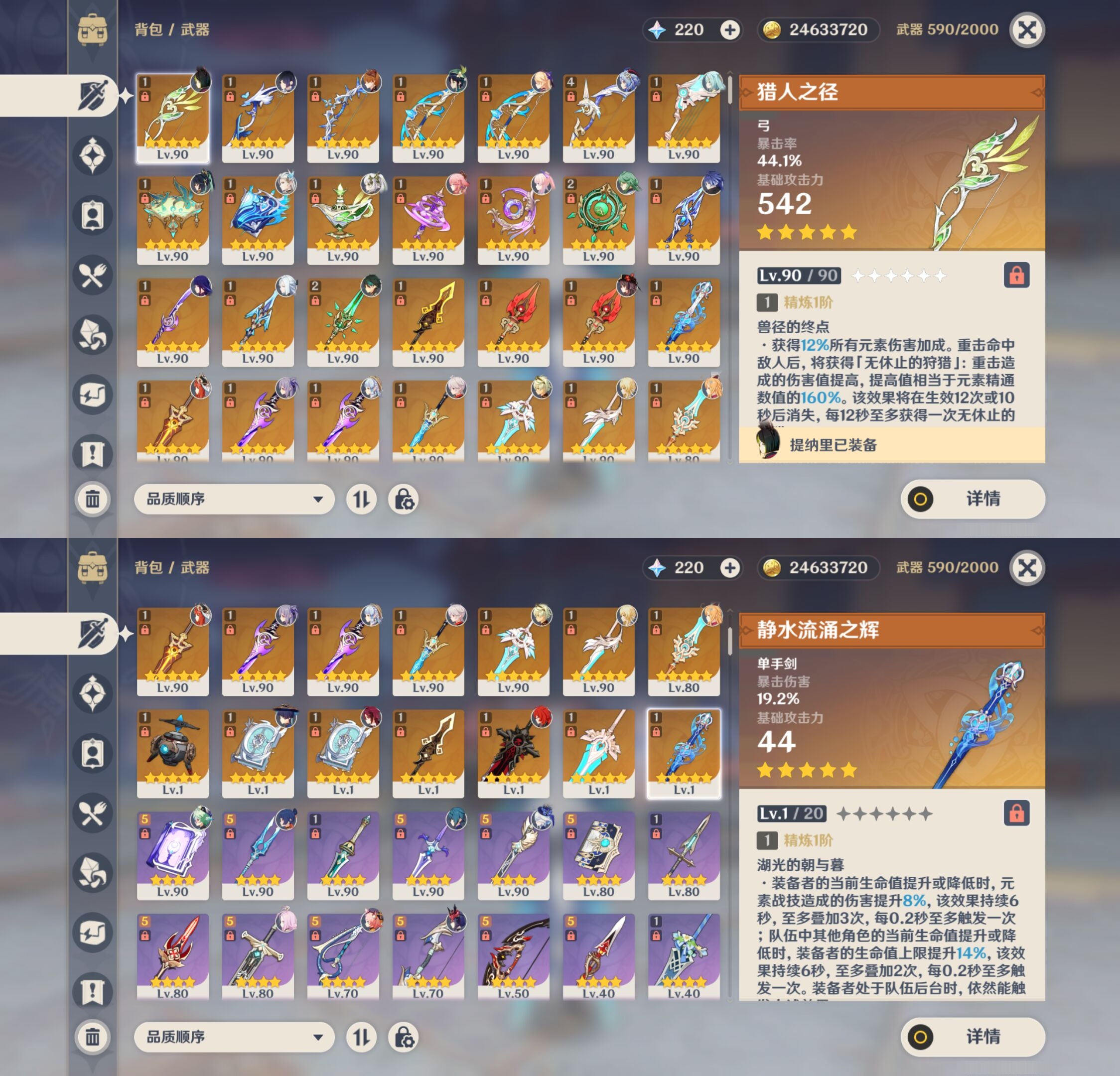 【35个五星武器】,精4阿莫斯之弓,精2和璞鸢,精2碧落之珑,精1猎人之径,精1鹤鸣余音,精1薙草之稻光,精1若水,精1万世流涌大典,精1息灾,精1冬极白星,精1千夜浮梦,精1终末嗟叹之诗,精1神乐之真意,精1贯虹之槊,精1终末嗟叹之诗,精1不灭月华,精1护摩之杖,精1护摩之杖,精1天空之翼,精1血染荒城,精1静水流涌之辉,精1圣显之钥,精1金流监督,精1雾切之回光,精1四风原典,精1雾切之回光,精1四风原典,精1苍古自由之誓,精1贯虹之槊,精1天空之刃,精1狼的末路,精1风鹰剑,精1天空之傲,精1天空之脊,精1静水流涌之辉,9套,