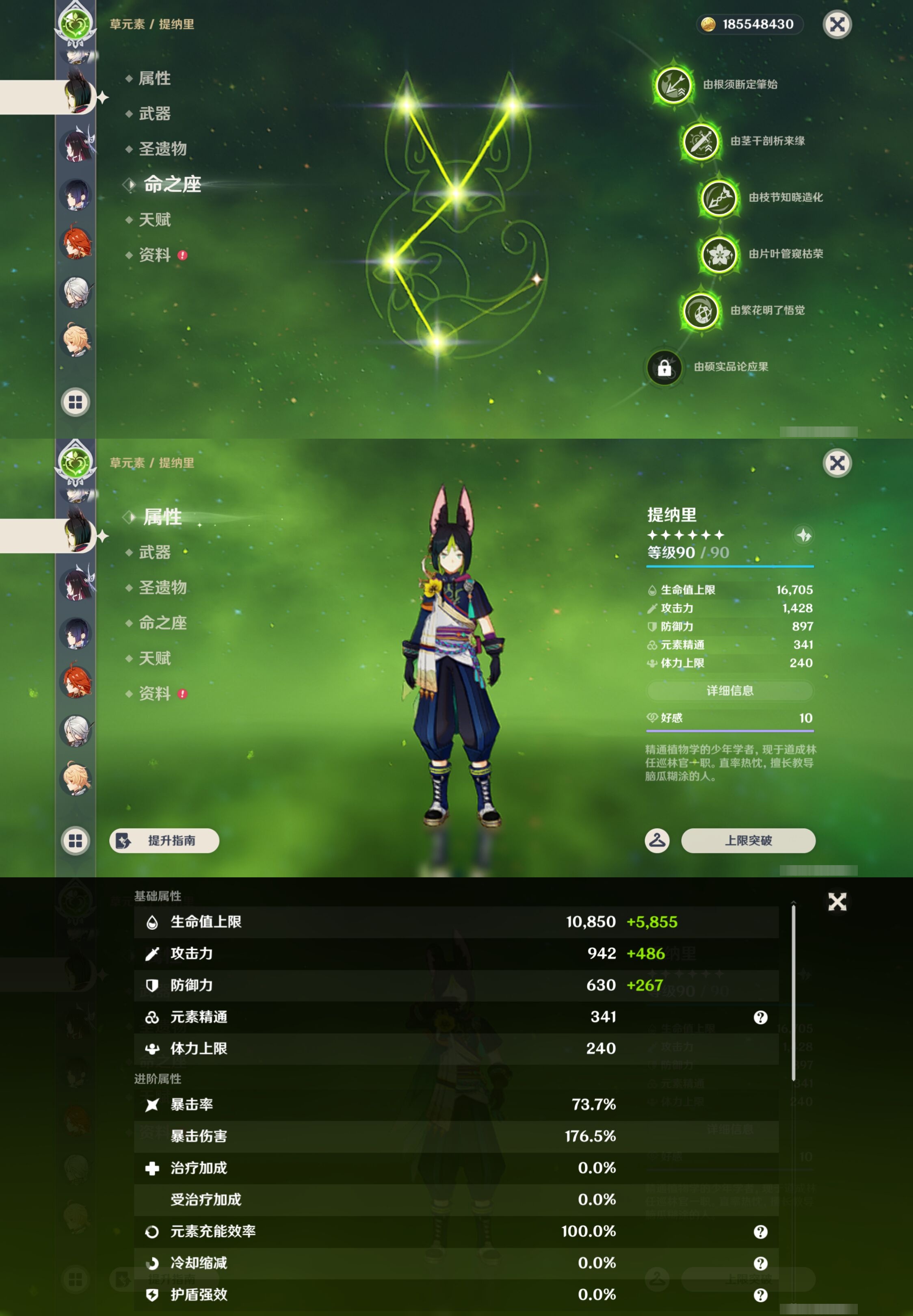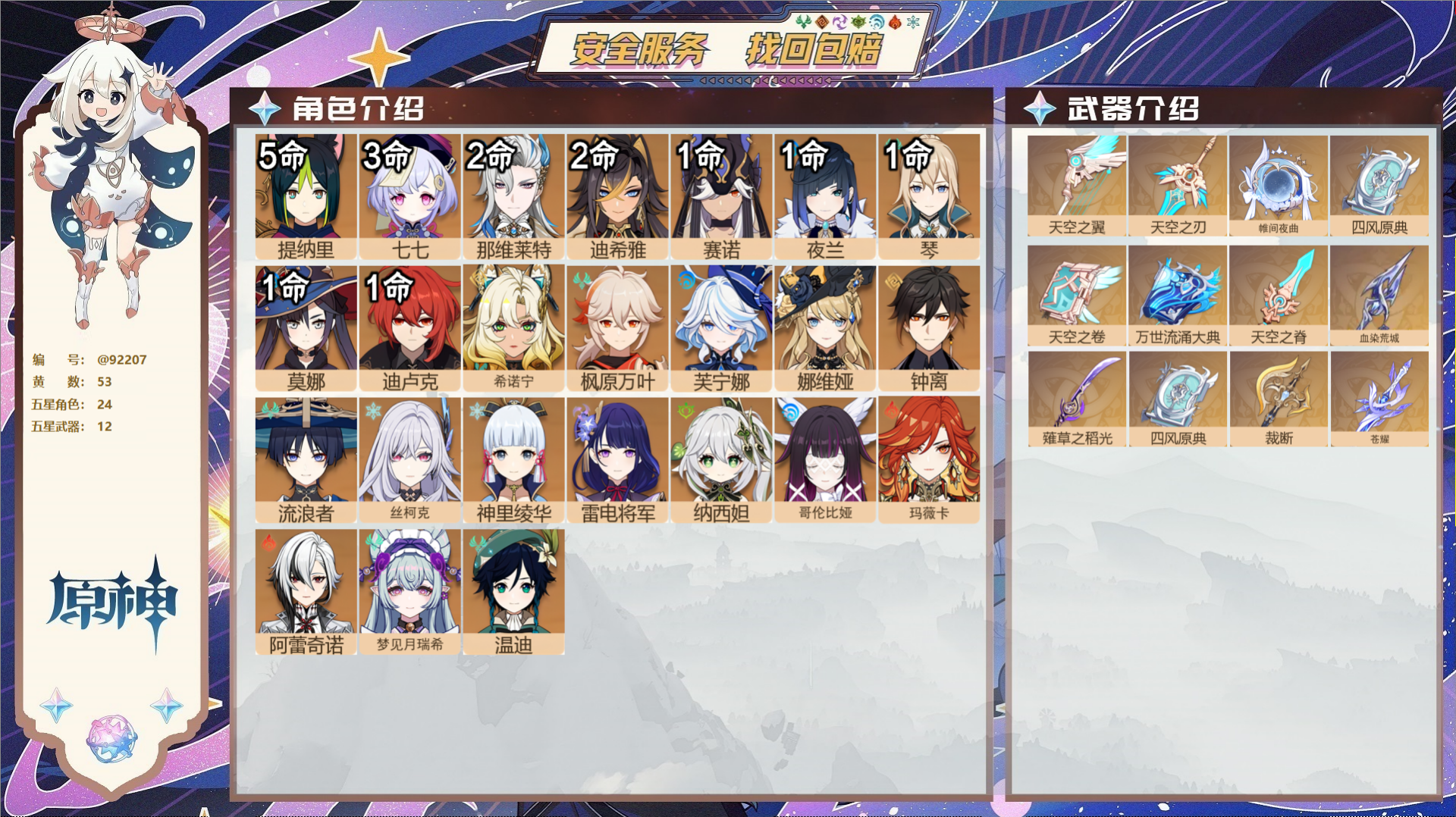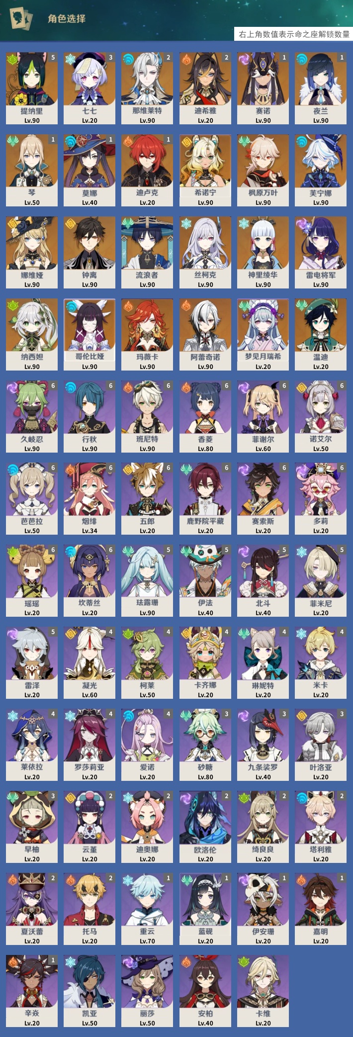 【24个五星角色】,5命提纳里,3命七七,2命那维莱特,2命迪希雅,1命赛诺,1命夜兰,1命琴,1命莫娜,1命迪卢克,0命希诺宁,0命枫原万叶,0命芙宁娜,0命娜维娅,0命钟离,0命流浪者,0命丝柯克,0命神里绫华,0命雷电将军,0命纳西妲,0命哥伦比娅,0命玛薇卡,0命阿蕾奇诺,0命梦见月瑞希,0命温迪,
