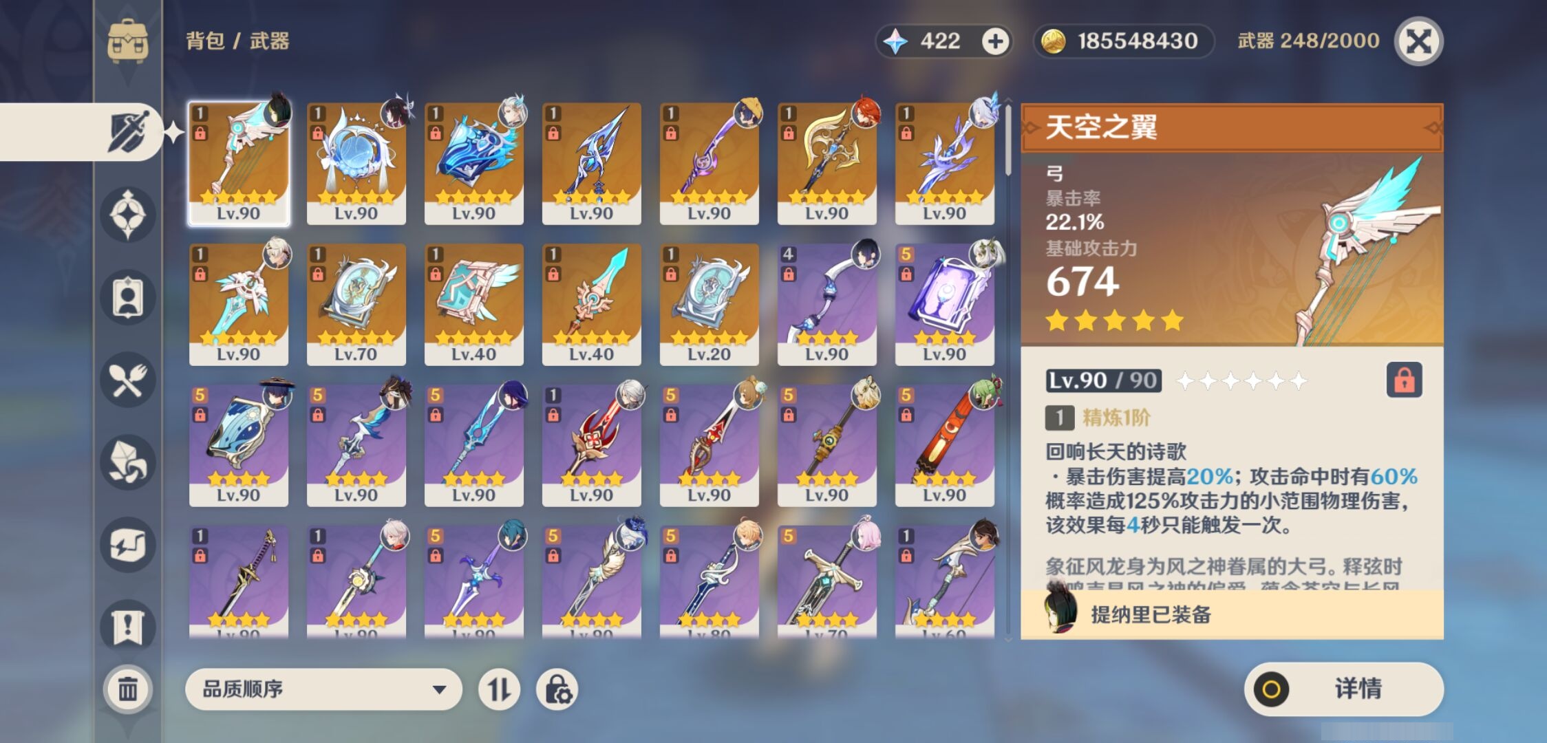 【12个五星武器】,精1天空之翼,精1天空之刃,精1帷间夜曲,精1四风原典,精1天空之卷,精1万世流涌大典,精1天空之脊,精1血染荒城,精1薙草之稻光,精1四风原典,精1裁断,精1苍耀,7套,
