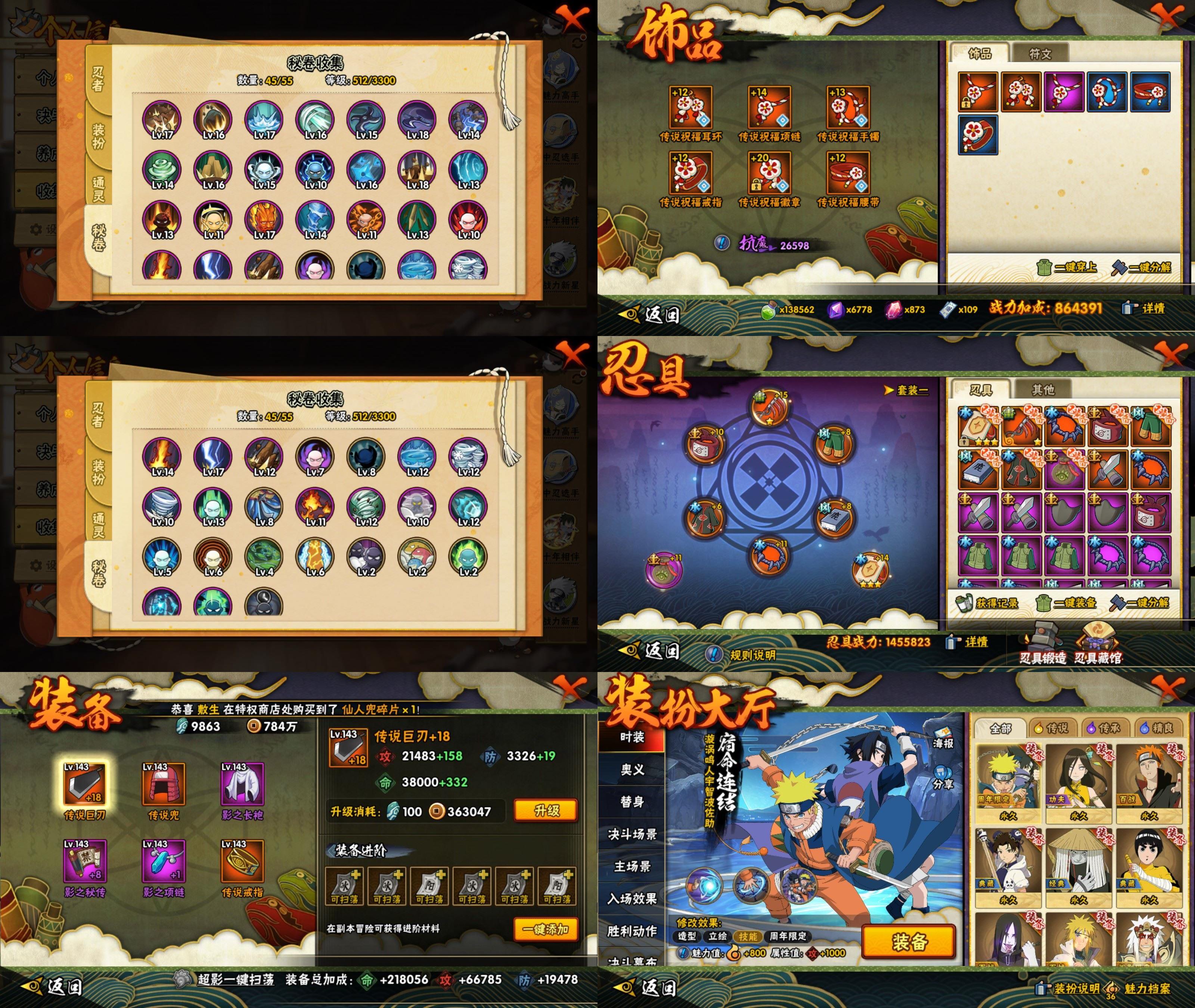 【A忍者】,宇智波佐助「侠隐江湖」,佩恩·六道「漂泊浪客」,千手扉间「漂泊武士」,小南「神驹佑将」,机械鸣人「初始形态」,大野木「侠隐江湖」,巳月「仙人模式」,迈特凯「青春爆炸」,长十郎「六代目水影」,日向宁次「忍界大战」,漩涡博人「桃式显现」,宇智波鼬「夏日限定」,日向雏田「最终章」,旗木卡卡西「幻之真容」,李洛克「忍界大战」,神农「羁绊」,桃地再不斩「秽土转生」,艾「青年」,神秘面具男「忍者之路」,波风水门「青年」,飞段「恶灵之影」,迪达拉「秽土转生」,千代「近松十人卫」,药师兜「半蛇斗篷」,我爱罗「忍界大战」,小南「夏日泳装」,秋道丁次「忍界大战」,照美冥「五代目水影」,奇拉比,飞段「死司凭血」,飞段,我爱罗「疾风传」,蝎,干柿鬼鲛,猿飞阿斯玛,迈特凯,