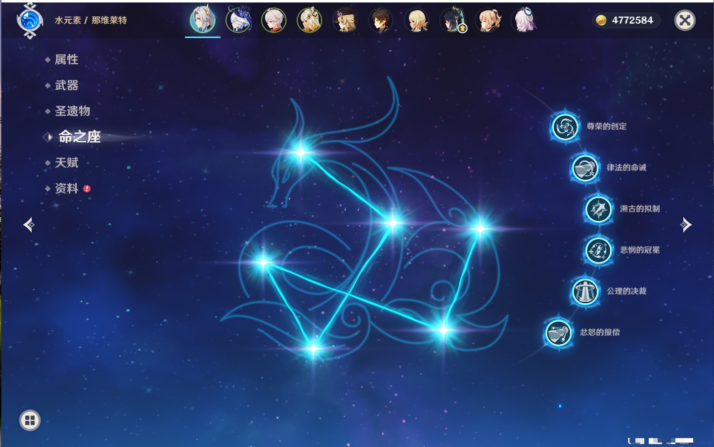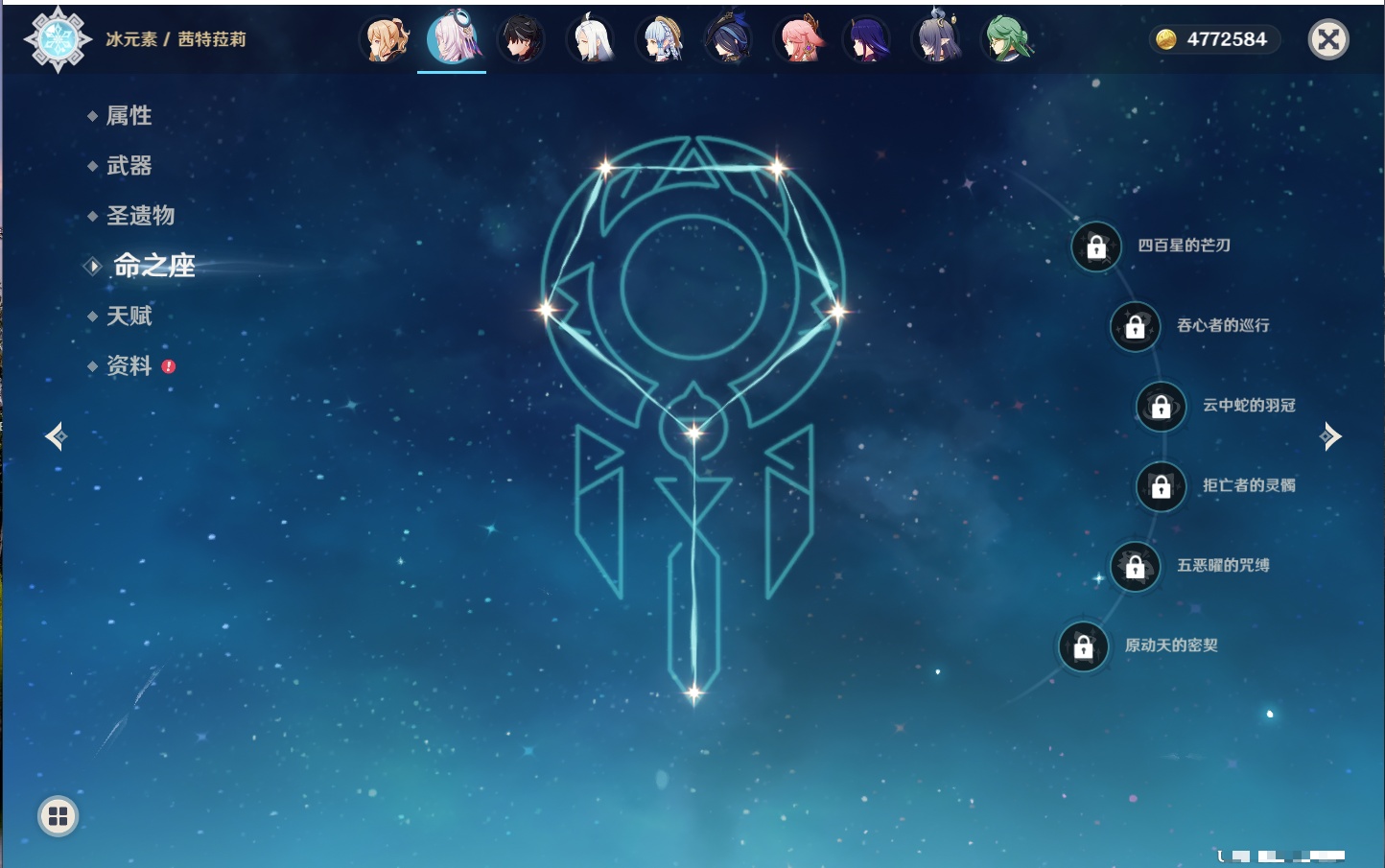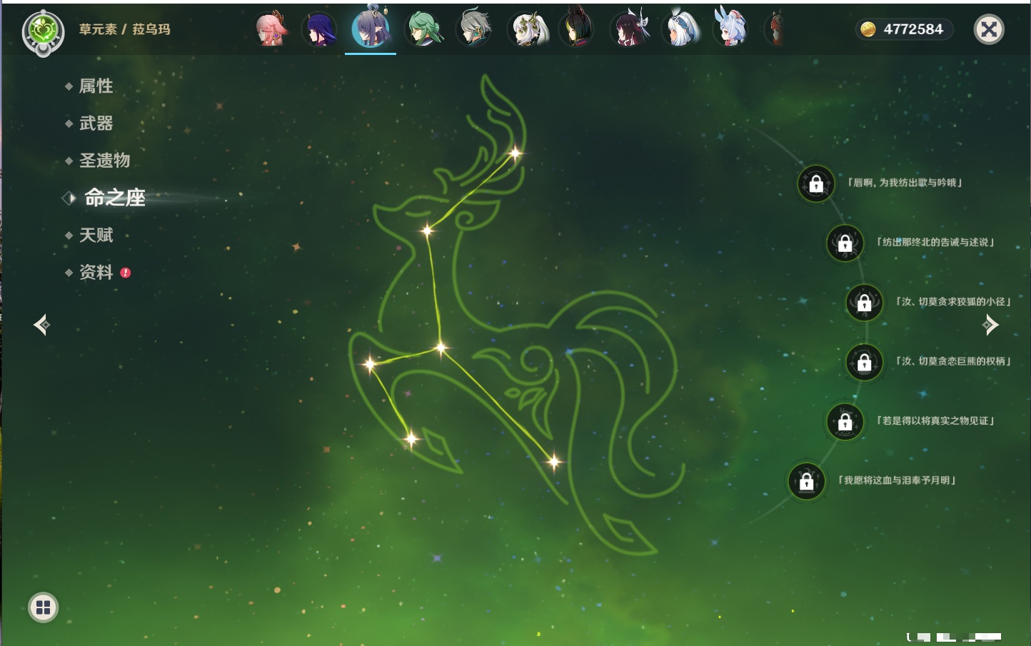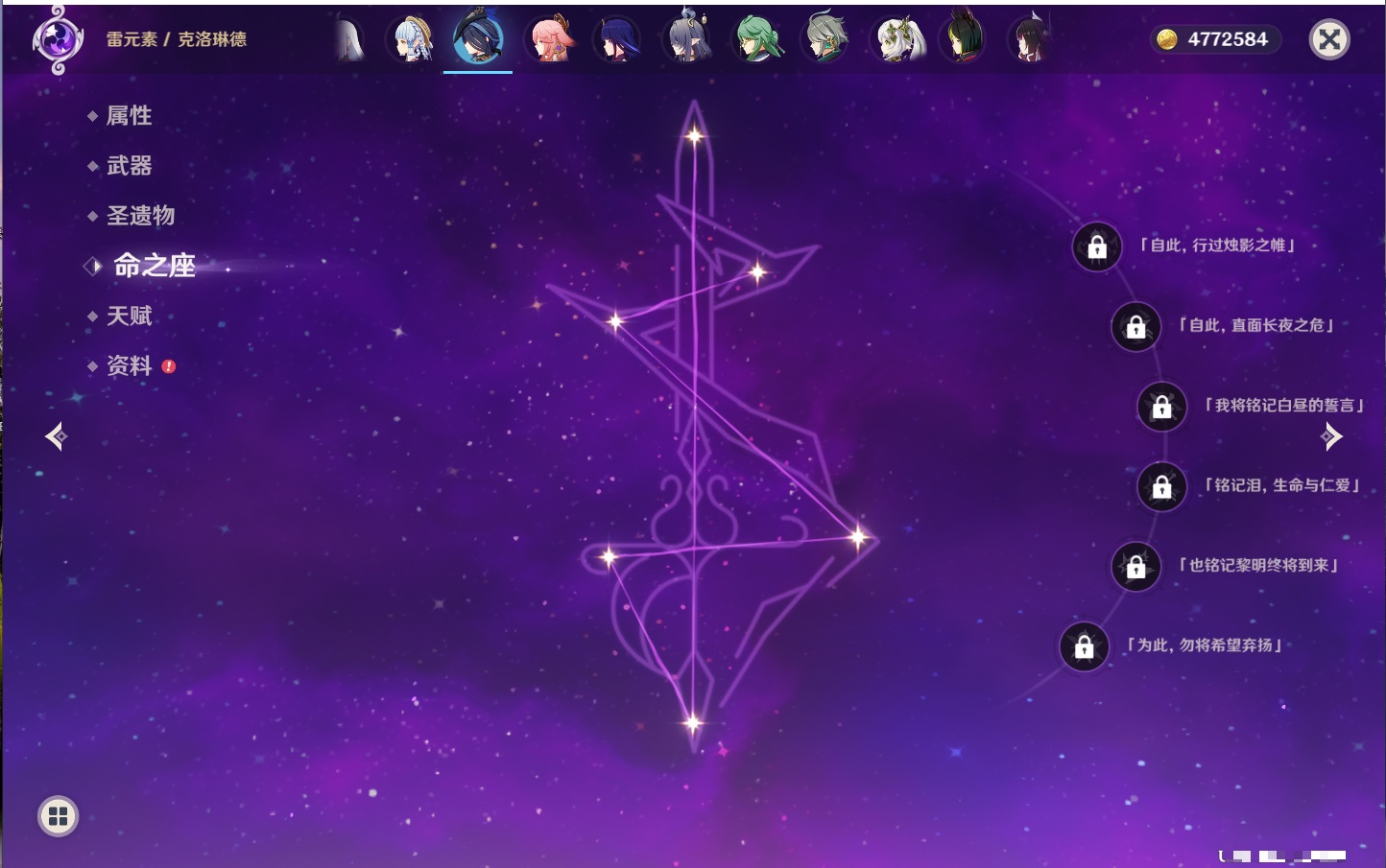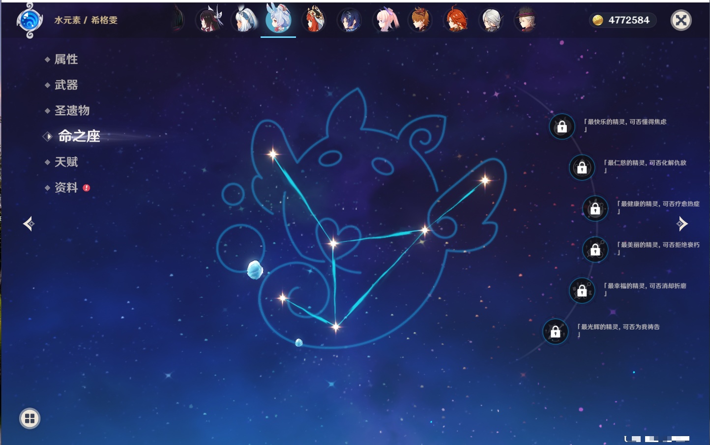 【42个五星角色】,满命那维莱特,满命迪卢克,5命提纳里,4命七七,3命莫娜,2命迪希雅,2命雷电将军,2命刻晴,1命妮露,1命夜兰,1命胡桃,1命琴,0命希格雯,0命克洛琳德,0命阿蕾奇诺,0命闲云,0命芙宁娜,0命莱欧斯利,0命林尼,0命白术,0命艾尔海森,0命流浪者,0命纳西妲,0命八重神子,0命申鹤,0命优菈,0命枫原万叶,0命神里绫华,0命钟离,0命魈,0命宵宫,0命温迪,0命可莉,0命达达利亚,0命珊瑚宫心海,0命希诺宁,0命娜维娅,0命茜特菈莉,0命菈乌玛,0命哥伦比娅,0命玛拉妮,0命玛薇卡,