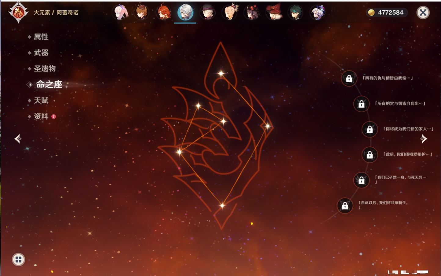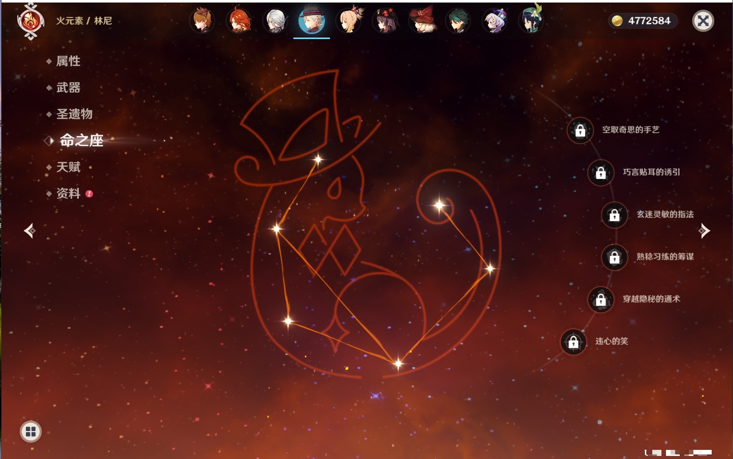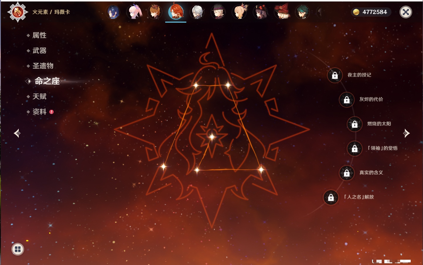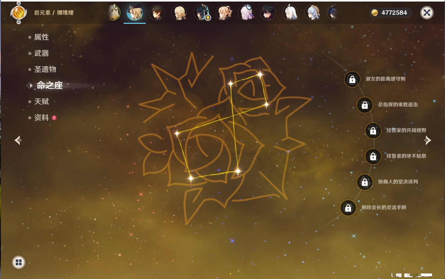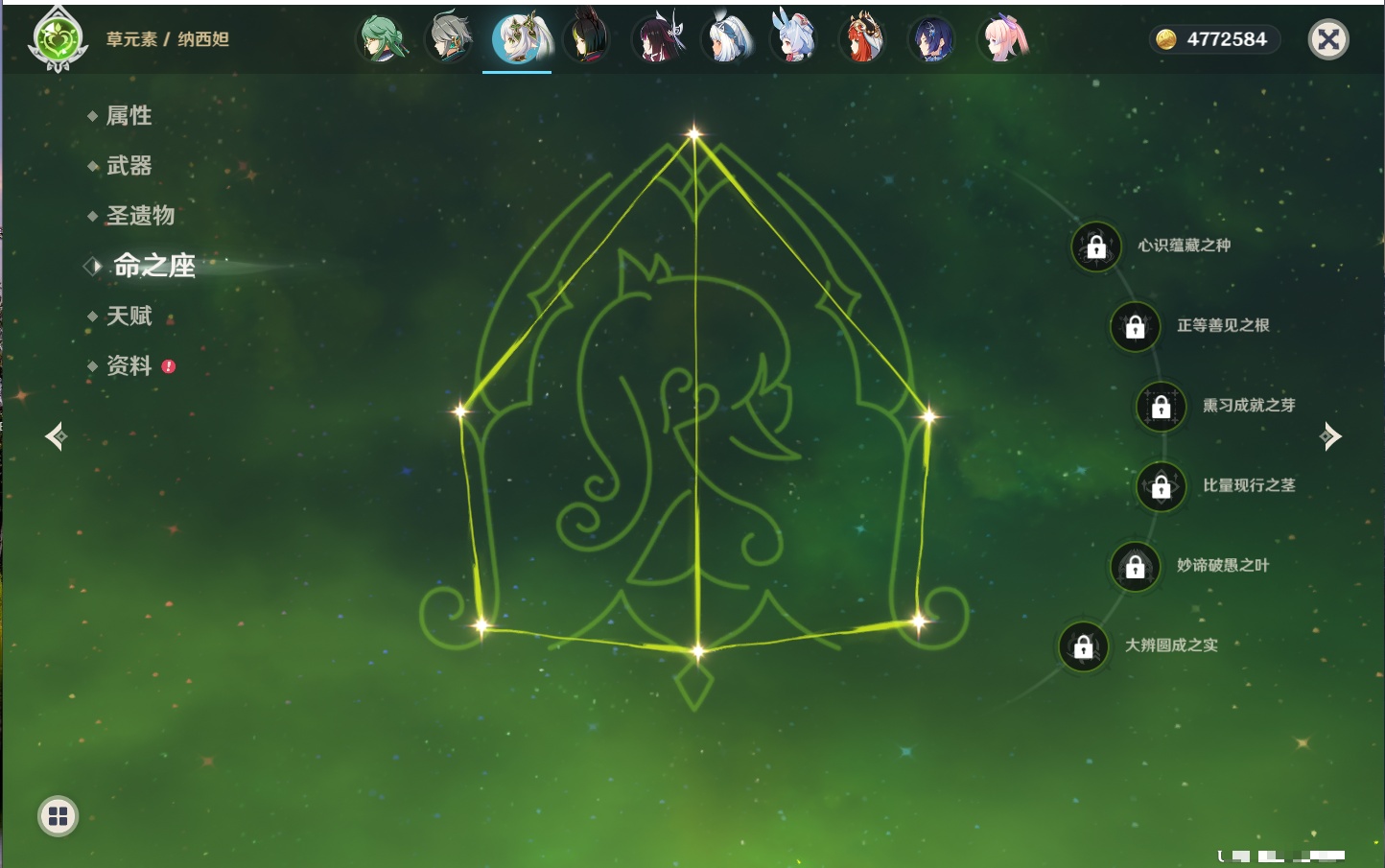 【42个五星角色】,满命那维莱特,满命迪卢克,5命提纳里,4命七七,3命莫娜,2命迪希雅,2命雷电将军,2命刻晴,1命妮露,1命夜兰,1命胡桃,1命琴,0命希格雯,0命克洛琳德,0命阿蕾奇诺,0命闲云,0命芙宁娜,0命莱欧斯利,0命林尼,0命白术,0命艾尔海森,0命流浪者,0命纳西妲,0命八重神子,0命申鹤,0命优菈,0命枫原万叶,0命神里绫华,0命钟离,0命魈,0命宵宫,0命温迪,0命可莉,0命达达利亚,0命珊瑚宫心海,0命希诺宁,0命娜维娅,0命茜特菈莉,0命菈乌玛,0命哥伦比娅,0命玛拉妮,0命玛薇卡,