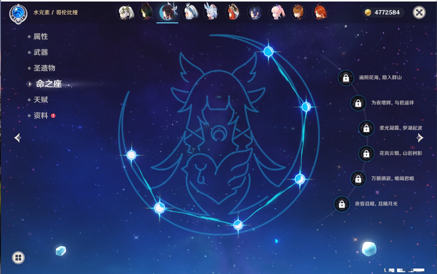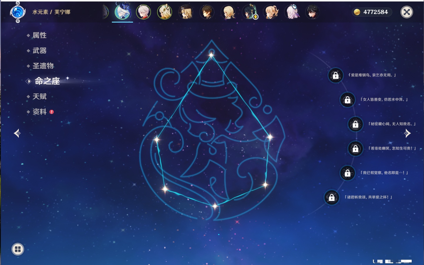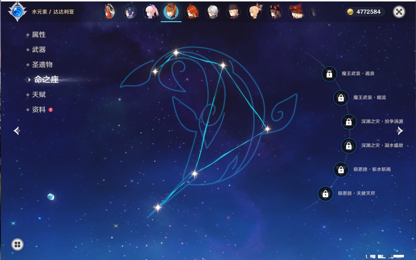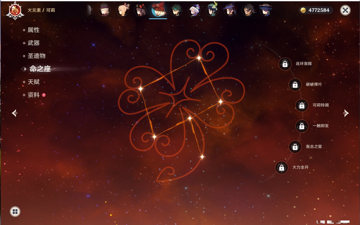 【42个五星角色】,满命那维莱特,满命迪卢克,5命提纳里,4命七七,3命莫娜,2命迪希雅,2命雷电将军,2命刻晴,1命妮露,1命夜兰,1命胡桃,1命琴,0命希格雯,0命克洛琳德,0命阿蕾奇诺,0命闲云,0命芙宁娜,0命莱欧斯利,0命林尼,0命白术,0命艾尔海森,0命流浪者,0命纳西妲,0命八重神子,0命申鹤,0命优菈,0命枫原万叶,0命神里绫华,0命钟离,0命魈,0命宵宫,0命温迪,0命可莉,0命达达利亚,0命珊瑚宫心海,0命希诺宁,0命娜维娅,0命茜特菈莉,0命菈乌玛,0命哥伦比娅,0命玛拉妮,0命玛薇卡,