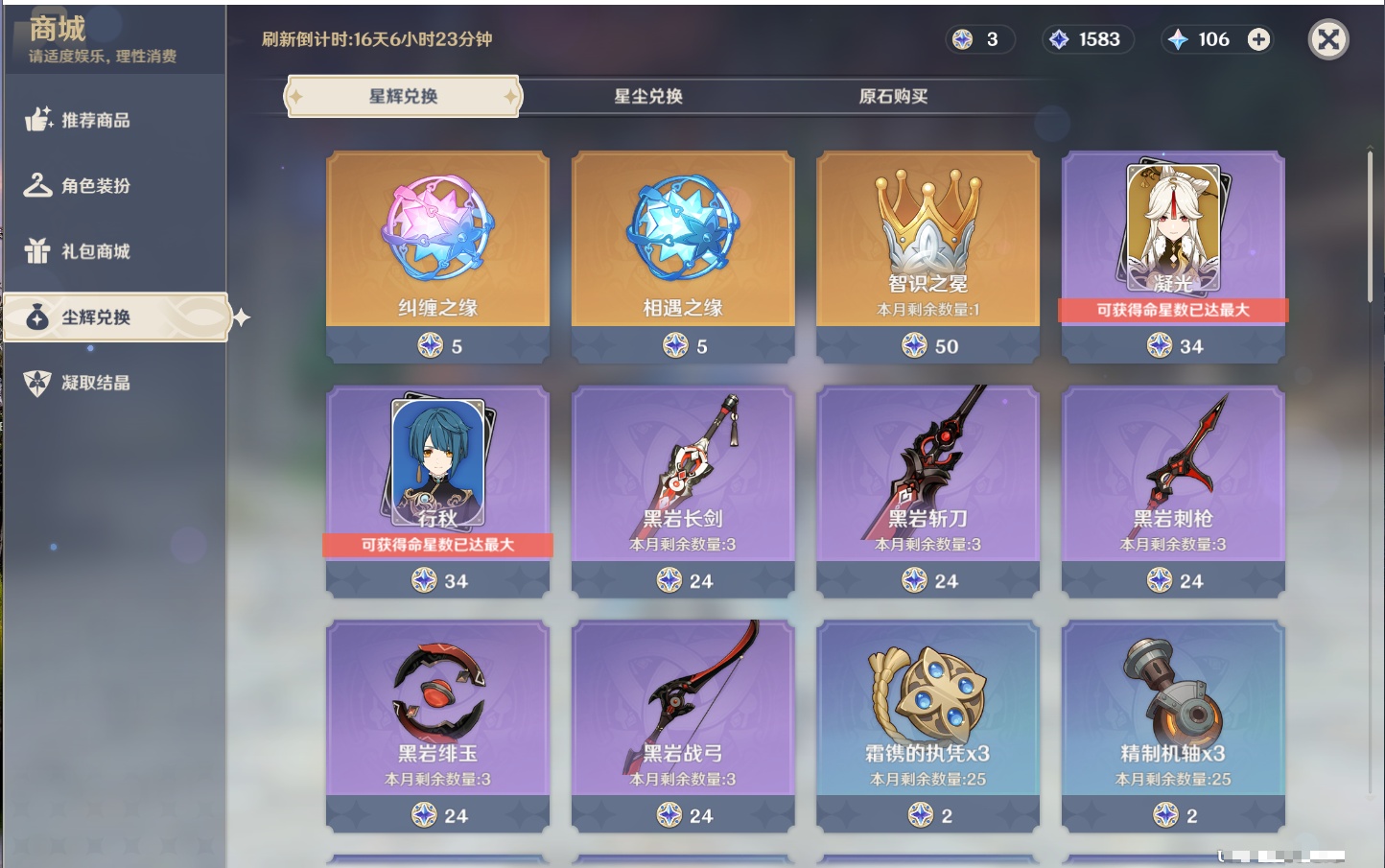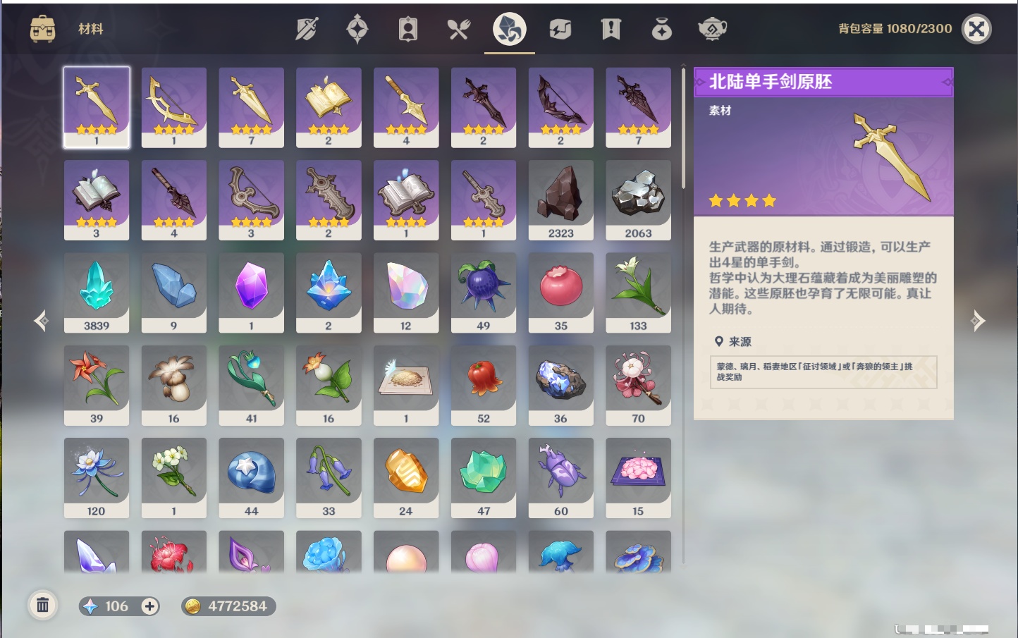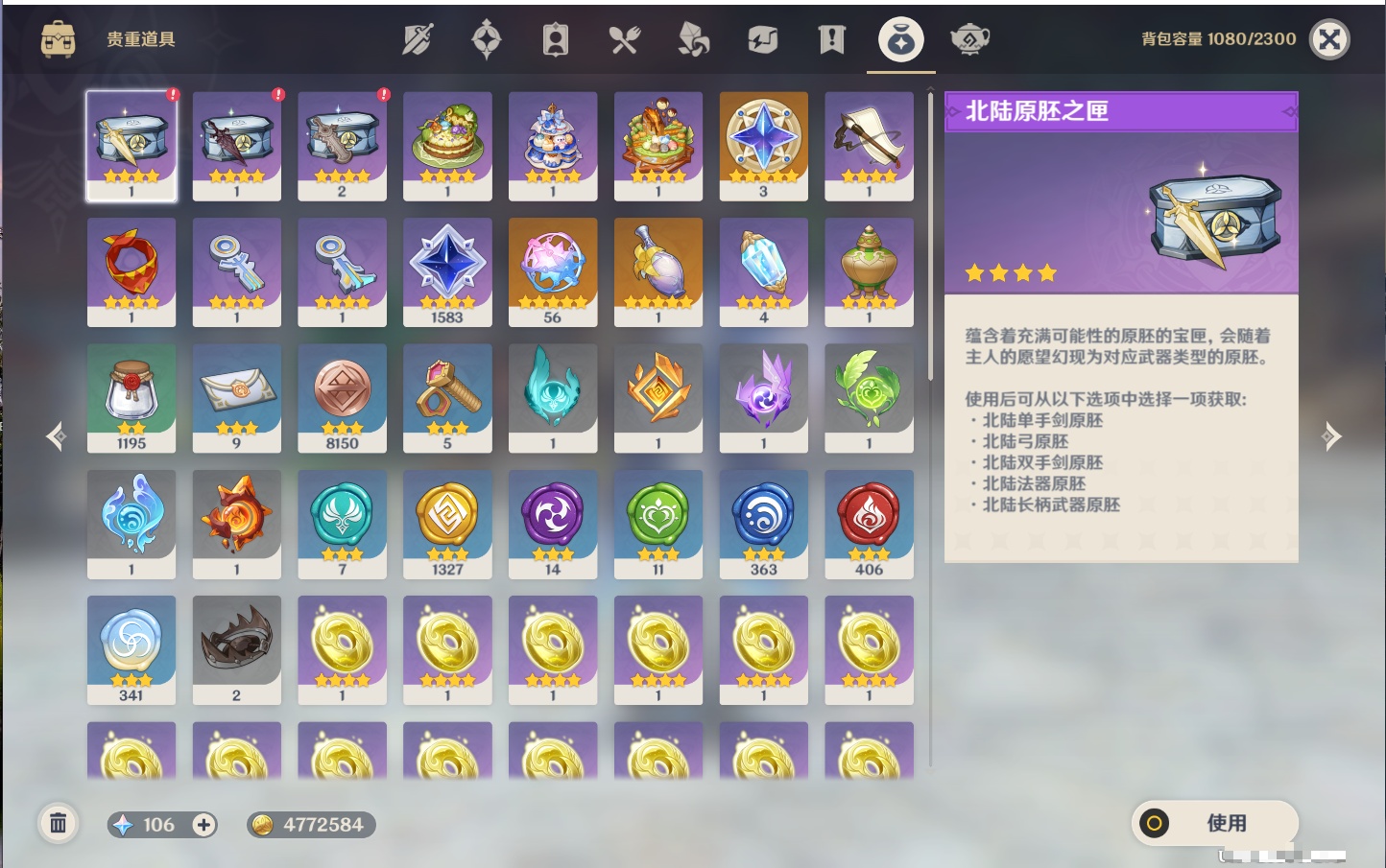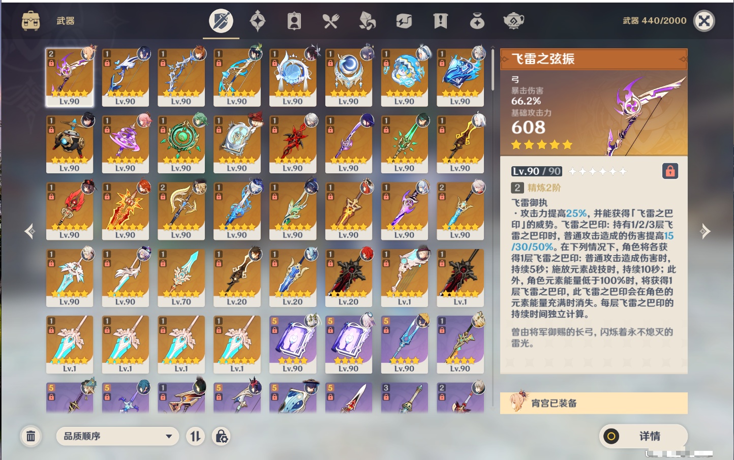 【36个五星武器】,精2飞雷之弦振,精2裁断,精2苍古自由之誓,精1若水,精1冬极白星,精1终末嗟叹之诗,精1帷间夜曲,精1纺夜天镜,精1冲浪时光,精1万世流涌大典,精1金流监督,精1神乐之真意,精1碧落之珑,精1四风原典,精1赤月之形,精1薙草之稻光,精1和璞鸢,精1贯虹之槊,精1护摩之杖,精1焚曜千阳,精1静水流涌之辉,精1裁叶萃光,精1圣显之钥,精1雾切之回光,精1天空之刃,精1风鹰剑,精1天空之脊,精1松籁响起之时,精1狼的末路,精1天空之翼,精1天空之傲,