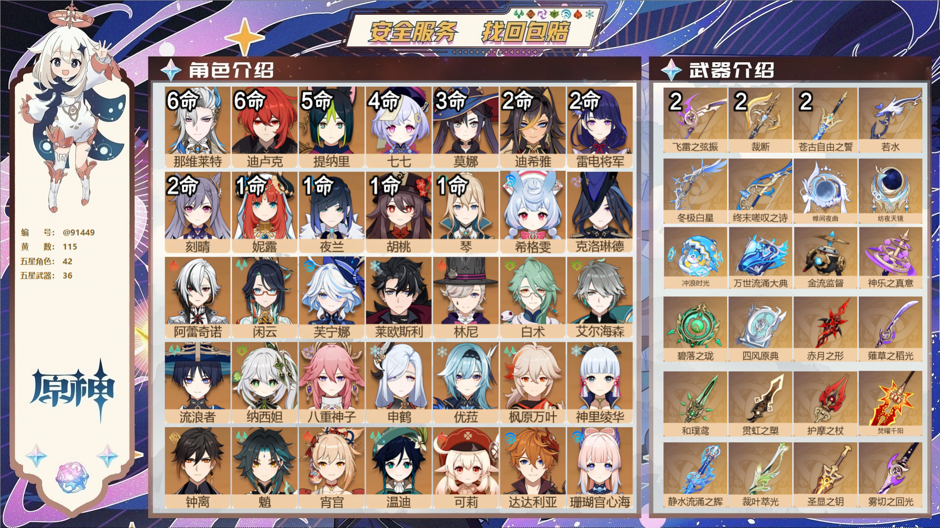 PX_2508976-,送未实名邮箱,,冒险等级60级,女主,115黄,42个五星角色,36个五星武器,纠缠之源56--原石106--圣遗物517--【时装】,聆雨听竹,炽绘奇旅,岁夜欢哗,倩影游侠,雨化竹身,帆影游风,叶隐芳名,