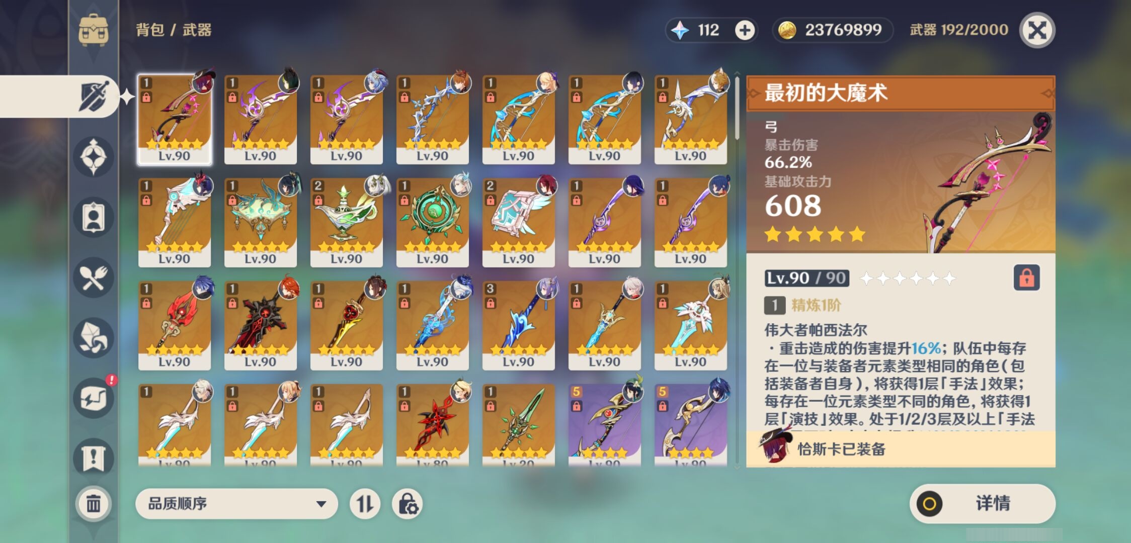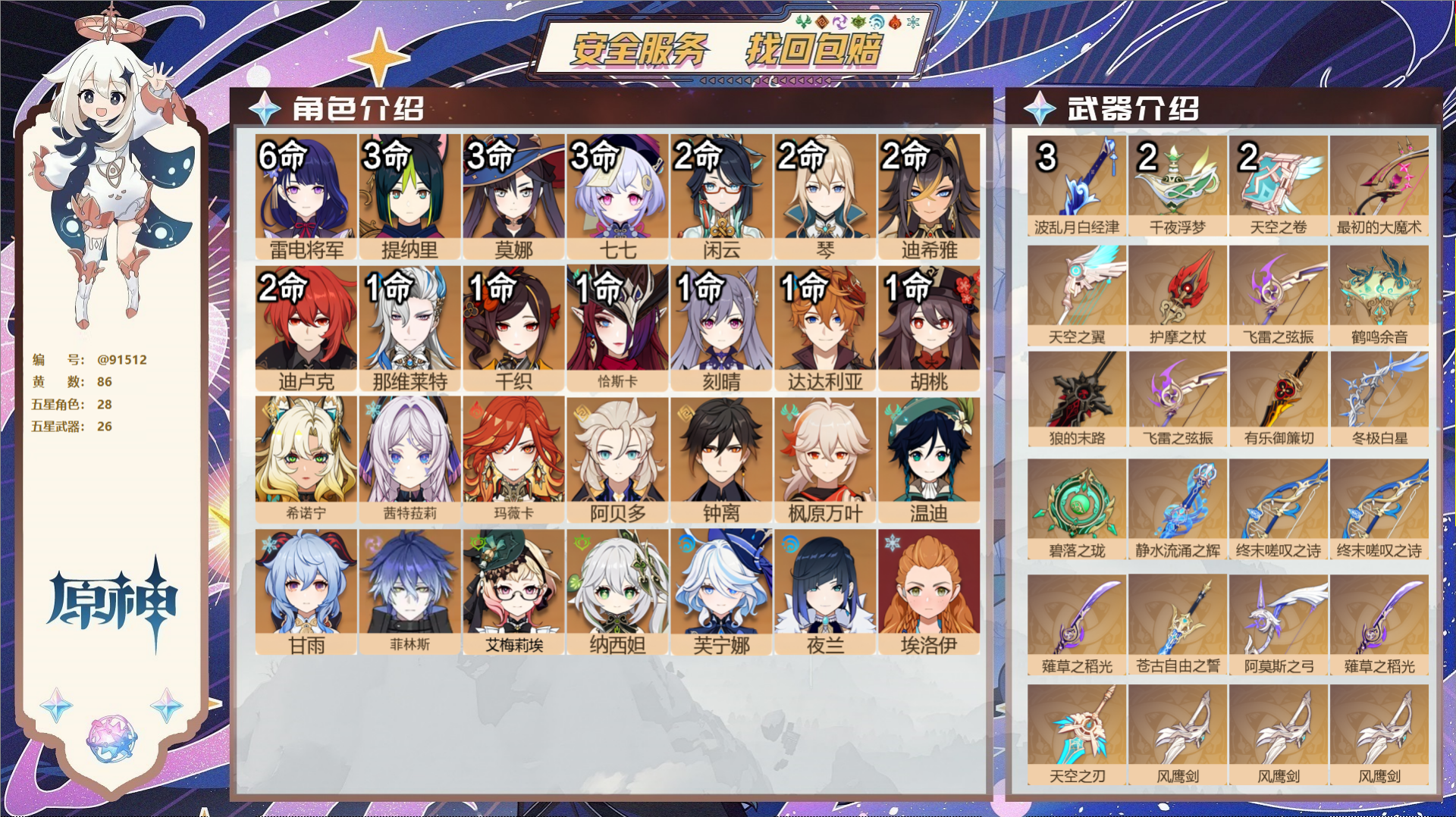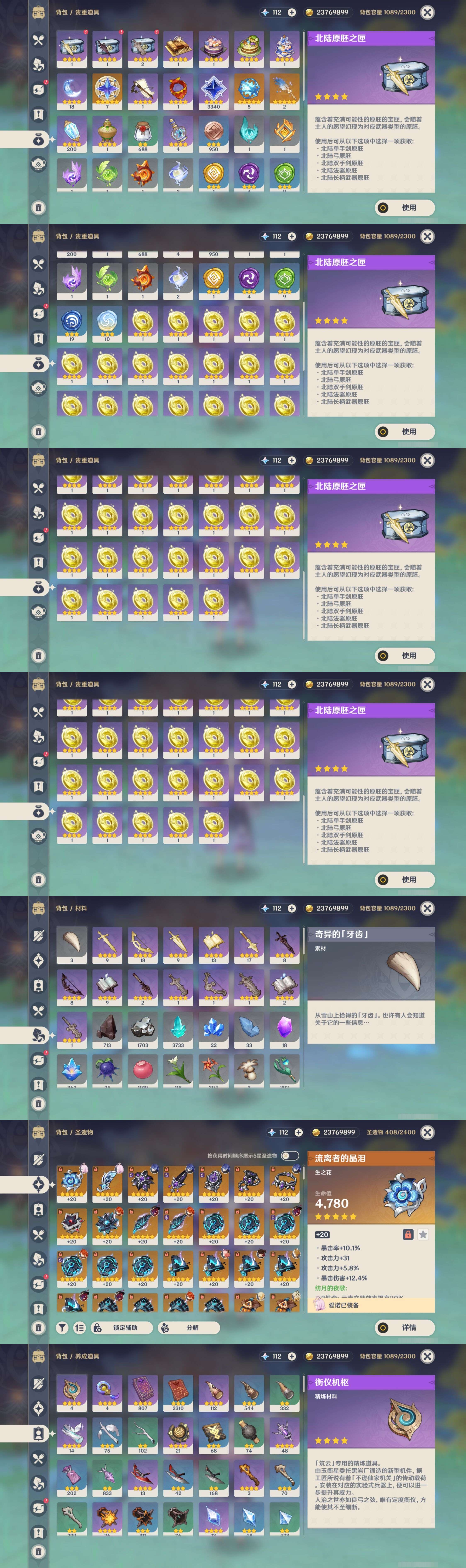 【26个五星武器】,精3波乱月白经津,精2千夜浮梦,精2天空之卷,精1最初的大魔术,精1天空之翼,精1护摩之杖,精1飞雷之弦振,精1鹤鸣余音,精1狼的末路,精1飞雷之弦振,精1有乐御簾切,精1冬极白星,精1碧落之珑,精1静水流涌之辉,精1终末嗟叹之诗,精1终末嗟叹之诗,精1薙草之稻光,精1苍古自由之誓,精1阿莫斯之弓,精1薙草之稻光,精1天空之刃,精1风鹰剑,精1风鹰剑,精1风鹰剑,精1赤月之形,精1和璞鸢,7套,