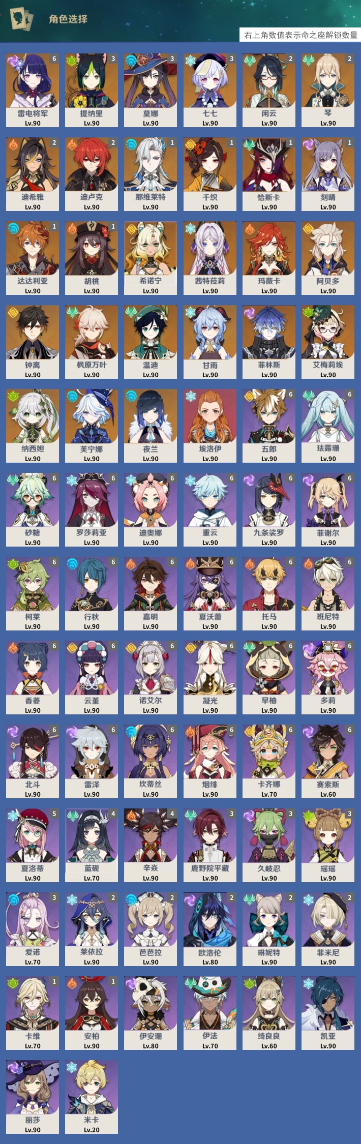 【28个五星角色】,满命雷电将军,3命提纳里,3命莫娜,3命七七,2命闲云,2命琴,2命迪希雅,2命迪卢克,1命那维莱特,1命千织,1命恰斯卡,1命刻晴,1命达达利亚,1命胡桃,0命希诺宁,0命茜特菈莉,0命玛薇卡,0命阿贝多,0命钟离,0命枫原万叶,0命温迪,0命甘雨,0命菲林斯,0命艾梅莉埃,0命纳西妲,0命芙宁娜,0命夜兰,0命埃洛伊,
