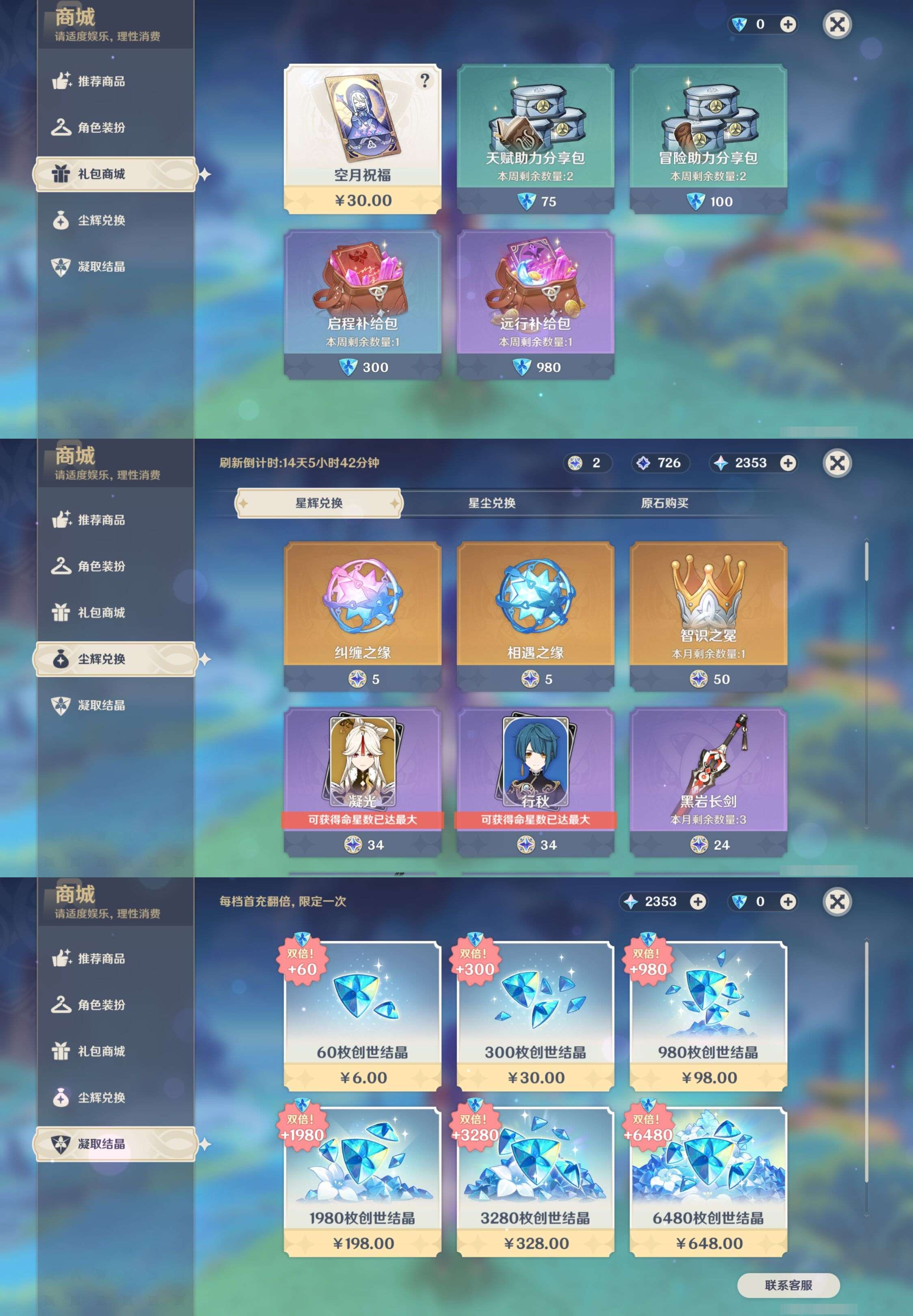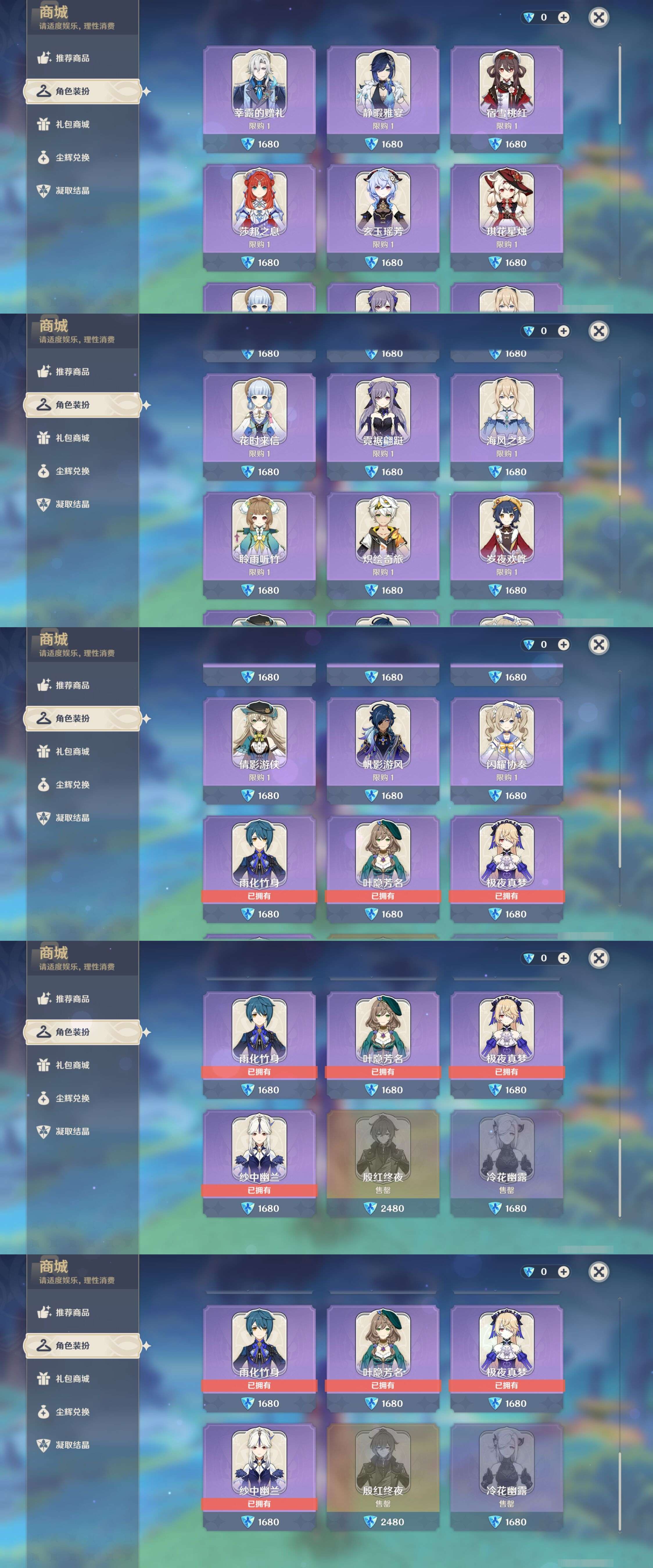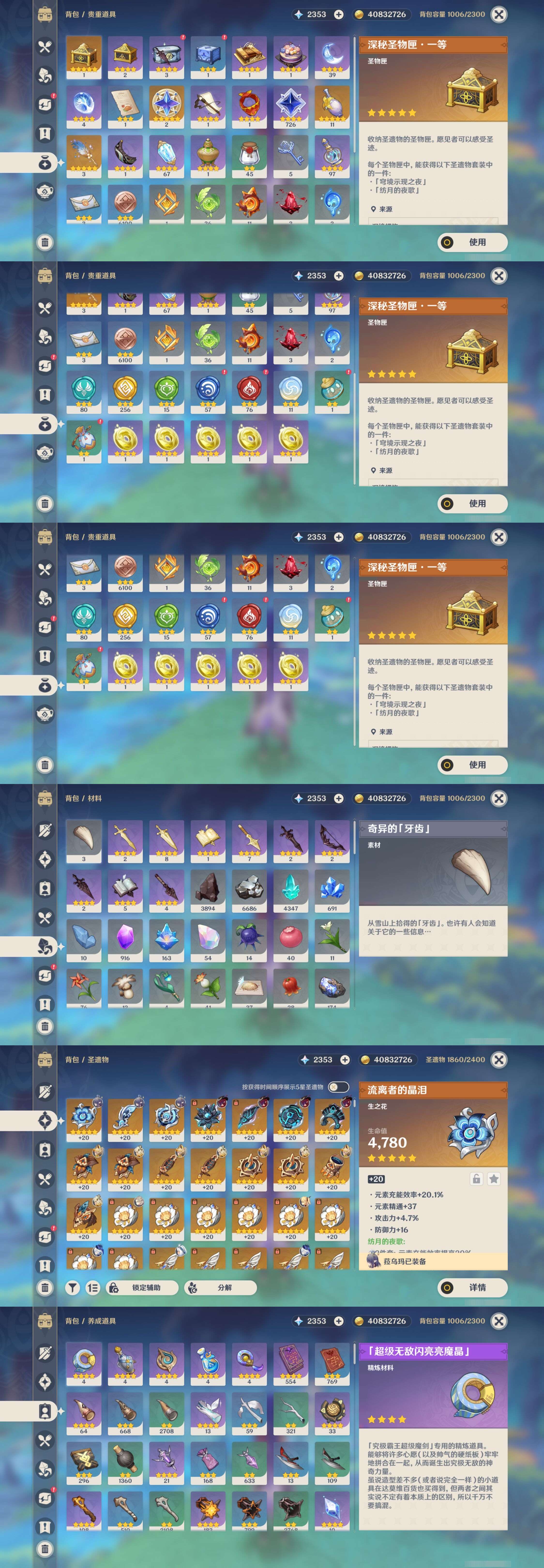 PX_2512963-,邮箱不出售,不送TAP,冒险等级60级,女主,66黄,33个五星角色,12个五星武器,纠缠之源0--原石2353--圣遗物1860--【时装】,叶隐芳名,冷花幽露,殷红终夜,极夜真梦,雨化竹身,纱中幽兰,