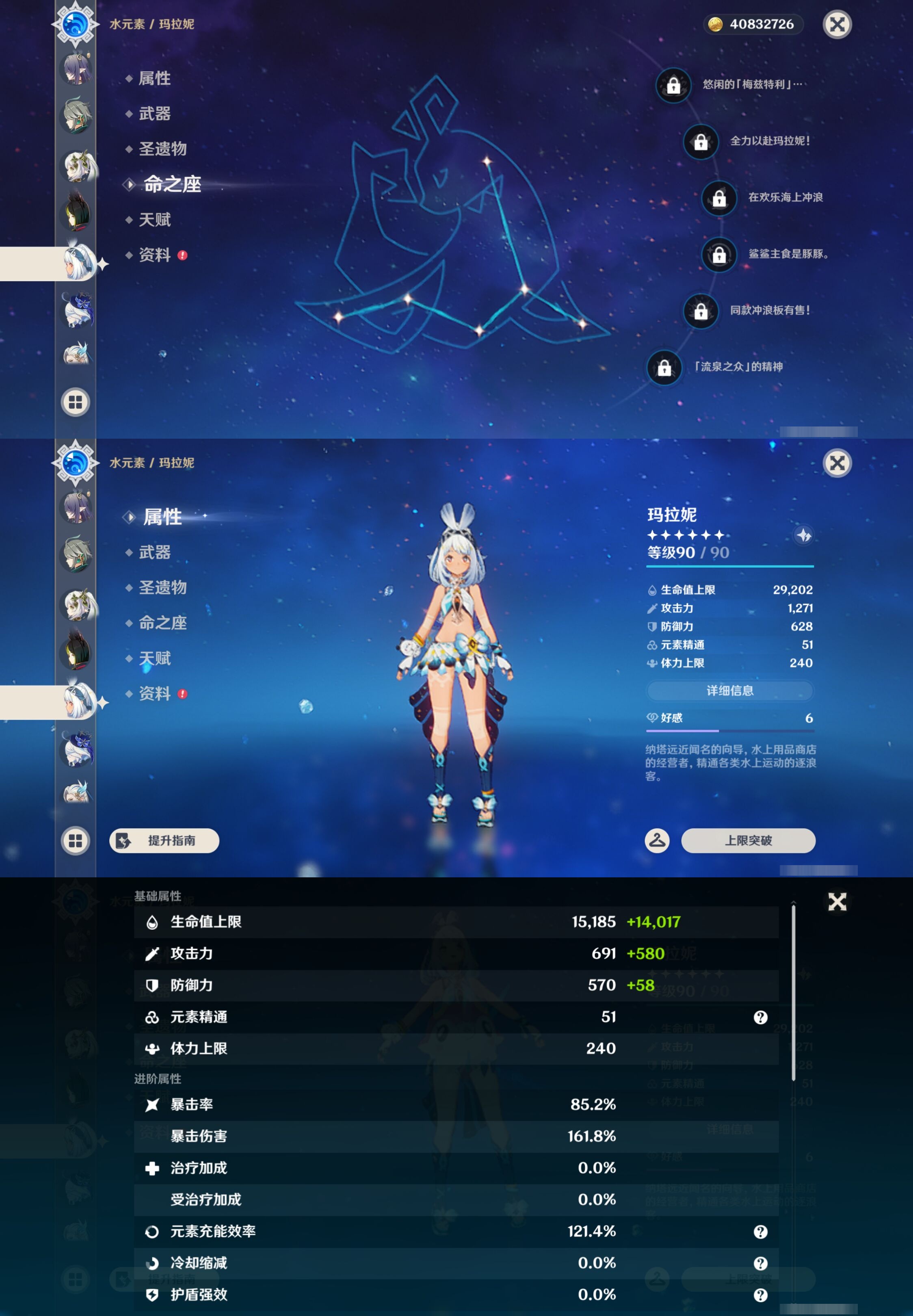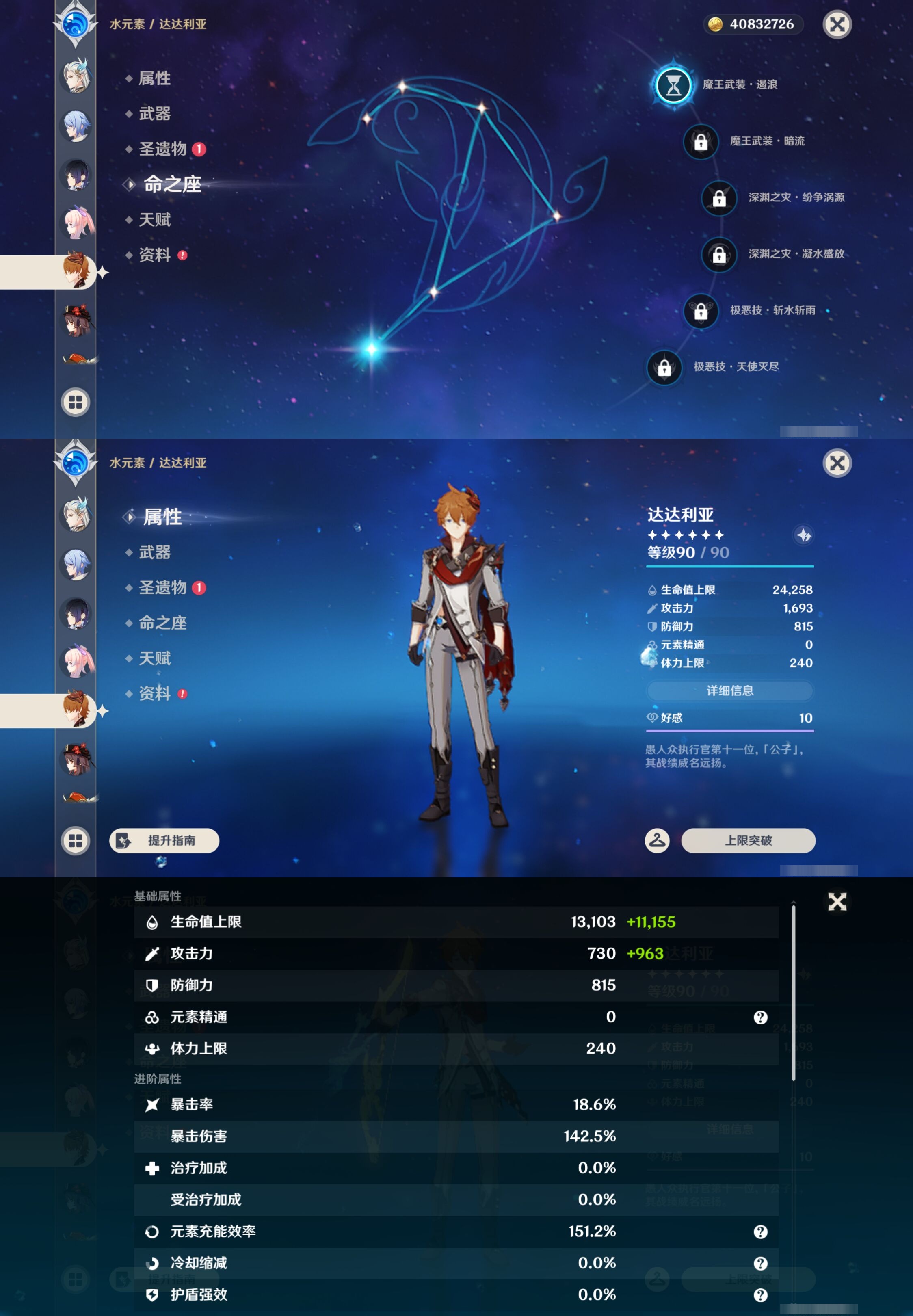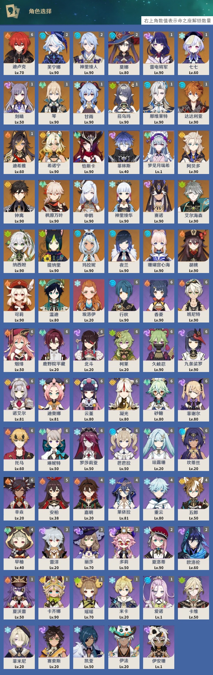 【33个五星角色】,满命迪卢克,2命芙宁娜,2命神里绫人,2命莫娜,1命雷电将军,1命七七,1命刻晴,1命琴,1命甘雨,1命菈乌玛,1命那维莱特,1命达达利亚,1命迪希雅,0命希诺宁,0命恰斯卡,0命菲林斯,0命梦见月瑞希,0命阿贝多,0命钟离,0命枫原万叶,0命申鹤,0命神里绫华,0命赛诺,0命艾尔海森,0命纳西妲,0命提纳里,0命玛拉妮,0命夜兰,0命珊瑚宫心海,0命胡桃,0命可莉,0命温迪,0命埃洛伊,
