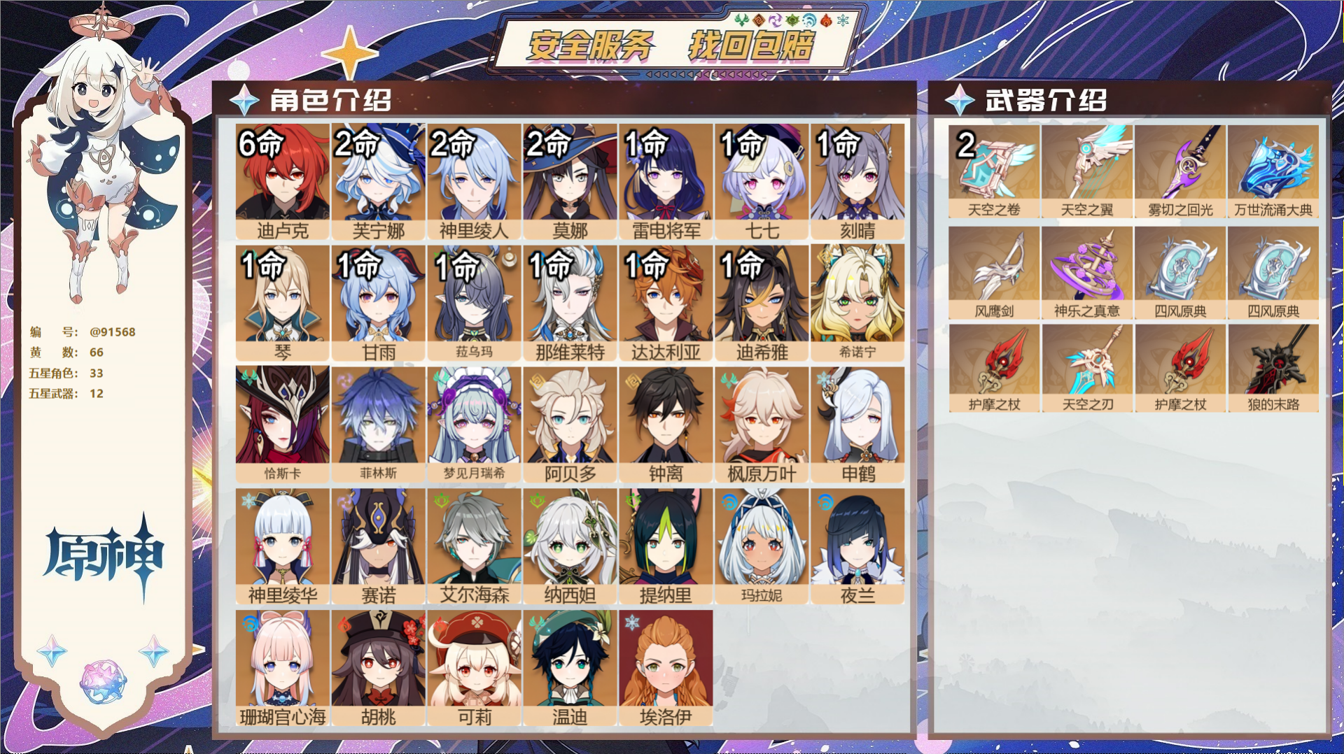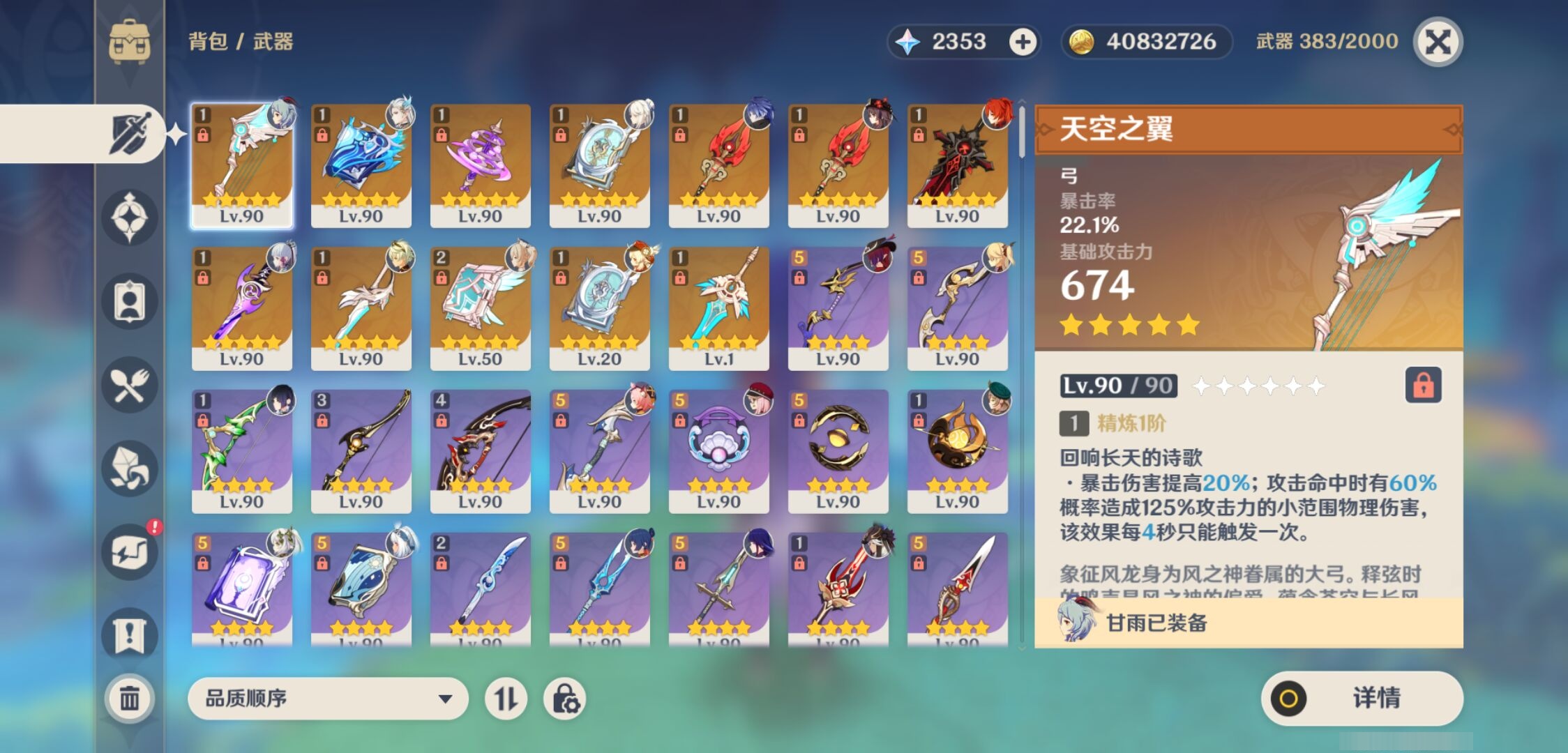 【12个五星武器】,精2天空之卷,精1天空之翼,精1雾切之回光,精1万世流涌大典,精1风鹰剑,精1神乐之真意,精1四风原典,精1四风原典,精1护摩之杖,精1天空之刃,精1护摩之杖,精1狼的末路,6套,