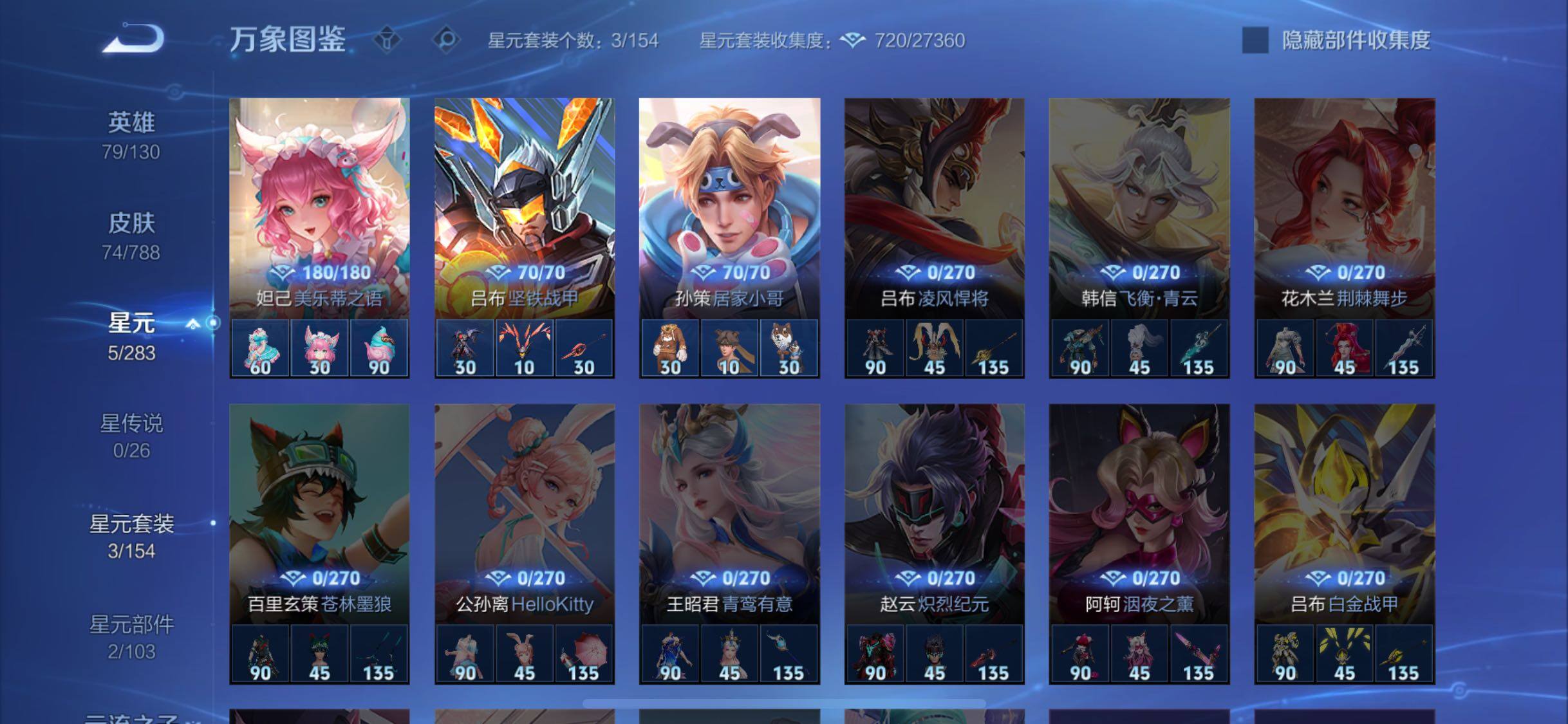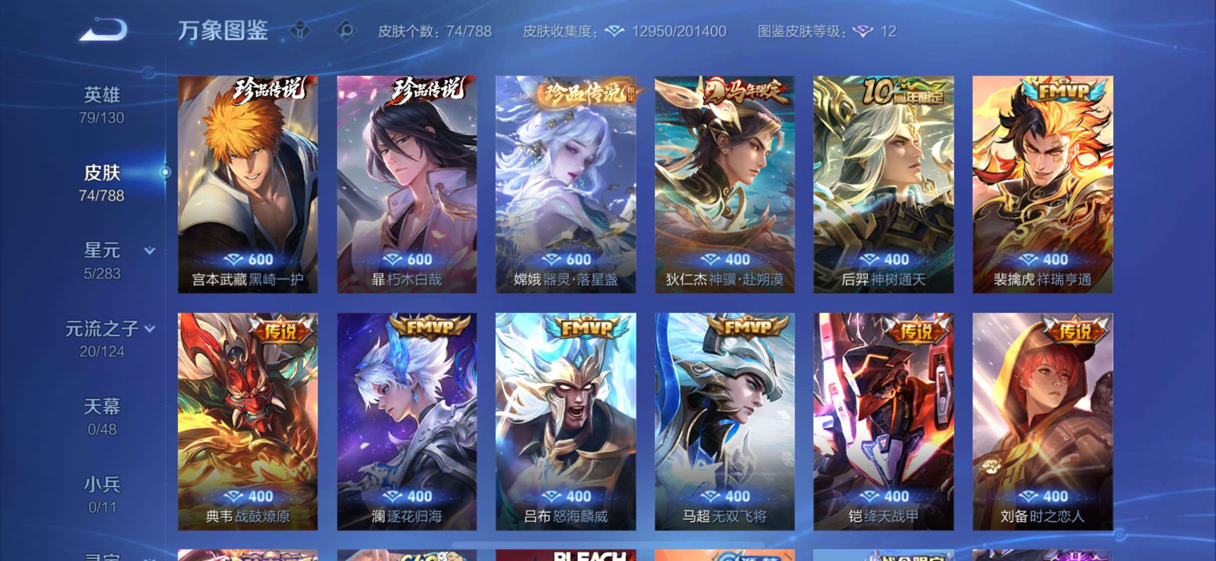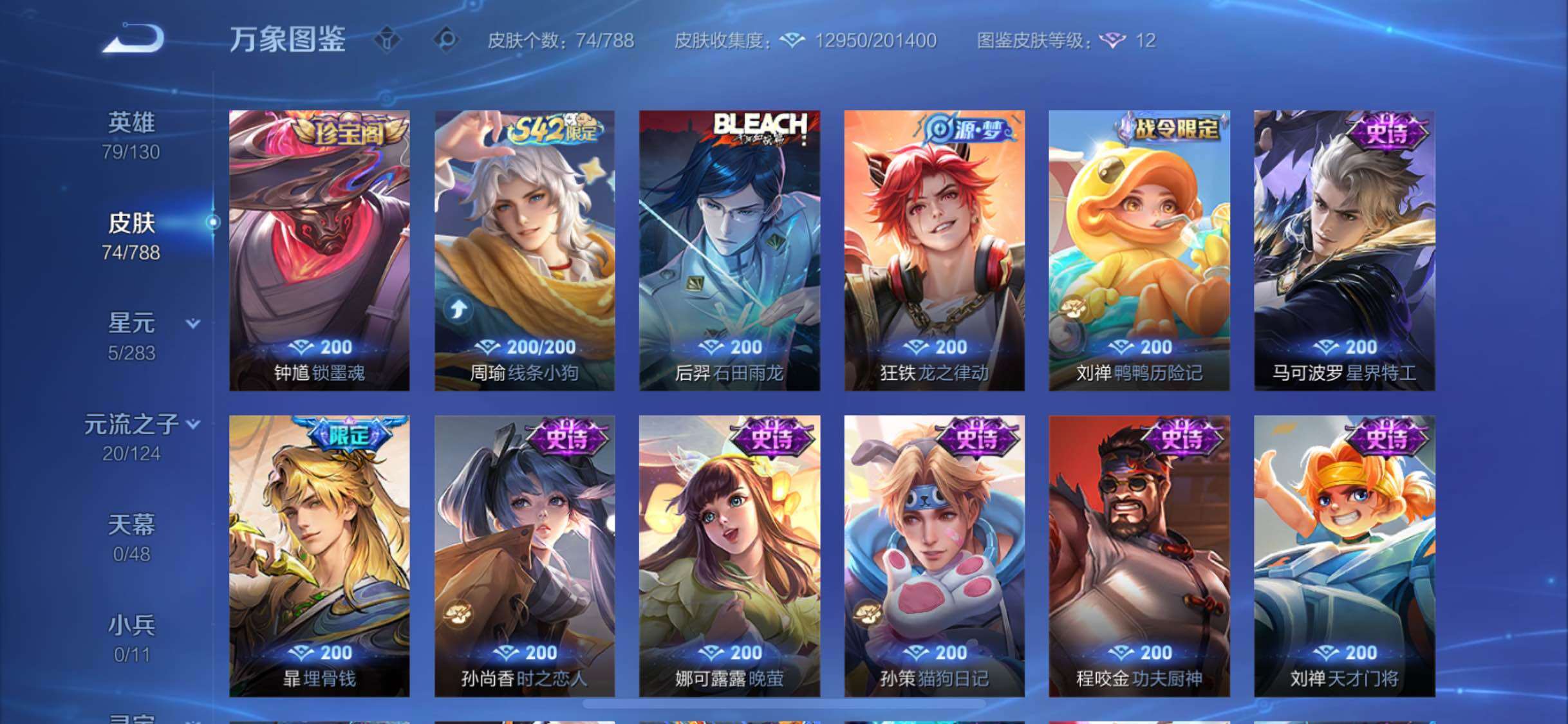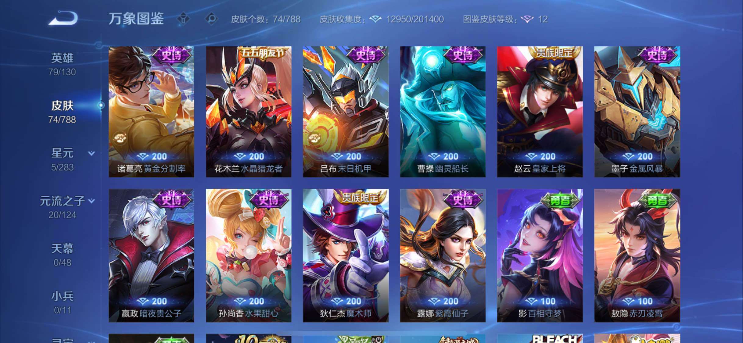 【史诗皮肤】:钟馗锁墨魂,周瑜线条小狗,后羿石田雨龙,狂铁龙之律动,刘禅鸭鸭历险记,马可波罗星界特工,暃埋骨钱,孙尚香时之恋人,娜可露露晚萤,狄仁杰鹰眼统帅,孙策猫狗日记,程咬金功夫厨神,刘禅天才门将,诸葛亮黄金分割率,花木兰水晶猎龙者,吕布末日机甲,曹操幽灵船长,墨子金属风暴,嬴政暗夜贵公子,孙尚香水果甜心,狄仁杰魔术师,赵云皇家上将,露娜紫霞仙子