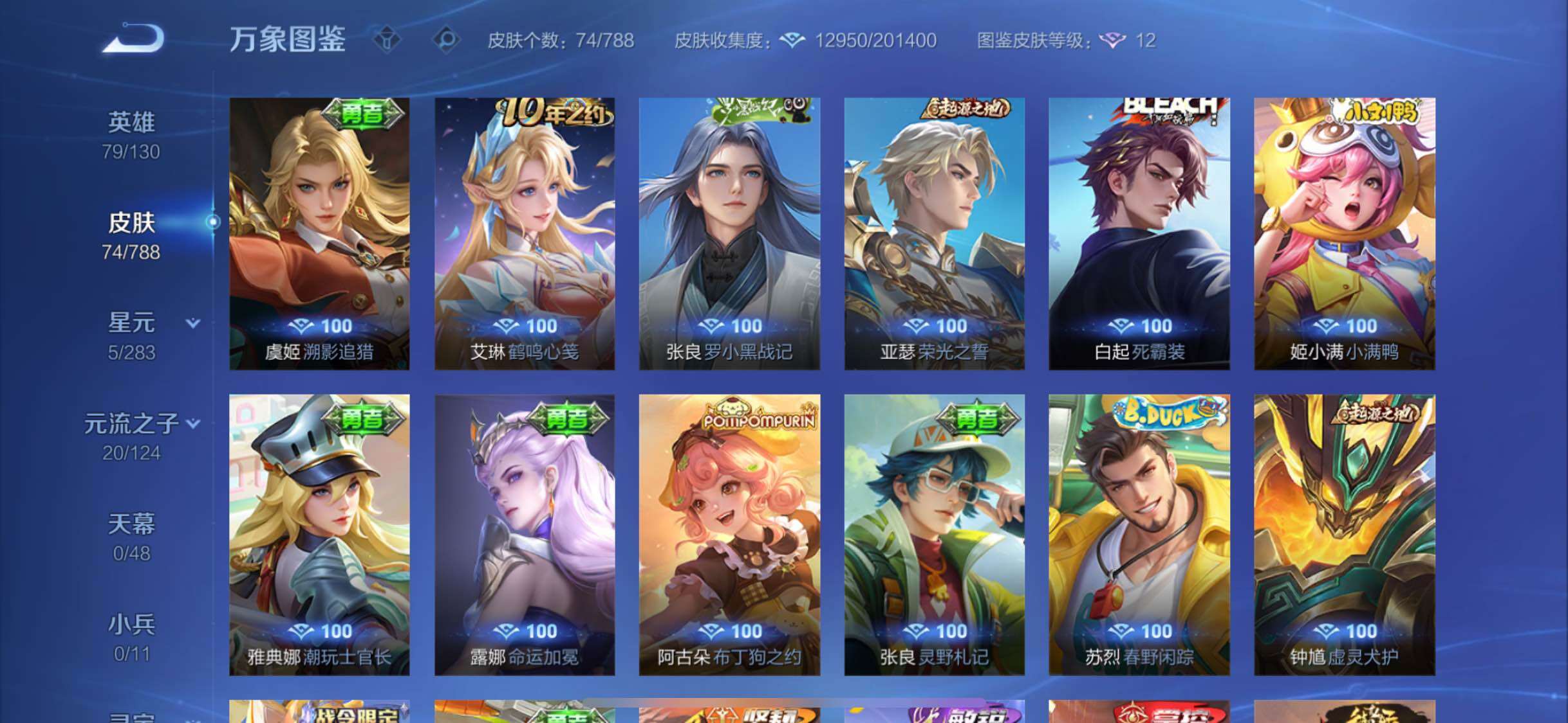 【其他皮肤】:影百相守梦,虞姬溯影追猎,艾琳鹤鸣心笺,张良罗小黑战记,亚瑟荣光之誓,白起死霸装,姬小满小满鸭,雅典娜潮玩士官长,露娜命运加冕,阿古朵布丁狗之约,张良灵野札记,苏烈春野闲踪,沈梦溪鸭鸭历险记,钟馗虚灵犬护,马可波罗潮玩牛仔,苏烈坚韧之力,李白敏锐之力,诸葛亮掌控之力,刘备汉昭烈帝,狄仁杰阴阳师,亚瑟死亡骑士,韩信街头霸王,项羽海滩派对,司空震启蛰,镜冰刃幻境,曜归虚梦演,李信灼热之刃,司马懿魇语军师,裴擒虎街头旋风,公孙离花间舞,梦奇美梦成真,铠龙域领主,东皇太一东海龙王,夏侯惇战争骑士,虞姬加勒比小姐,兰陵王隐刃,后羿精灵王,花木兰剑舞者