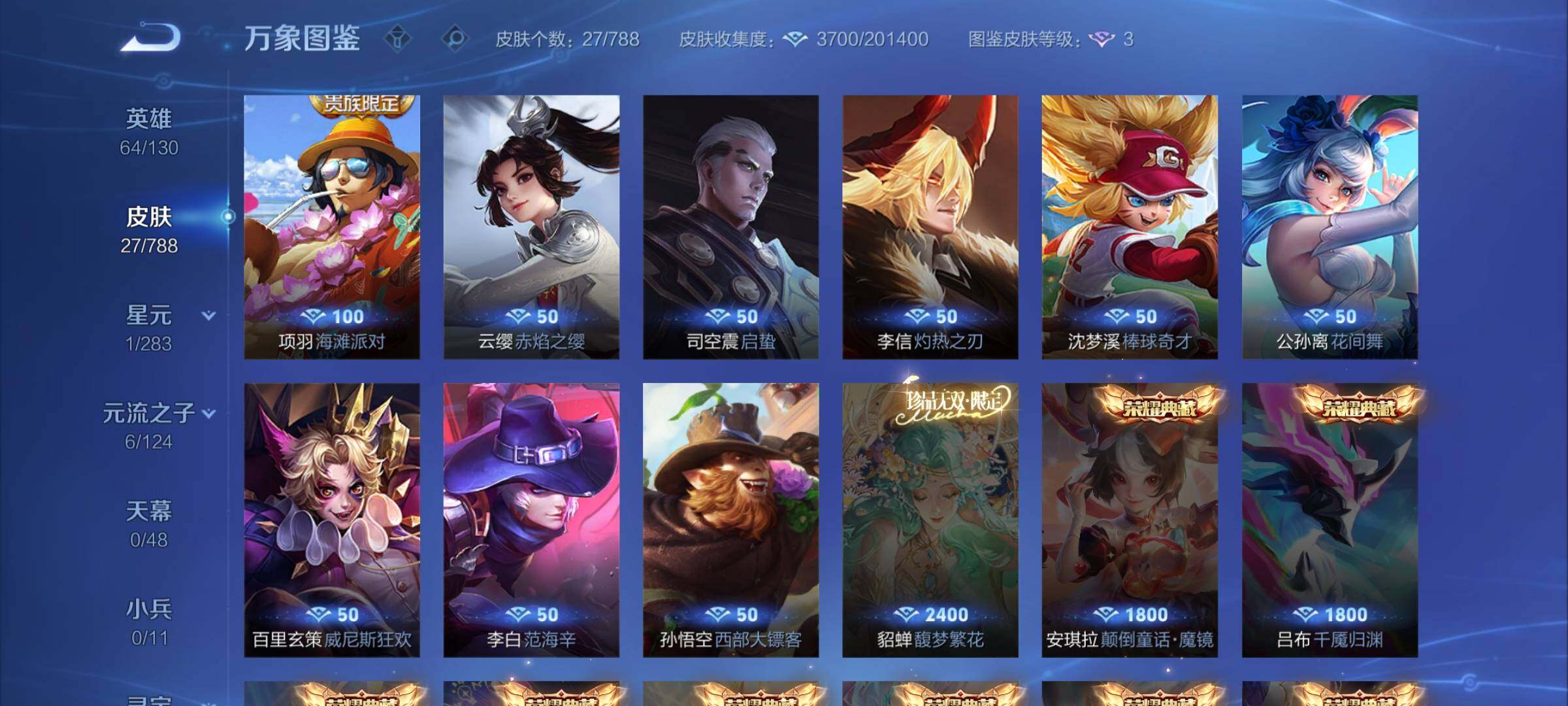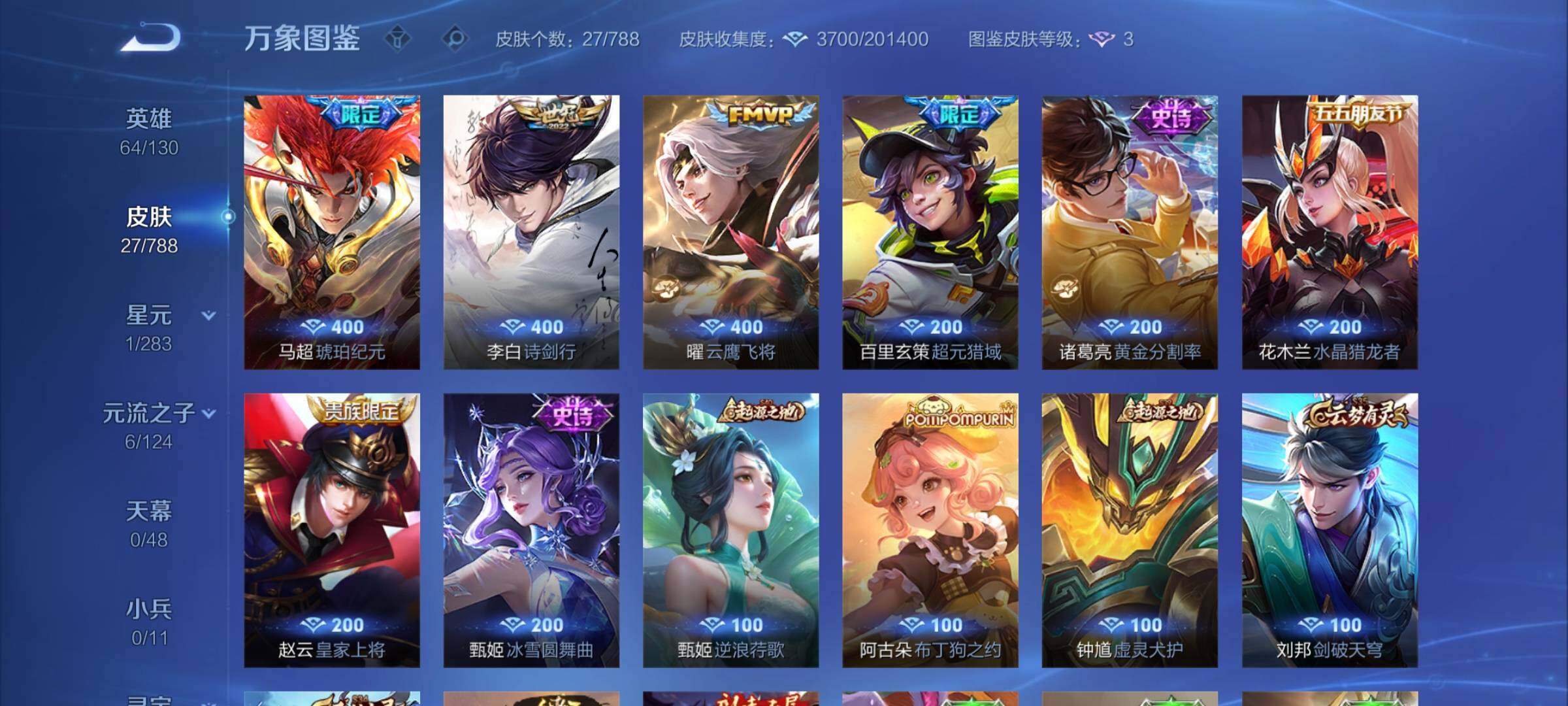 【限定皮肤】:赵云皇家上将,项羽海滩派对,鬼谷子天穹祈灯,马超琥珀纪元,百里玄策超元猎域,刘邦剑破天穹