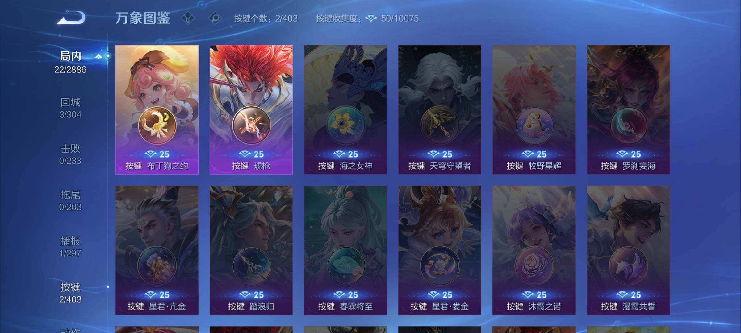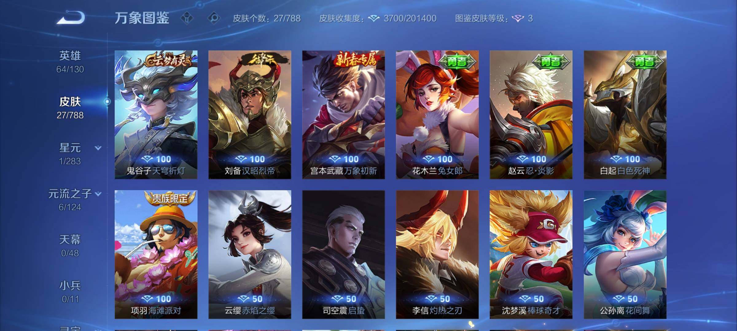 【其他皮肤】:甄姬逆浪荇歌,阿古朵布丁狗之约,钟馗虚灵犬护,刘邦剑破天穹,鬼谷子天穹祈灯,刘备汉昭烈帝,宫本武藏万象初新,花木兰兔女郎,白起白色死神,赵云忍炎影,项羽海滩派对,云缨赤焰之缨,司空震启蛰,李信灼热之刃,沈梦溪棒球奇才,公孙离花间舞,百里玄策威尼斯狂欢,李白范海辛,孙悟空西部大镖客
