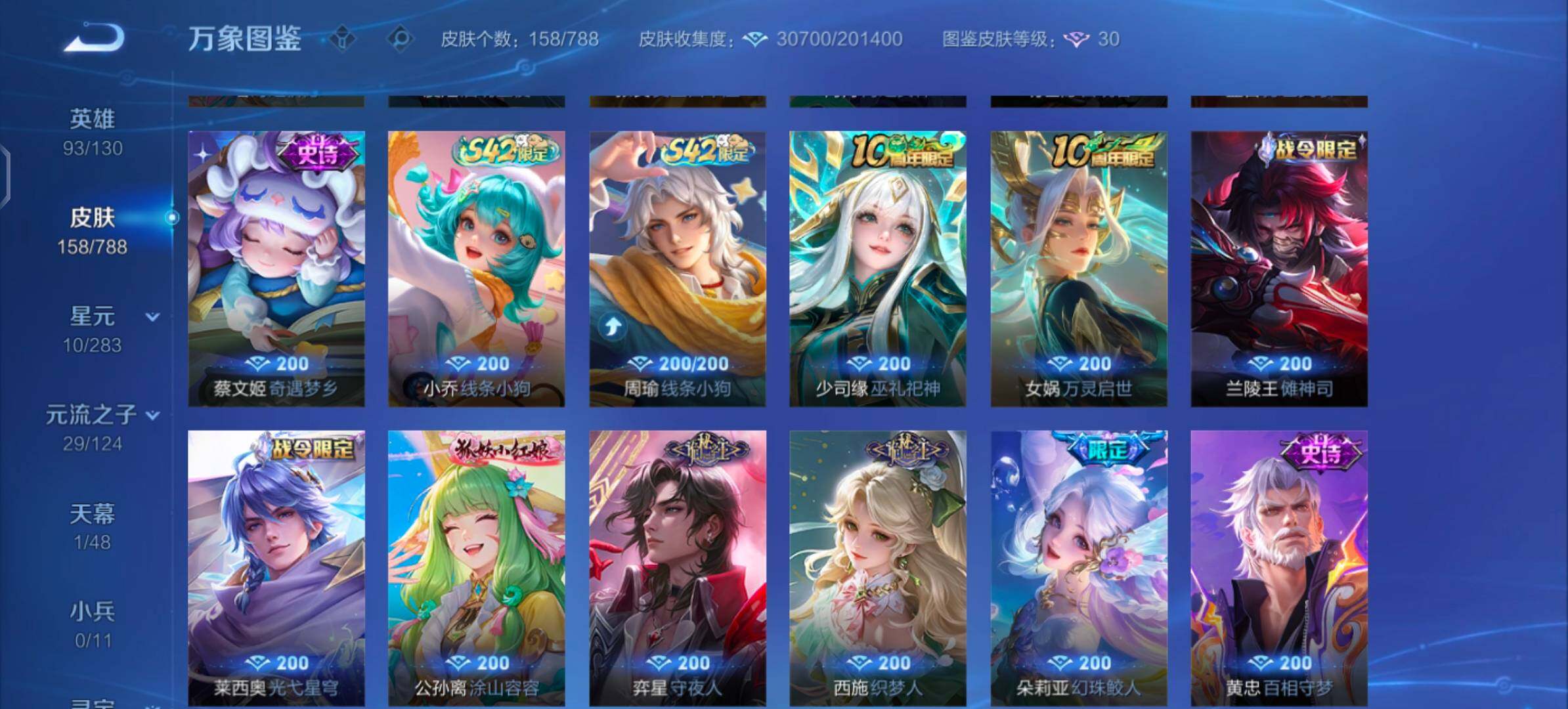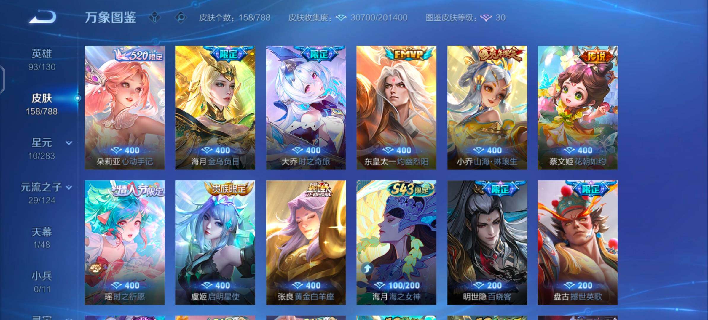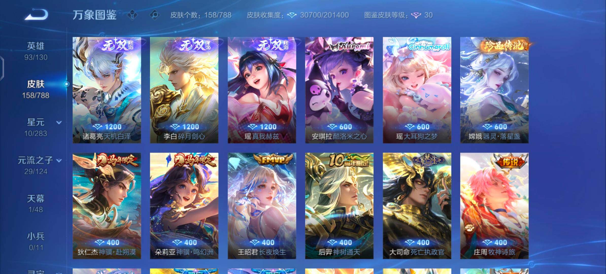 【史诗皮肤】:明世隐百晓客,盘古撼世英歌,蔡文姬奇遇梦乡,周瑜线条小狗,小乔线条小狗,少司缘巫礼祀神,女娲万灵启世,兰陵王傩神司,莱西奥光弋星穹,公孙离涂山容容,弈星守夜人,西施织梦人,朵莉亚幻珠鲛人,黄忠百相守梦,周瑜百相守梦,牛魔小牛鸭,亚瑟布丁狗之誓,狂铁龙之律动,刘禅鸭鸭历险记,赵怀真器灵浮梦炉,弈星万物之道,艾琳陌上桑,弈星炽弈燎原,大司命东方月初,少司缘涂山红红,明世隐夜落电台,桑启奇遇星旅,鲁班七号蔬乡物语,安琪拉乘龙聚宝船,妲己灵卜魔法,海月浮梦罗烟,蔡文姬电玩兔顽号,瑶山海碧波行,元歌无心,妲己时之奇旅,张良千筹问战,艾琳奇遇舞章,杨玉环寅虎心曲,安琪拉时之奇旅,沈梦溪月团寄思,大乔白鹤梁神女,米莱狄胡桃异想国,孙尚香时之恋人,瑶遇见神鹿,小乔青蛇,大乔白蛇,妲己时之彼端,狄仁杰鹰眼统帅,大乔猫狗日记,孙策猫狗日记,蔡文姬舞动绿茵,安琪拉心灵骇客,亚瑟心灵战警,兰陵王暗隐猎兽者,小乔缤纷独角兽,张飞乱世虎臣,妲己热情桑巴,刘禅绅士熊喵,墨子金属风暴,妲己女仆咖啡,妲己魅力维加斯,嬴政摇滚巨星,孙尚香水果甜心,狄仁杰魔术师,王昭君偶像歌手,甄姬冰雪圆舞曲,赵云皇家上将
