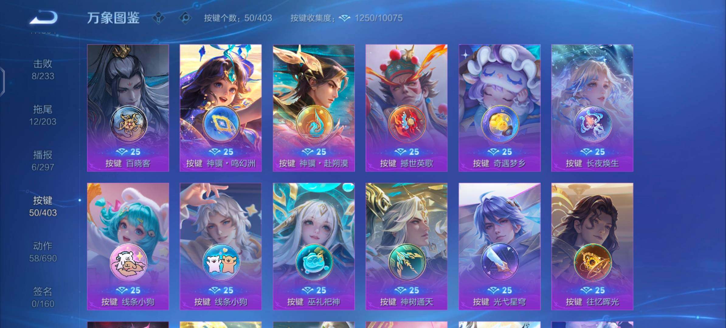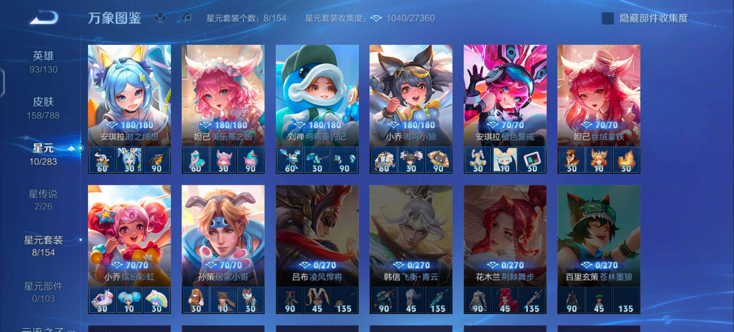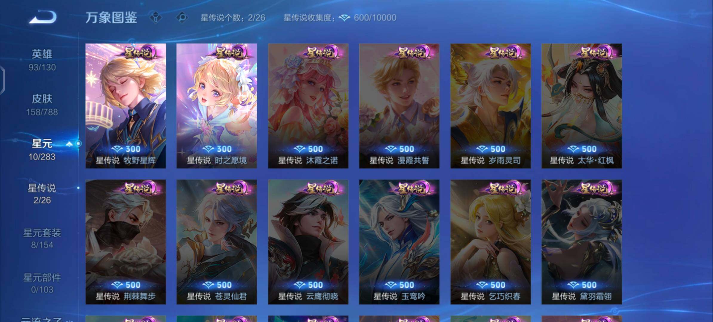 【史诗皮肤】:明世隐百晓客,盘古撼世英歌,蔡文姬奇遇梦乡,周瑜线条小狗,小乔线条小狗,少司缘巫礼祀神,女娲万灵启世,兰陵王傩神司,莱西奥光弋星穹,公孙离涂山容容,弈星守夜人,西施织梦人,朵莉亚幻珠鲛人,黄忠百相守梦,周瑜百相守梦,牛魔小牛鸭,亚瑟布丁狗之誓,狂铁龙之律动,刘禅鸭鸭历险记,赵怀真器灵浮梦炉,弈星万物之道,艾琳陌上桑,弈星炽弈燎原,大司命东方月初,少司缘涂山红红,明世隐夜落电台,桑启奇遇星旅,鲁班七号蔬乡物语,安琪拉乘龙聚宝船,妲己灵卜魔法,海月浮梦罗烟,蔡文姬电玩兔顽号,瑶山海碧波行,元歌无心,妲己时之奇旅,张良千筹问战,艾琳奇遇舞章,杨玉环寅虎心曲,安琪拉时之奇旅,沈梦溪月团寄思,大乔白鹤梁神女,米莱狄胡桃异想国,孙尚香时之恋人,瑶遇见神鹿,小乔青蛇,大乔白蛇,妲己时之彼端,狄仁杰鹰眼统帅,大乔猫狗日记,孙策猫狗日记,蔡文姬舞动绿茵,安琪拉心灵骇客,亚瑟心灵战警,兰陵王暗隐猎兽者,小乔缤纷独角兽,张飞乱世虎臣,妲己热情桑巴,刘禅绅士熊喵,墨子金属风暴,妲己女仆咖啡,妲己魅力维加斯,嬴政摇滚巨星,孙尚香水果甜心,狄仁杰魔术师,王昭君偶像歌手,甄姬冰雪圆舞曲,赵云皇家上将