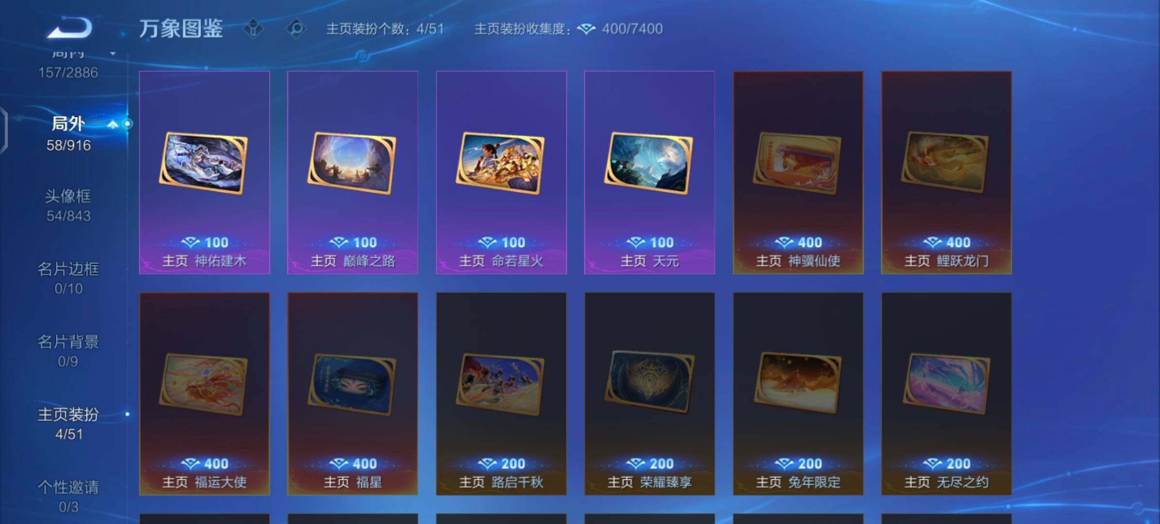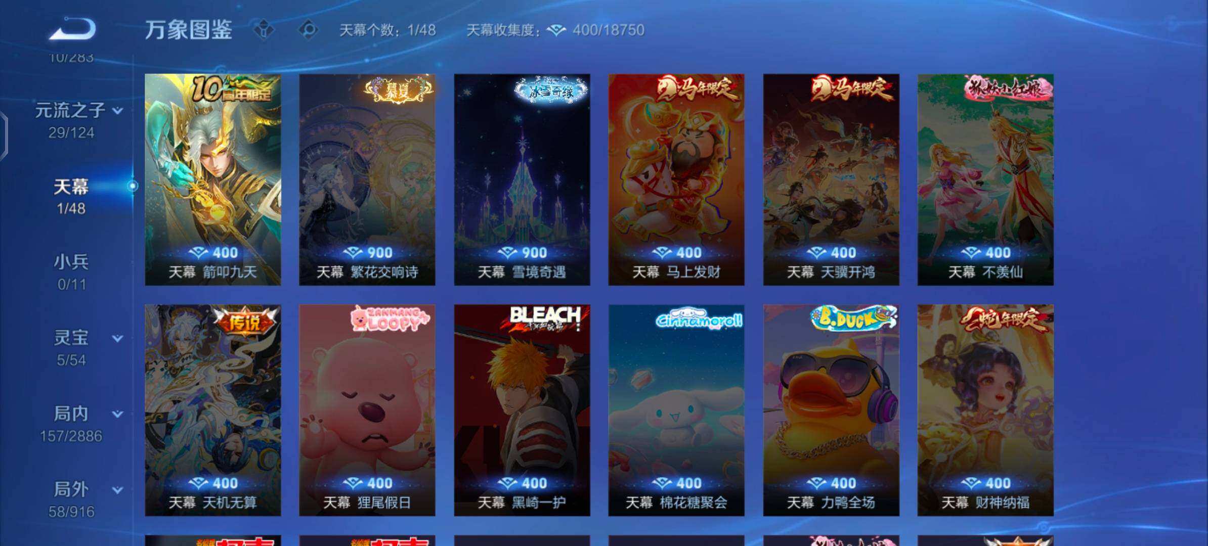 【战令限定】:米莱狄胡桃异想国,妲己灵卜魔法,鲁班七号蔬乡物语,刘禅鸭鸭历险记,沈梦溪鸭鸭历险记,周瑜百相守梦,孙策百相守梦,兰陵王傩神司,莱西奥光弋星穹,明世隐往忆晖光,周瑜线条小狗,小乔线条小狗