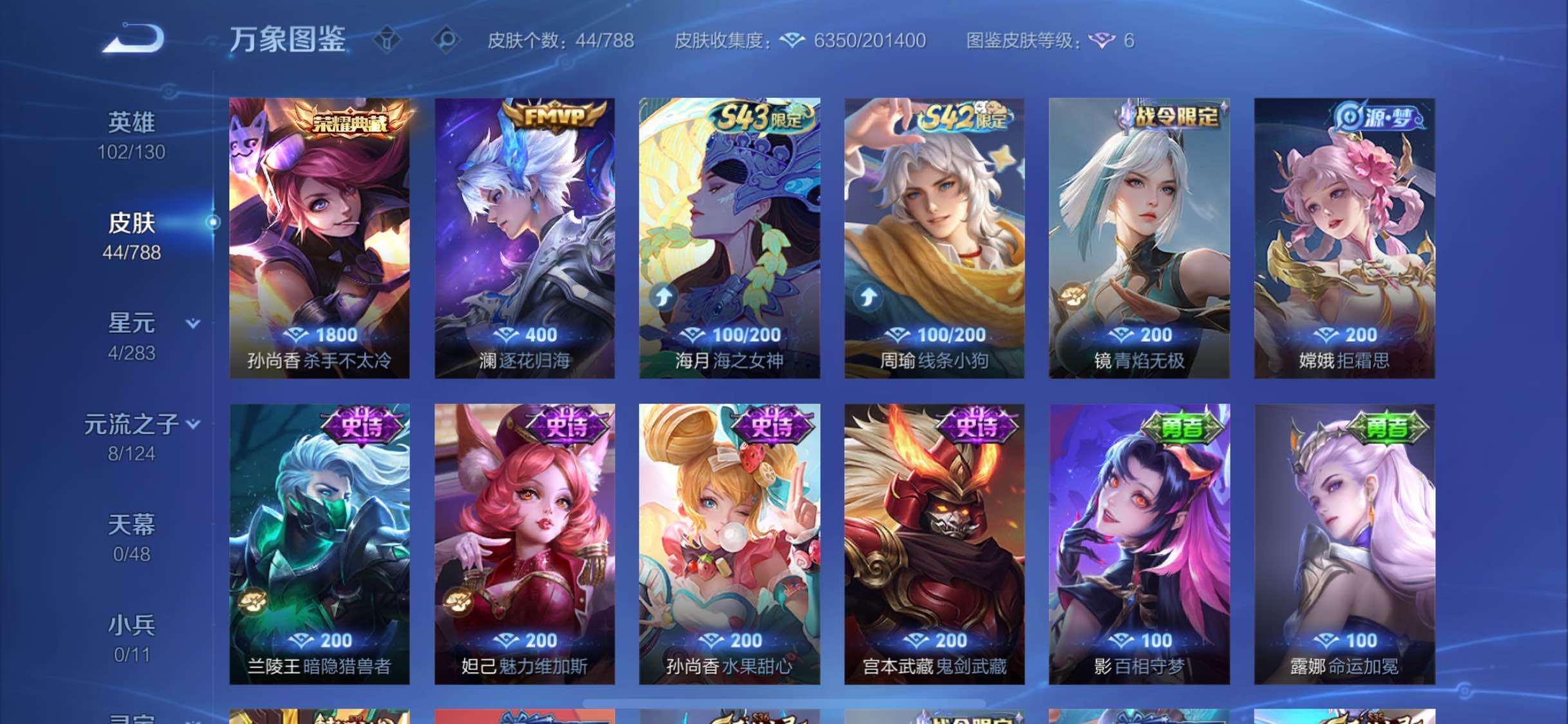 【史诗皮肤】:周瑜线条小狗,镜青焰无极,嫦娥拒霜思,狄仁杰鹰眼统帅,兰陵王暗隐猎兽者,妲己魅力维加斯,孙尚香水果甜心,宫本武藏鬼剑武藏