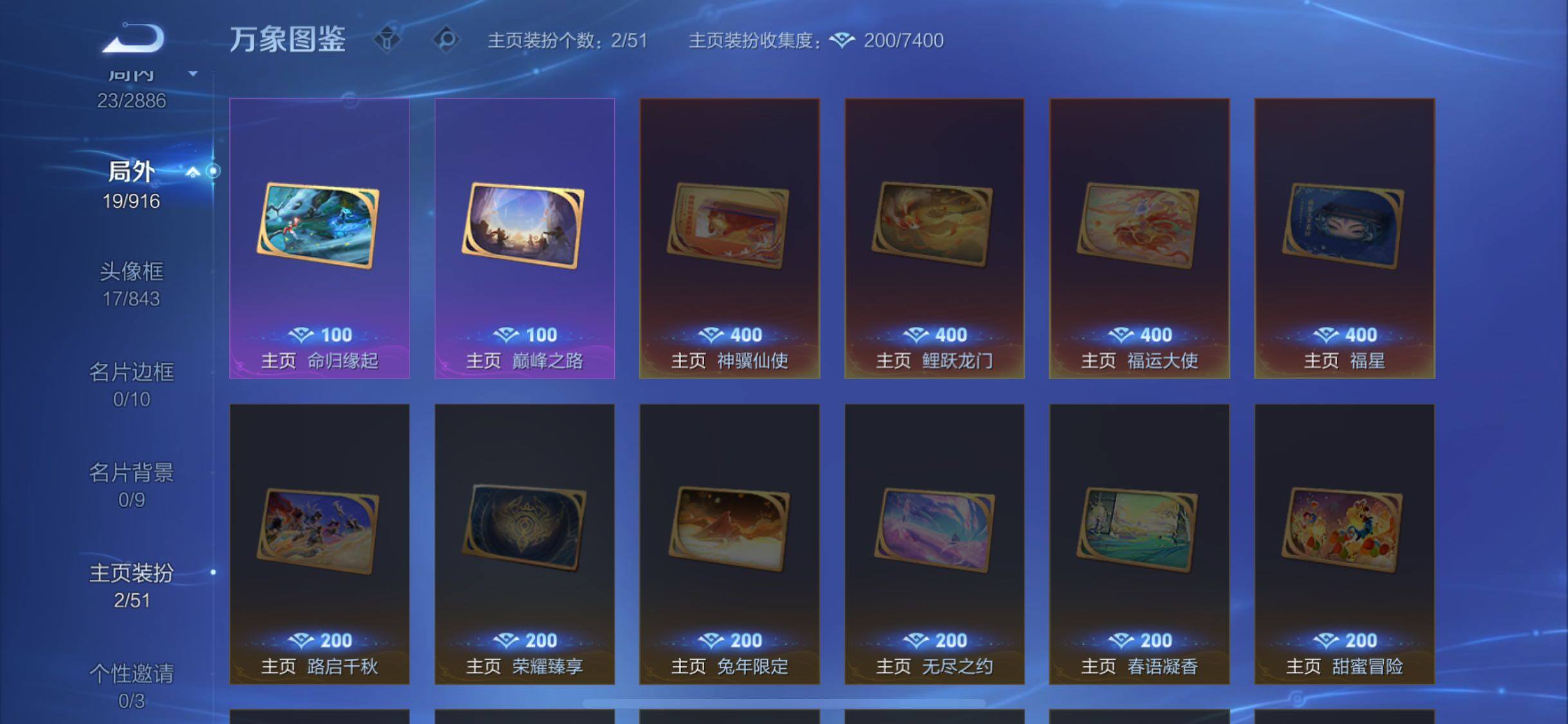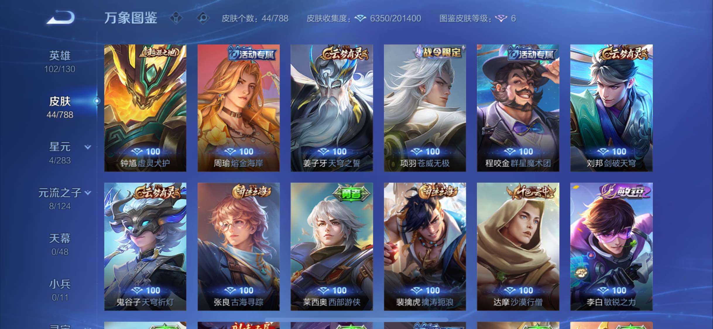 【限定皮肤】:姜子牙天穹之誓,达摩沙漠行僧,裴擒虎擒涛扼浪,嫦娥拒霜思,张良古海寻踪,鬼谷子天穹祈灯,刘邦剑破天穹,程咬金群星魔术团,镜青焰无极,项羽苍威无极,周瑜熔金海岸