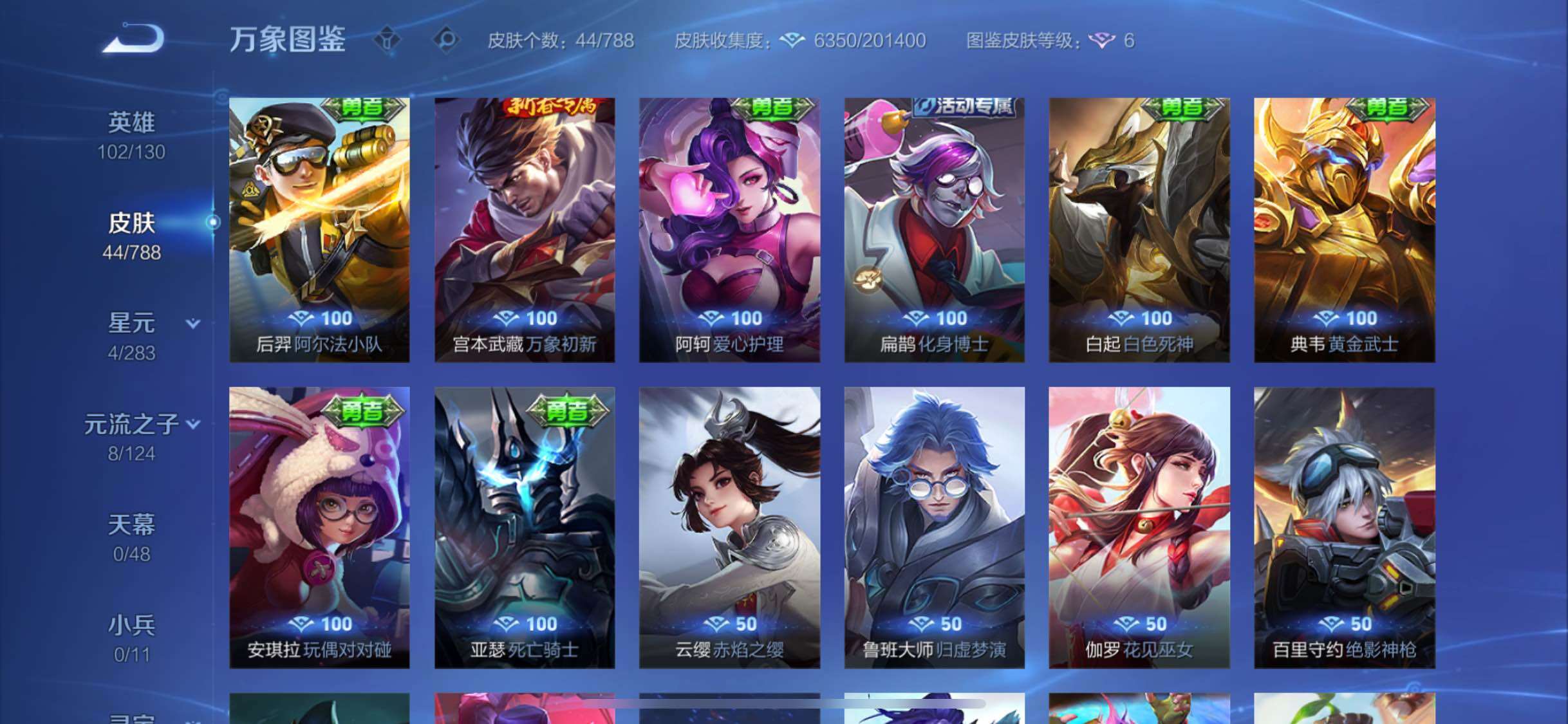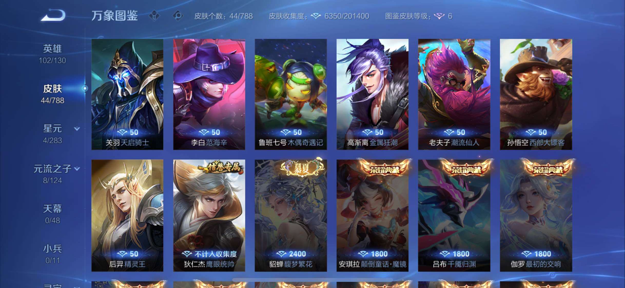 【其他皮肤】:影百相守梦,露娜命运加冕,钟馗虚灵犬护,周瑜熔金海岸,姜子牙天穹之誓,项羽苍威无极,程咬金群星魔术团,刘邦剑破天穹,鬼谷子天穹祈灯,张良古海寻踪,莱西奥西部游侠,裴擒虎擒涛扼浪,达摩沙漠行僧,李白敏锐之力,后羿阿尔法小队,宫本武藏万象初新,亚瑟死亡骑士,典韦黄金武士,安琪拉玩偶对对碰,扁鹊化身博士,白起白色死神,阿轲爱心护理,云缨赤焰之缨,鲁班大师归虚梦演,伽罗花见巫女,百里守约绝影神枪,关羽天启骑士,李白范海辛,后羿精灵王,孙悟空西部大镖客,老夫子潮流仙人,高渐离金属狂潮,鲁班七号木偶奇遇记