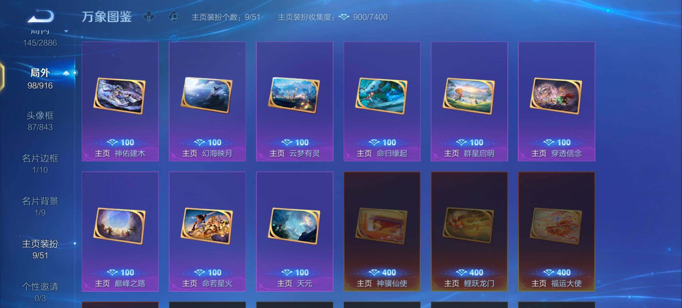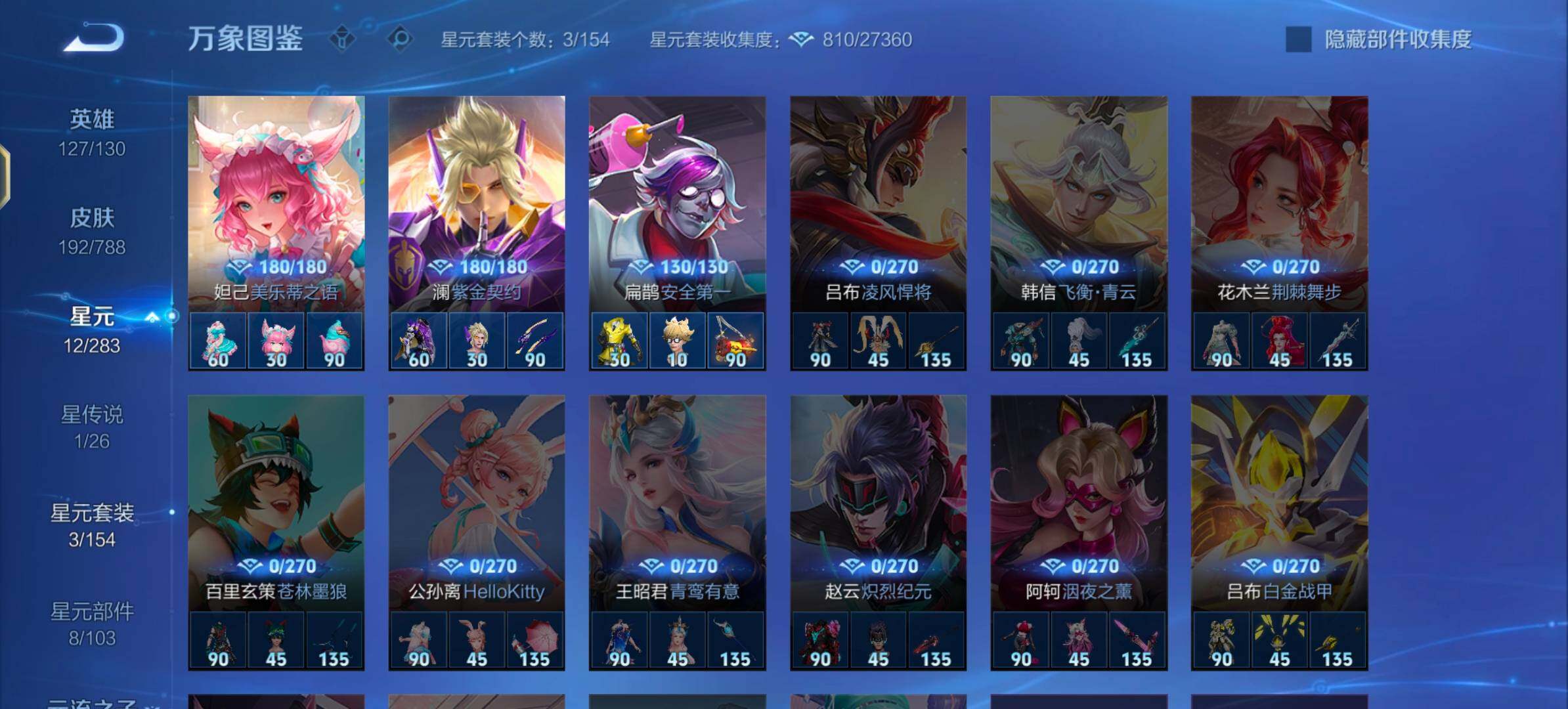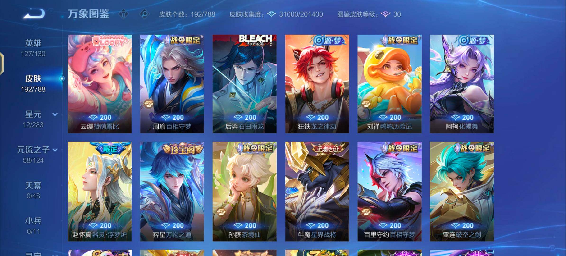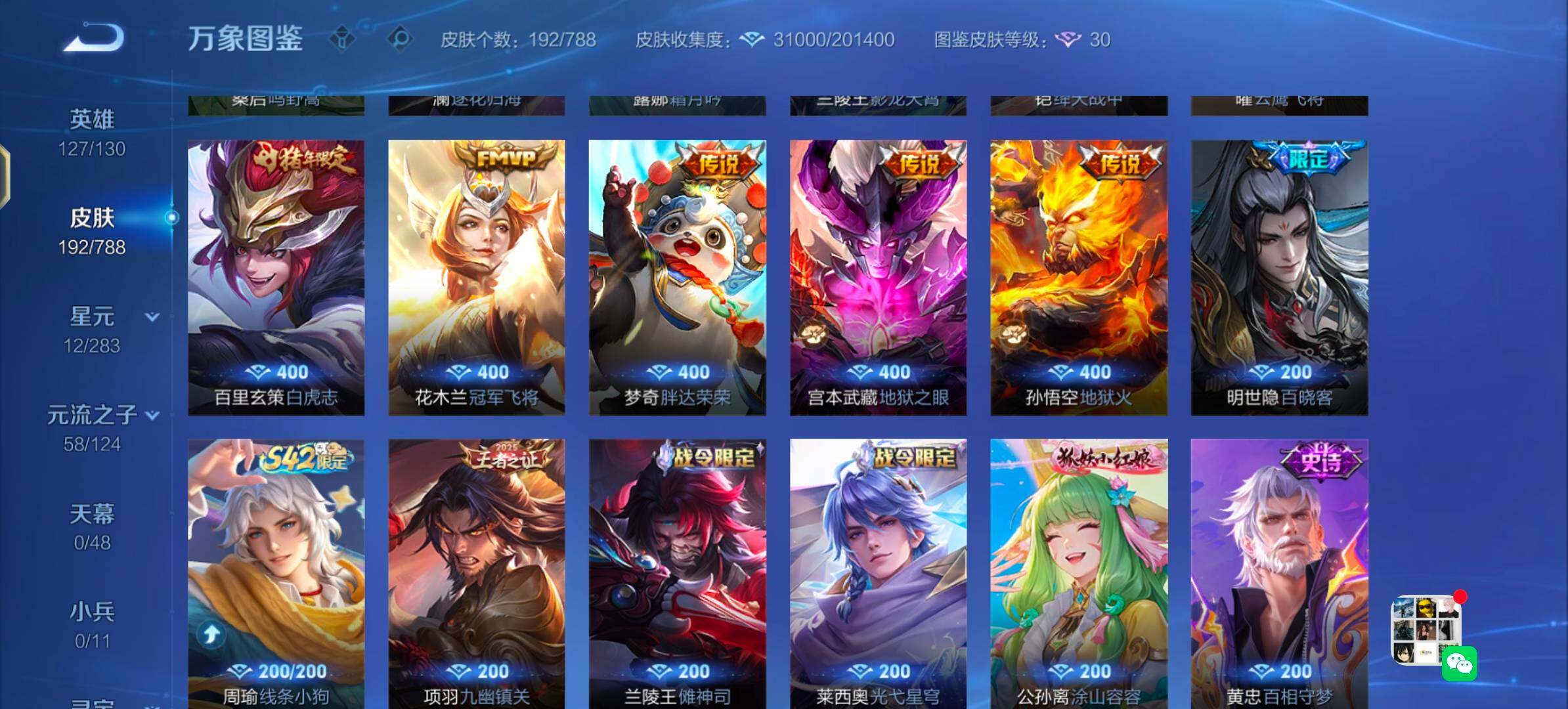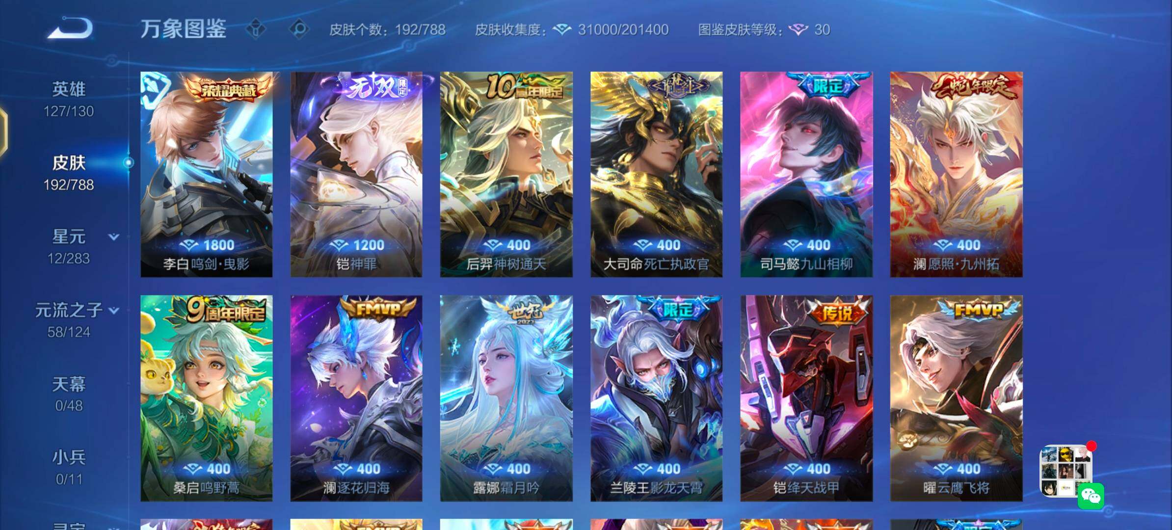 【史诗皮肤】:明世隐百晓客,周瑜线条小狗,项羽九幽镇关,兰陵王傩神司,莱西奥光弋星穹,公孙离涂山容容,黄忠百相守梦,云缨赞萌露比,周瑜百相守梦,后羿石田雨龙,狂铁龙之律动,刘禅鸭鸭历险记,阿轲化蝶舞,赵怀真器灵浮梦炉,弈星万物之道,孙膑茶境仙,牛魔星界战将,百里守约百相守梦,亚连破空之剑,阿古朵江河有灵,梦奇顽趣,梦奇天降福星,鬼谷子五谷丰年,澜赏金猎手,钟馗乐园奇幻夜,杨戬天秀启明,米莱狄胡桃异想国,元歌云间偶戏,裴擒虎李小龙,百里玄策原初追逐者,蒙犽狂想玩偶喵,小乔青蛇,娜可露露晚萤,狄仁杰鹰眼统帅,大乔猫狗日记,孙策猫狗日记,白起星夜王子,李元芳逐浪之夏,刘禅天才门将,铠曙光守护者,百里守约特工魅影,雅典娜冰冠公主,兰陵王暗隐猎兽者,夏侯惇乘风破浪,刘邦德古拉伯爵,花木兰水晶猎龙者,孙悟空至尊宝,吕布末日机甲,曹操幽灵船长,妲己女仆咖啡,妲己魅力维加斯,嬴政摇滚巨星,孙尚香水果甜心,宫本武藏鬼剑武藏,狄仁杰魔术师,王昭君偶像歌手,甄姬冰雪圆舞曲,赵云未来纪元,赵云皇家上将