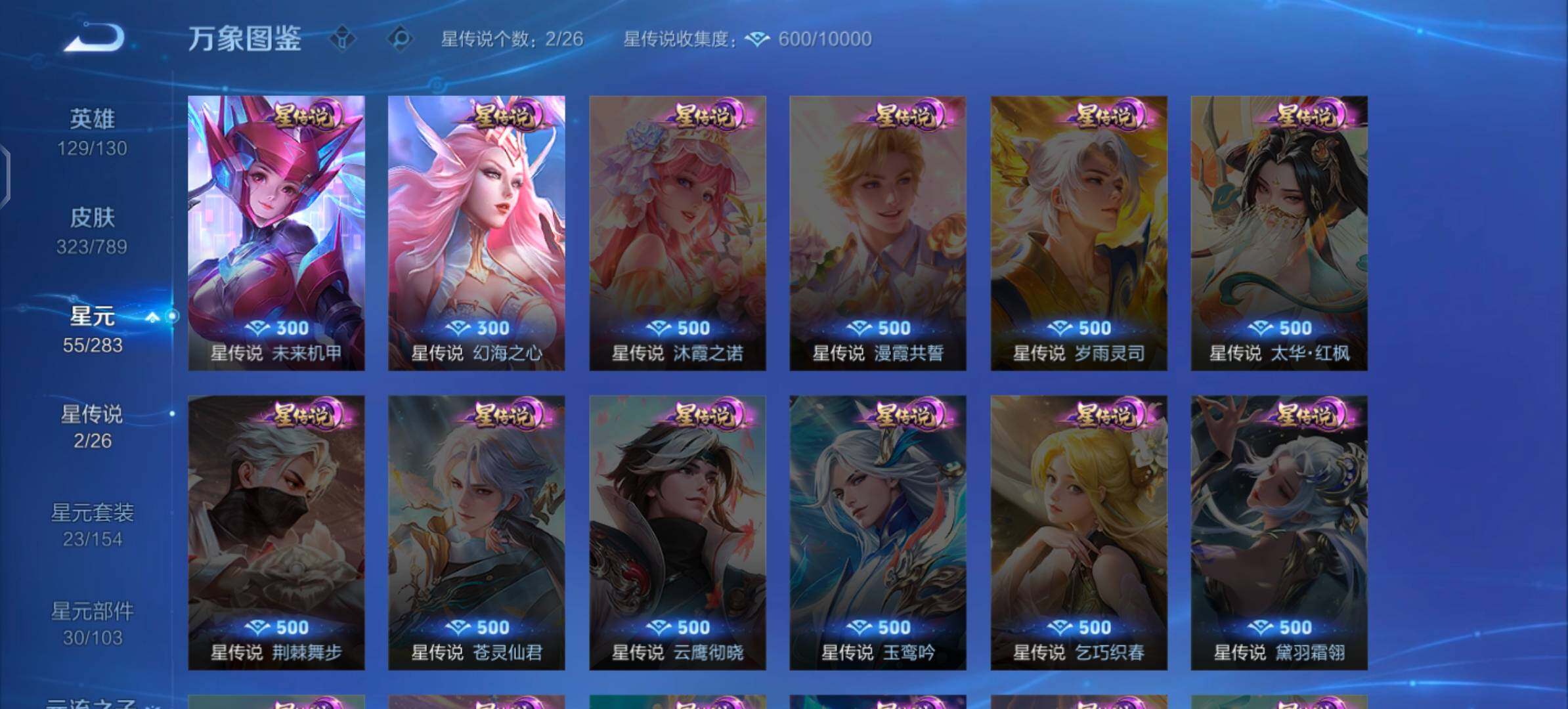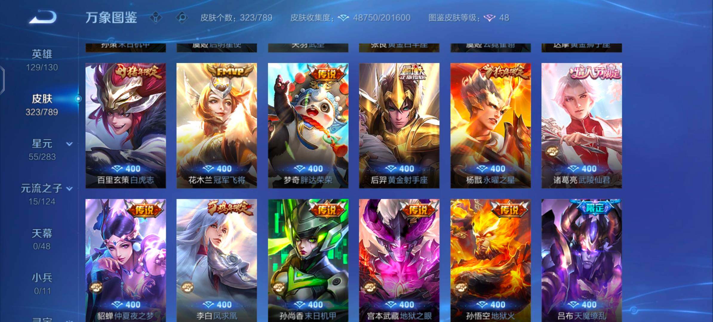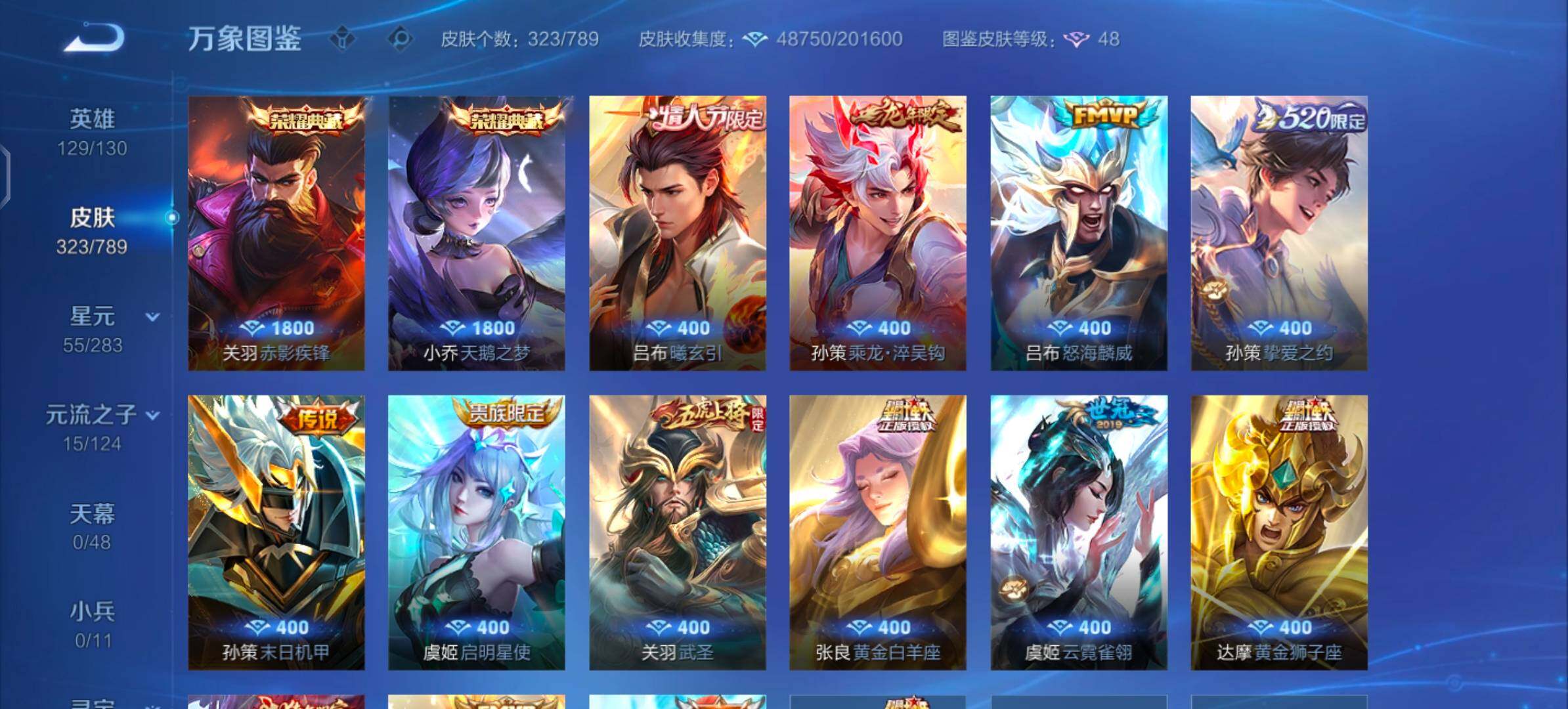 【传说皮肤】:吕布曦玄引,孙策乘龙淬吴钩,吕布怒海麟威,孙策挚爱之约,孙策末日机甲,虞姬启明星使,关羽武圣,张良黄金白羊座,虞姬云霓雀翎,达摩黄金狮子座,百里玄策白虎志,花木兰冠军飞将,梦奇胖达荣荣,后羿黄金射手座,杨戬永曜之星,诸葛亮武陵仙君,貂蝉仲夏夜之梦,李白凤求凰,孙尚香末日机甲,宫本武藏地狱之眼,孙悟空地狱火,吕布天魔缭乱,武则天海洋之心,狄仁杰超时空战士